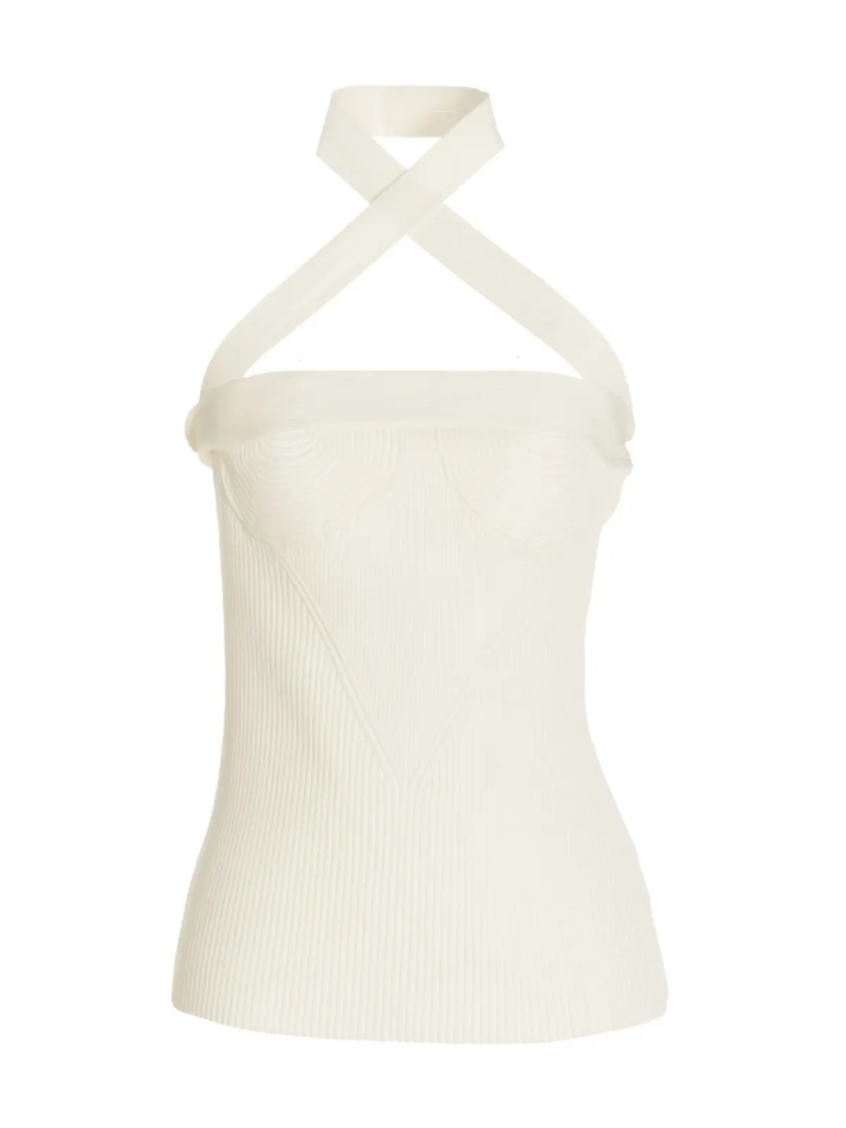 Асиметричний топ з вязанням на одне плече від Proenza Schouler. Виготовлений з білого ребристого трикотажу з асиметричною плечовою стрічкою. Склад: 77% віскоза, 23% поліамід.