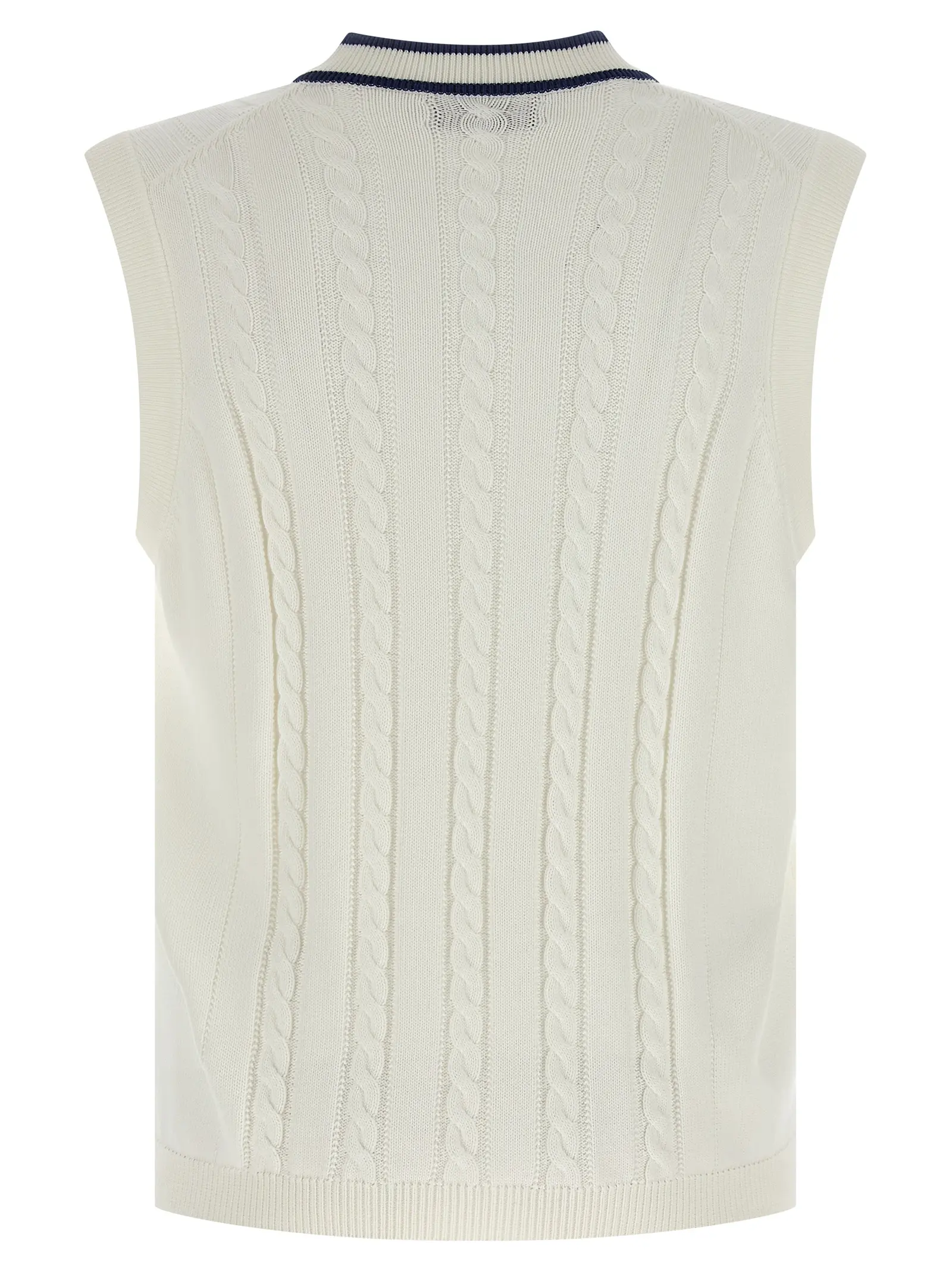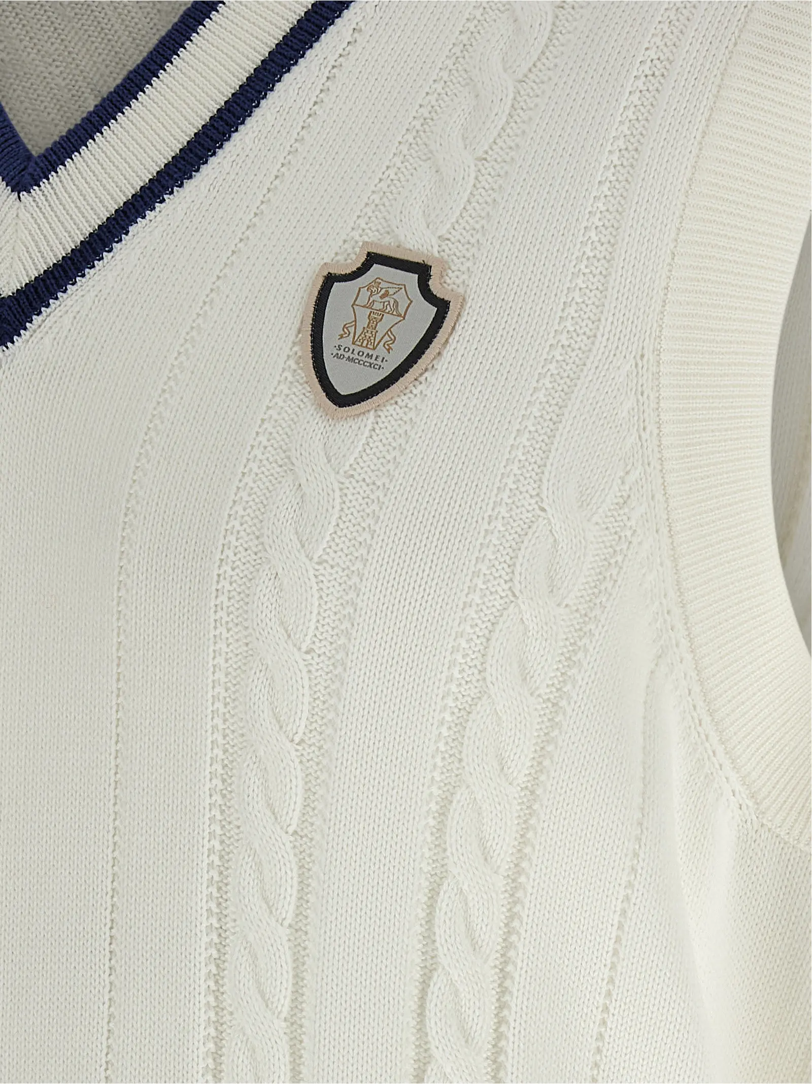 Фактурне плетення з чистої бавовни створює особливий об’єм і приємну тактильну глибину. Геометрія V-подібного вирізу ефектно підсилена контрастним оздобленням країв, додаючи силуету графічної чіткості. Естетика виробу розкривається через деталізовану нашивку-герб, яка перетворює лаконічний трикотаж на виразний маніфест високого стилю.