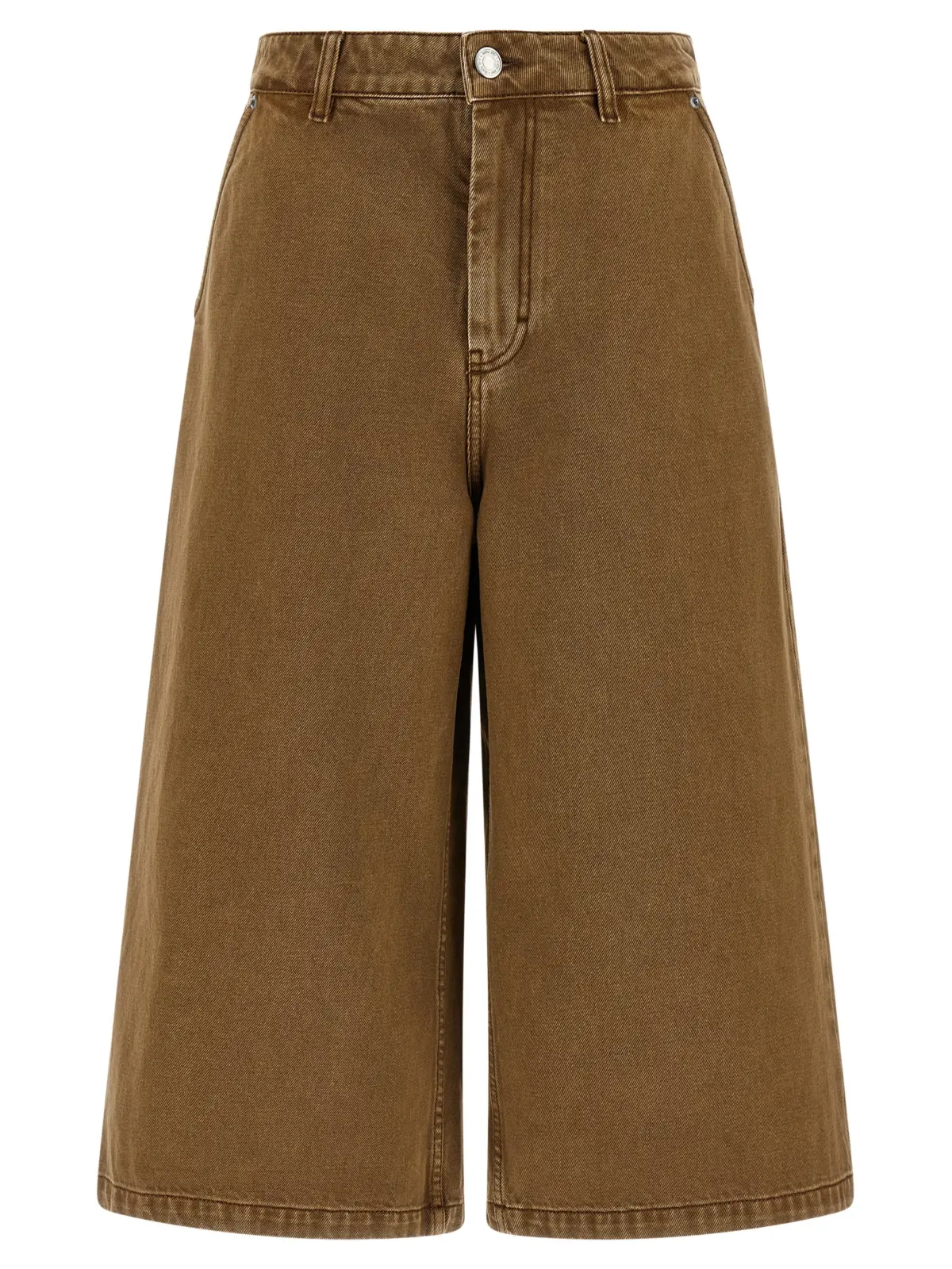 Коричневі джинсові бермуди з гармент-дайєного бавовняного деніму поєднують у собі бездоганну якість та інноваційний дизайн із вільним широким кроєм, що підкреслює стиль і комфорт. Елегантна застібка на блискавку та ґудзик, п’ять функціональних кишень і регульований ремінець на спині забезпечують універсальність і практичність, надаючи виробу статусу неперевершеного fashion-аксесуара.