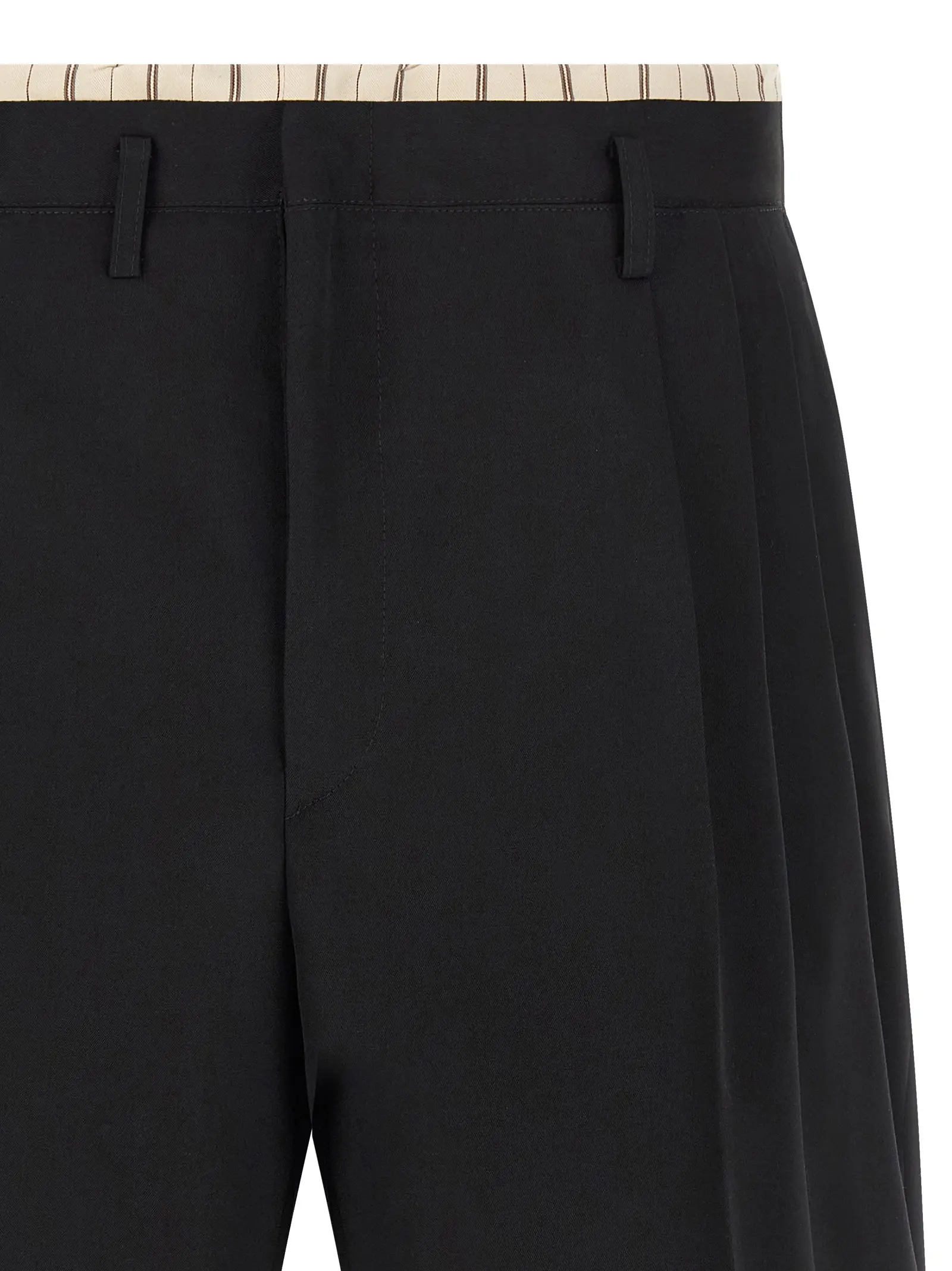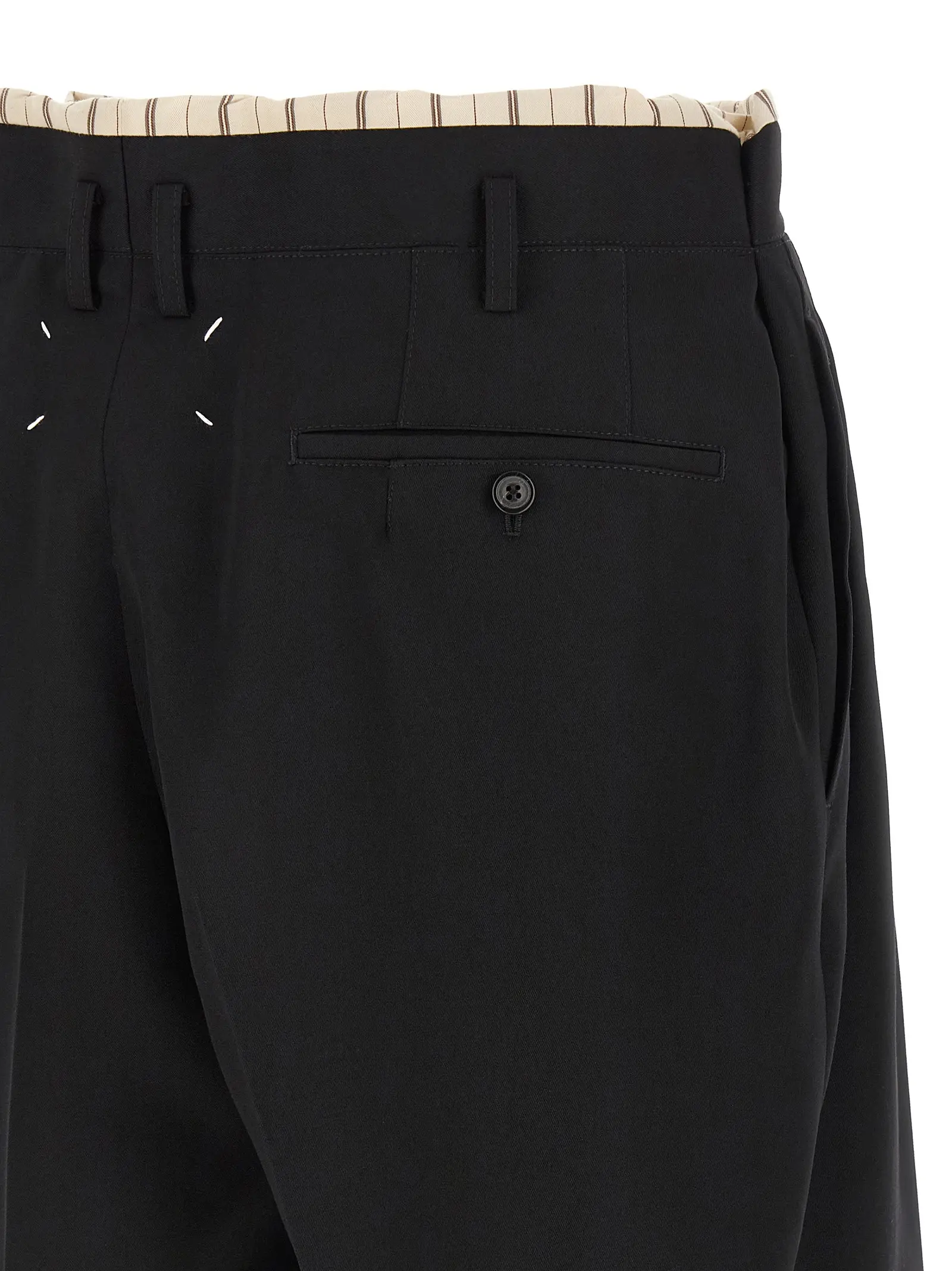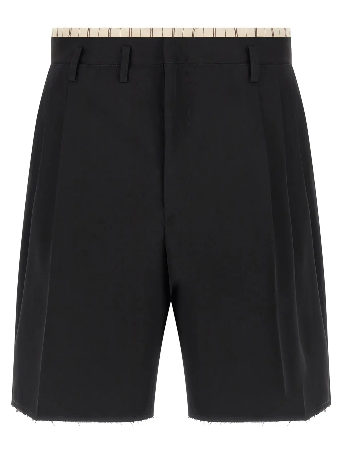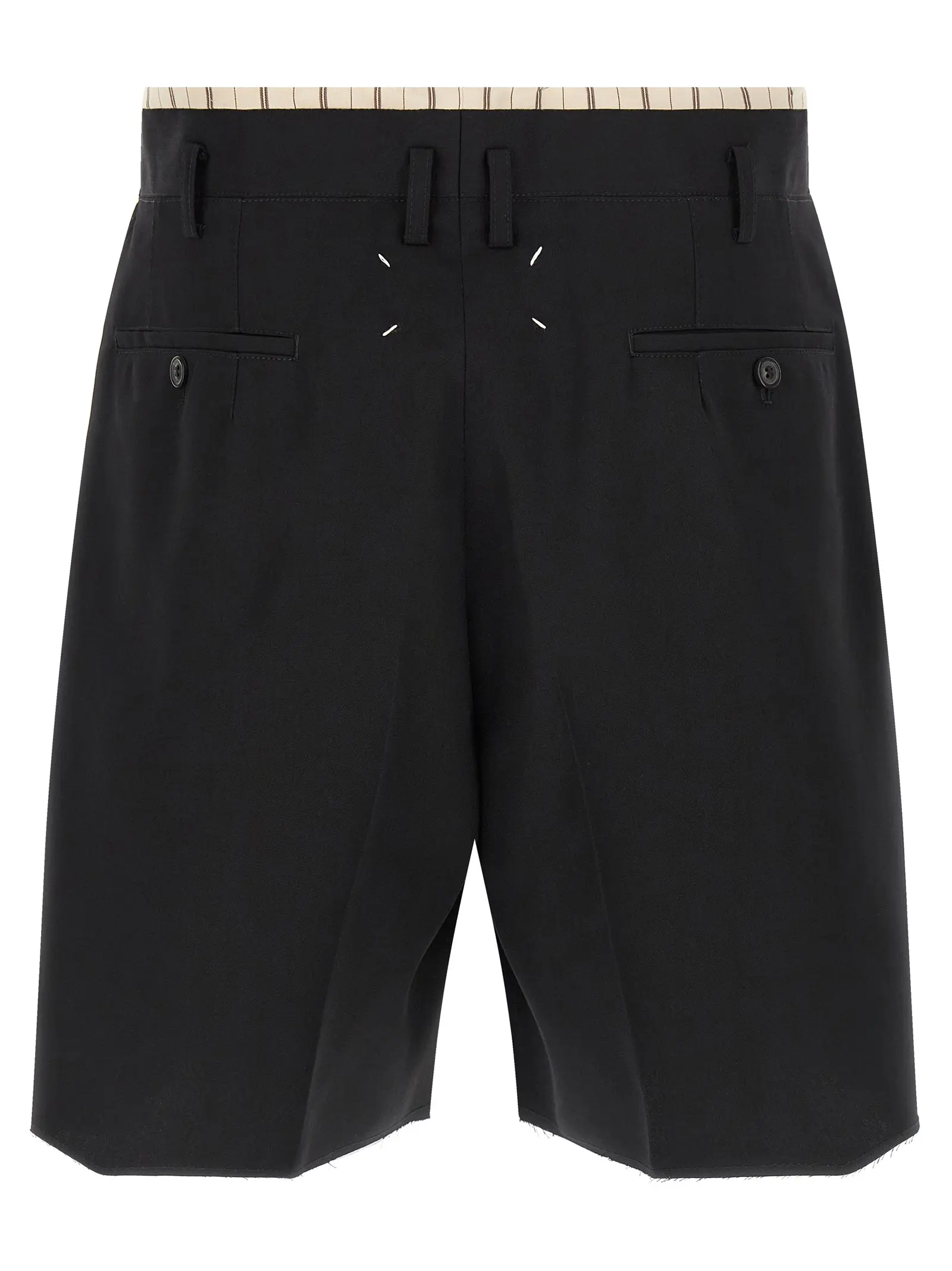 Чоловічі чорні бермуди Maison Margiela виготовлені зі 100% вовни та вирізняються видимою смугастою підкладкою на поясі, складками-защипами й фірмовими стібками «Four Stitches». Дизайн доповнено необробленим краєм штанин, зручними кишенями та надійною застібкою на гачок із блискавкою.