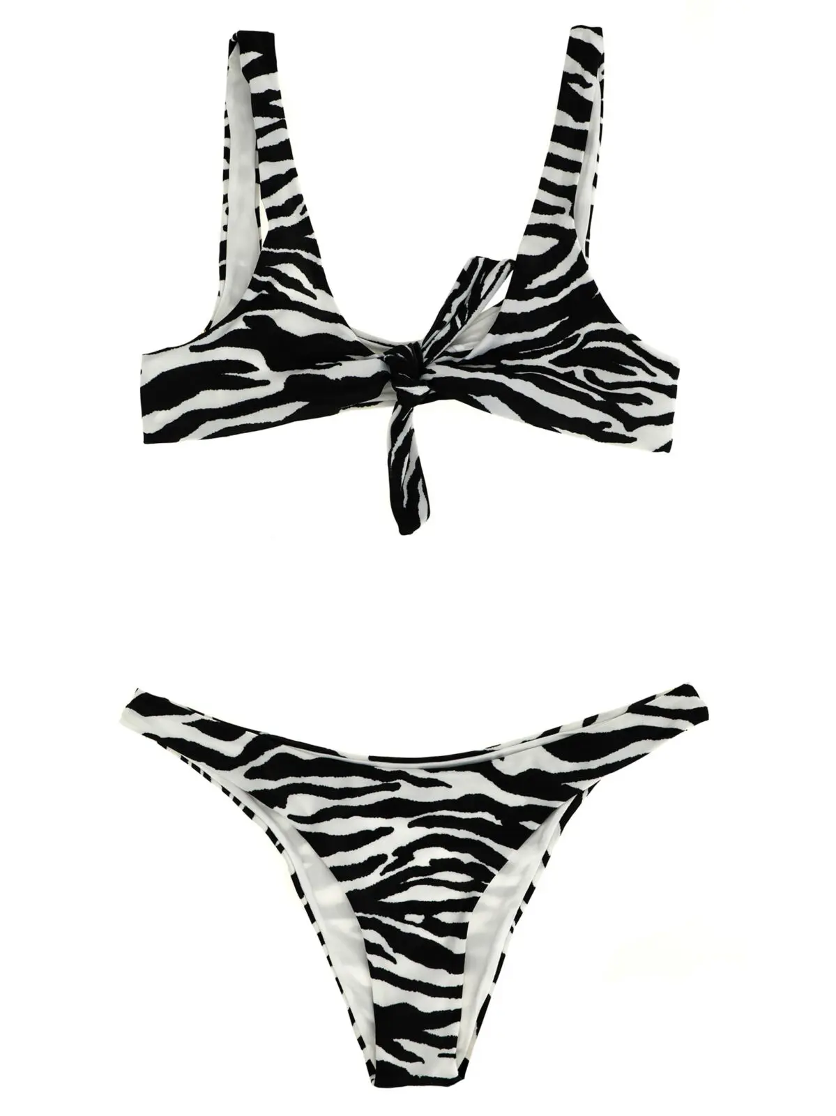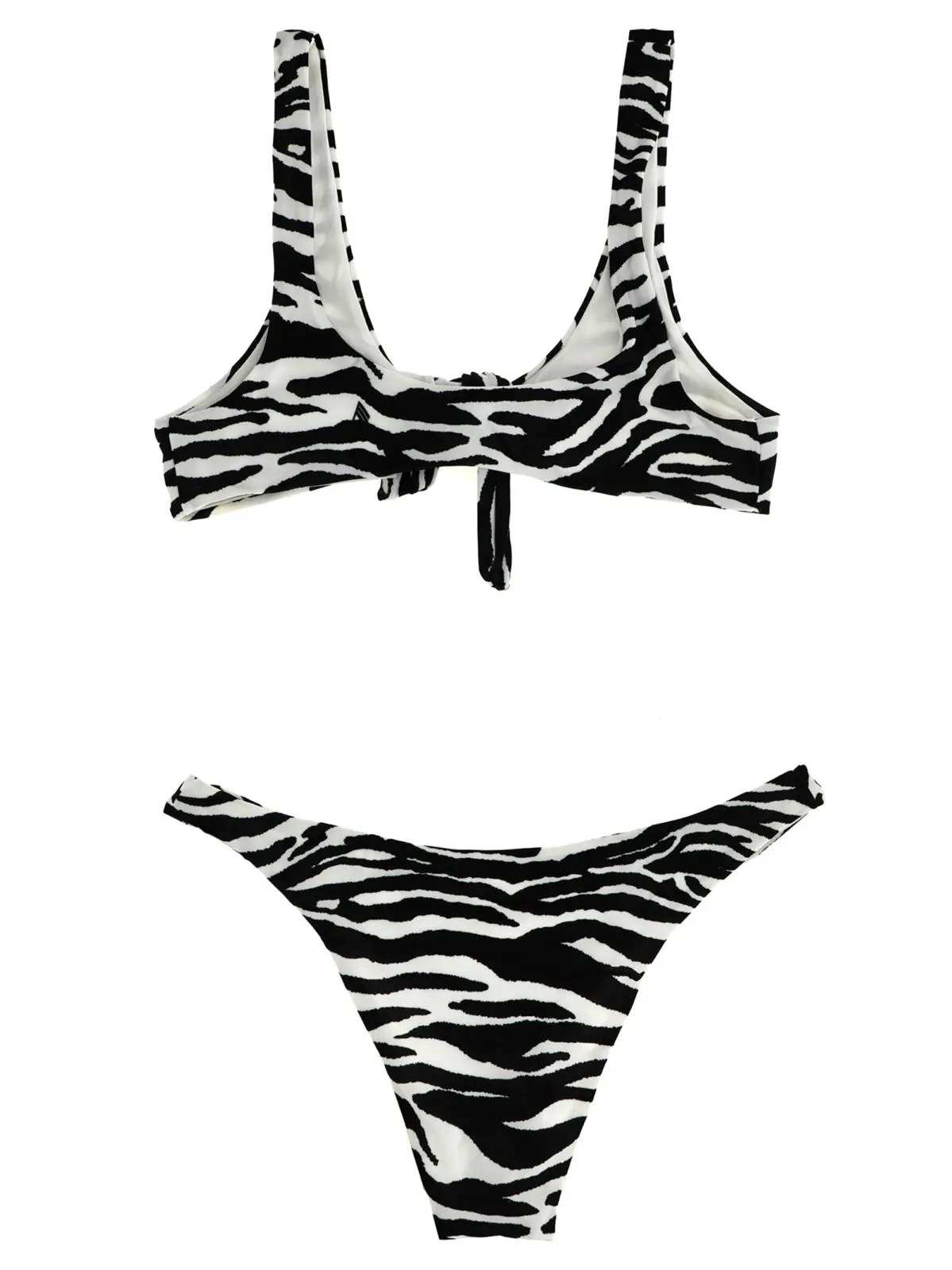 Цей чорнобілий бікіні з принтом анімалієр виготовлений з високоякісного лайкрового матеріалу, що поєднує еластичність і комфорт. Витончений дизайн із трикутним топом і вузлом спереду підкреслює жіночність, а високі плавки додають витонченості, забезпечуючи стильний і універсальний образ преміум рівня.