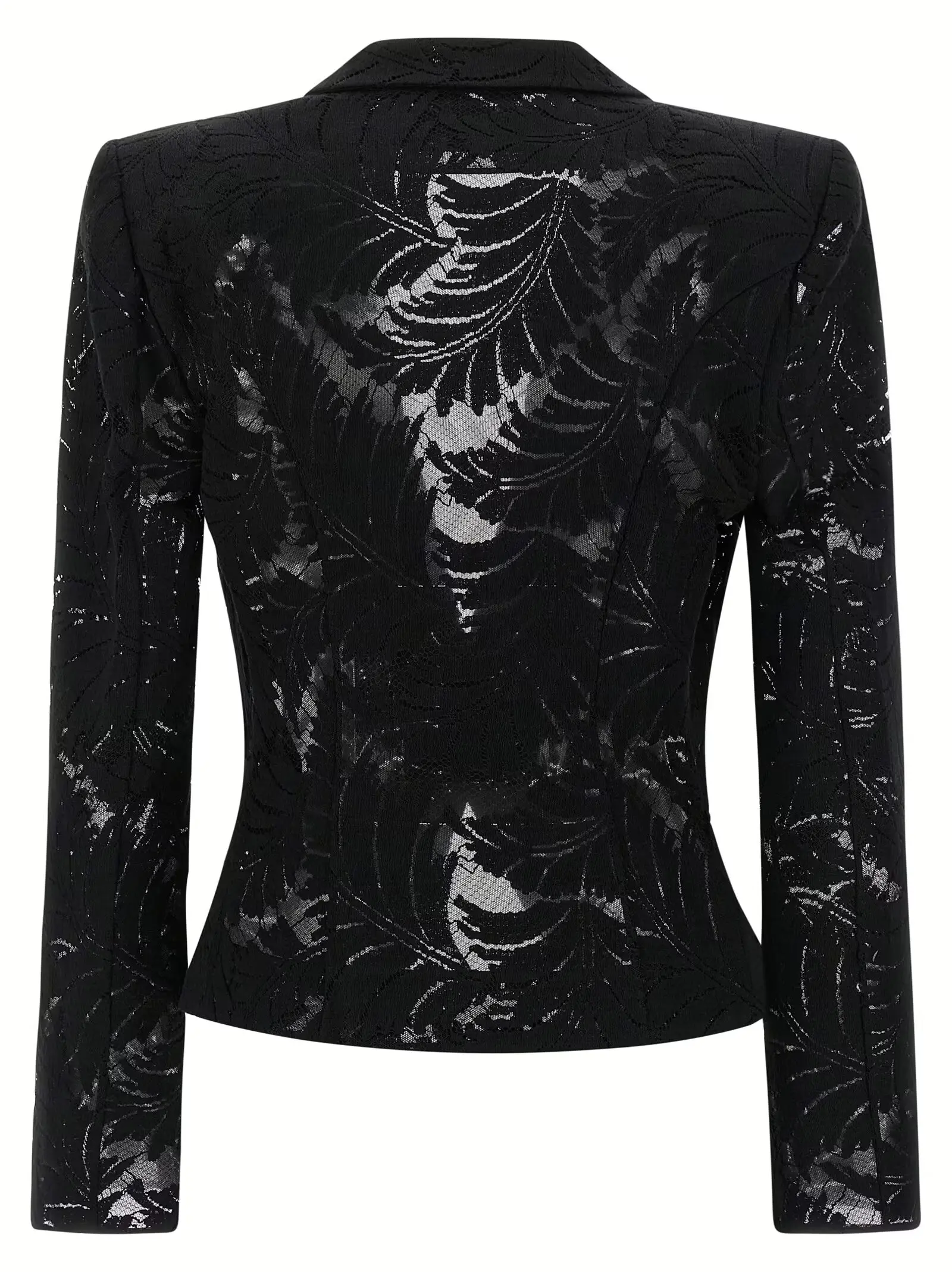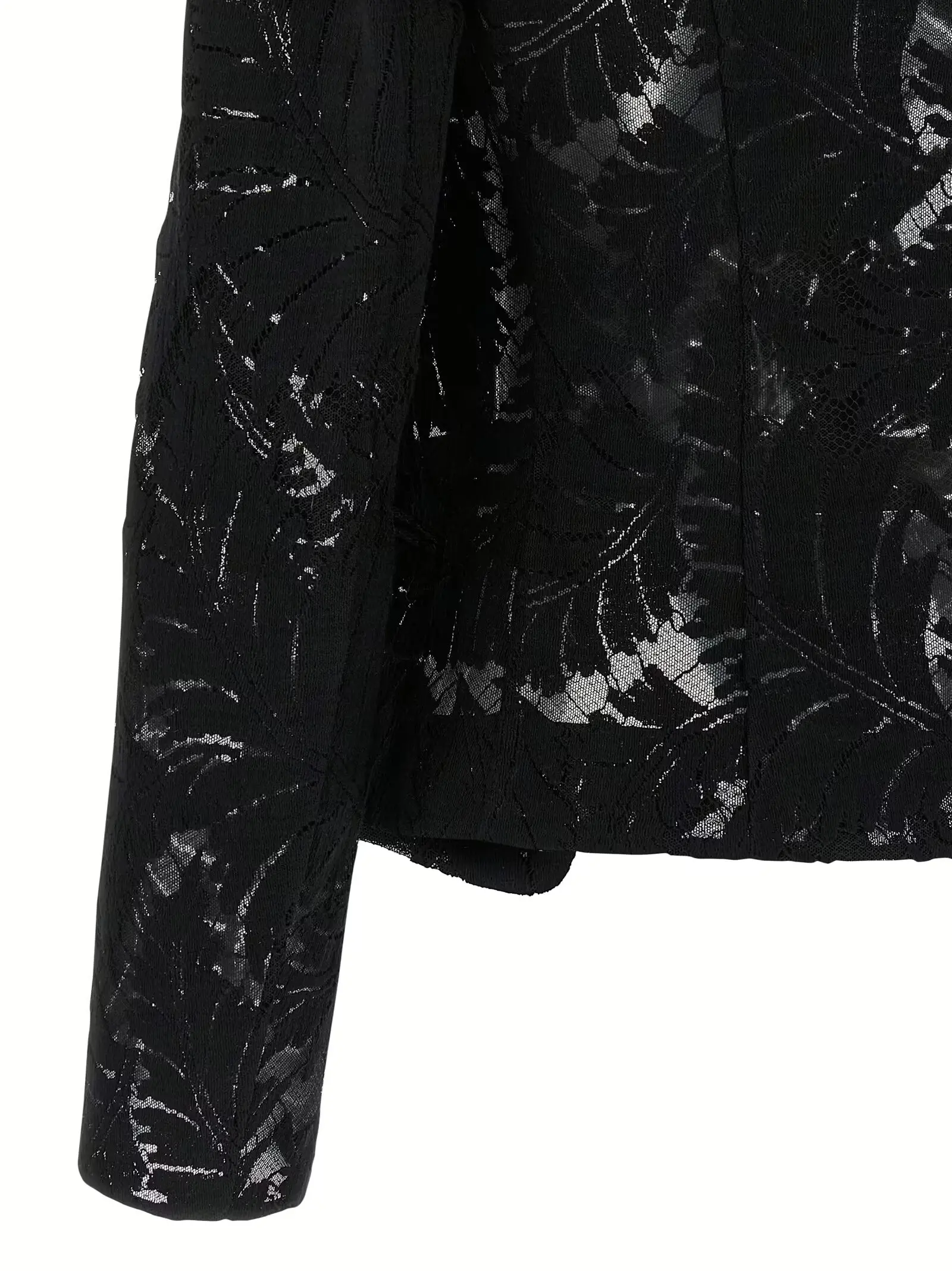Чорний мереживний блейзер з тонким фатиновим підкладом поєднує в собі вишуканість і сучасний дизайн, акцентований металевими гудзиками у вигляді ланцюжка. Виготовлений із високоякісної бавовни з додаванням поліаміду, він підкреслює статус і стиль, забезпечуючи комфорт і універсальність для будь-якого образу.