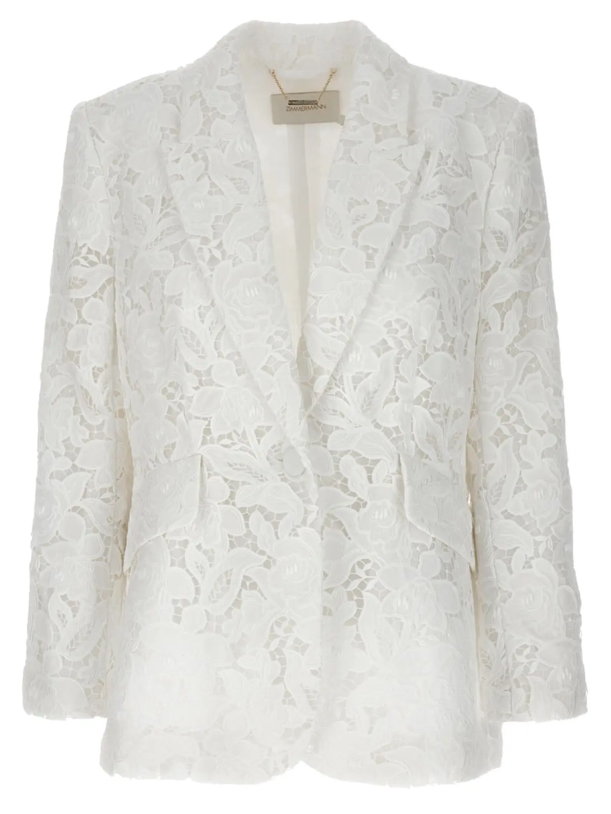 Елегантний однобортний блейзер Natura Lace від Zimmermann виконаний у білому кольорі стане ідеальним доповненням до вашого гардеробу. Цей жіночий блейзер прикрашений мереживною обробкою, що додає йому особливої вишуканості. Модель оснащена зручними кишенями та довгими рукавами, завдяки чому ви почуватиметеся комфортно у будь-якій ситуації. Блейзер застібається на гудзики, що забезпечує легкість у використанні. Виготовлений із 100% поліестеру, він забезпечує відчуття легкості та повітряності при носінні. Його вишуканий дизайн і висока якість матеріалів роблять цей блейзер ідеальним вибором для створення елегантного образу.