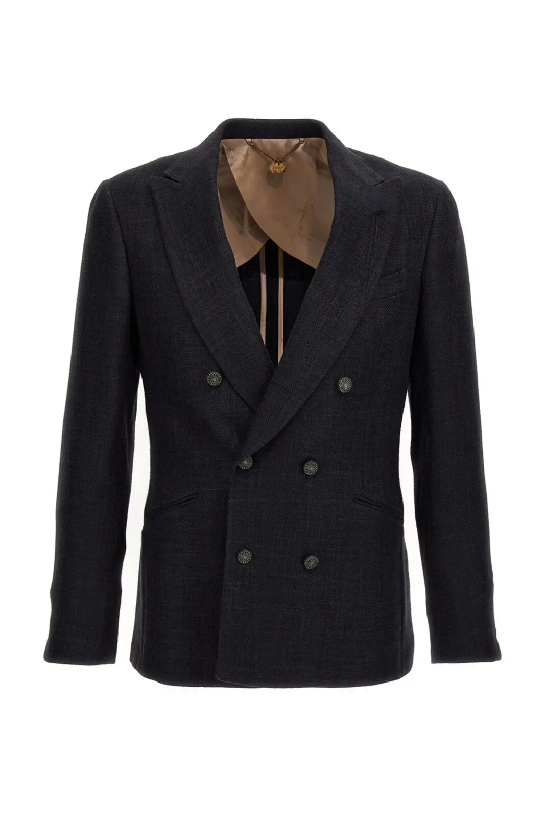Чоловічий блейзер Sam Maurizio Miri в сірому кольорі зроблений зі змішаної льонової тканини. Ця модель має подвійний ряд гудзиків, лацкани в формі копи, кишені, довгі рукави та задні розрізи. Цей блейзер створений для чоловіків, які цінують стиль та комфорт.
