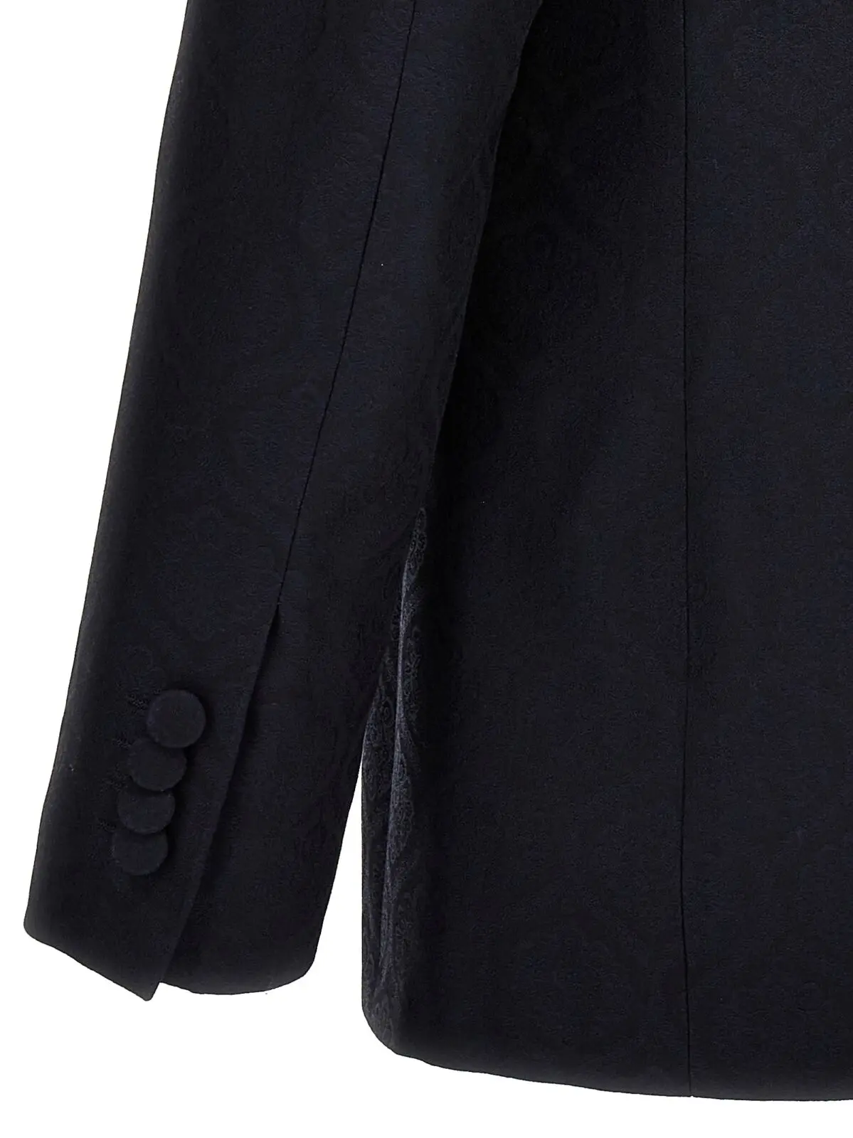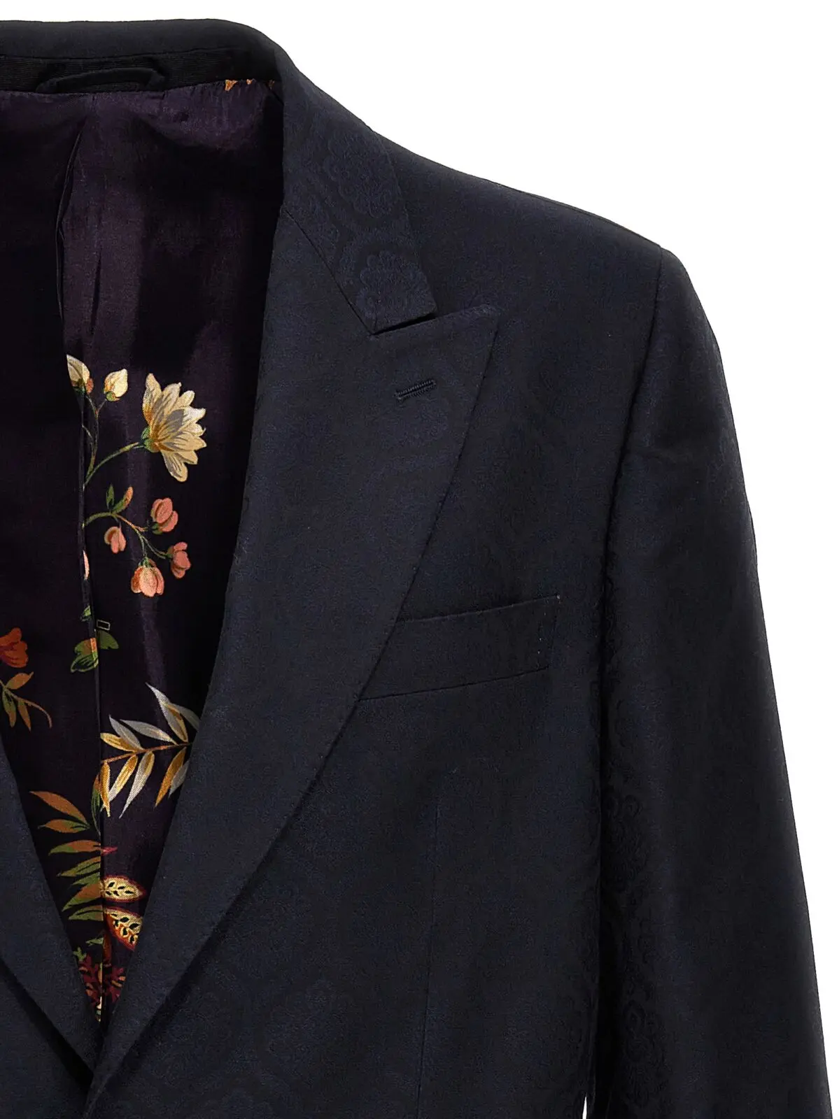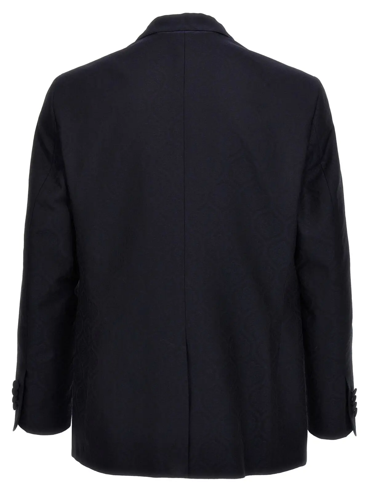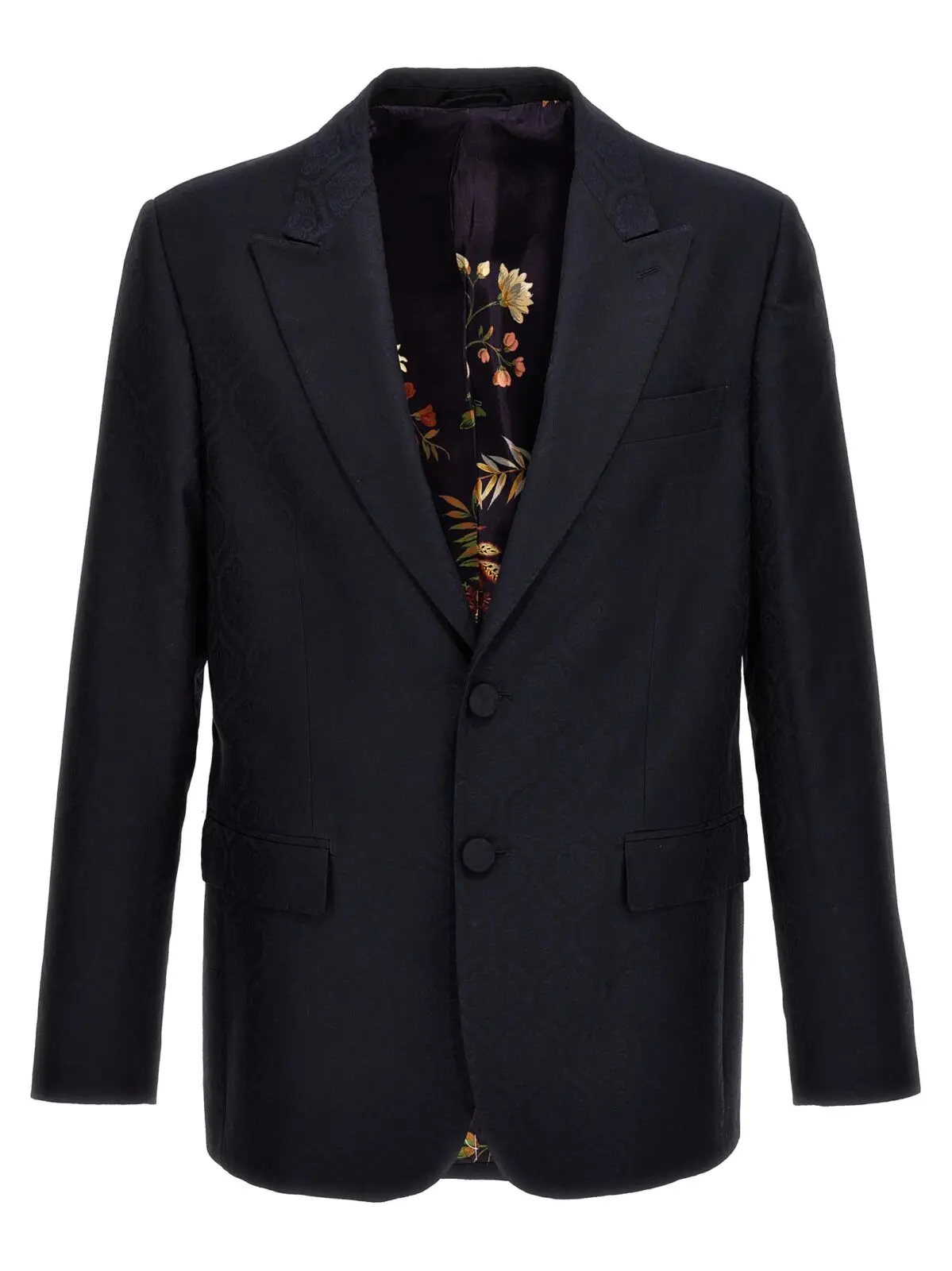 Чоловічий блейзер від Etro з однорядним застібанням на гудзики, виготовлений з джаккардової бавовни та шерсті. Має кишені, структуровані плечові ремені, розріз ззаду та довгі рукава. Склад тканини: 53% бавовна, 47% шерсть.