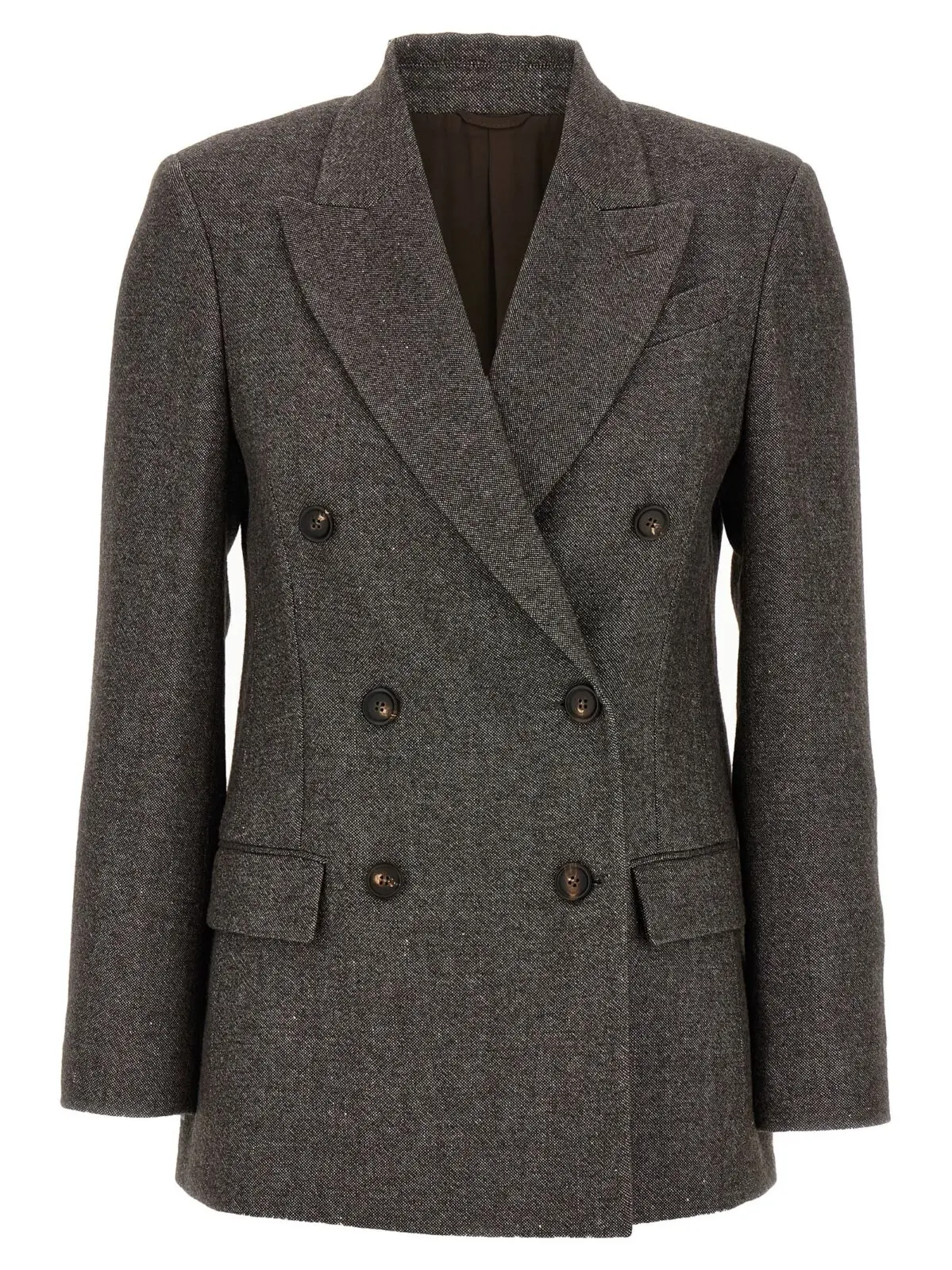 Цей твідовий жіночий блейзер від Brunello Cucinelli поєднує в собі розкішну якість та неперевершений стиль завдяки суміші вовни, льону та поліаміду. Двобортний крій з піковими лацканами, витонченими кишенями та шовковистою підкладкою створює унікальний образ, який підкреслює статус і елегантність у будь-якій ситуації.