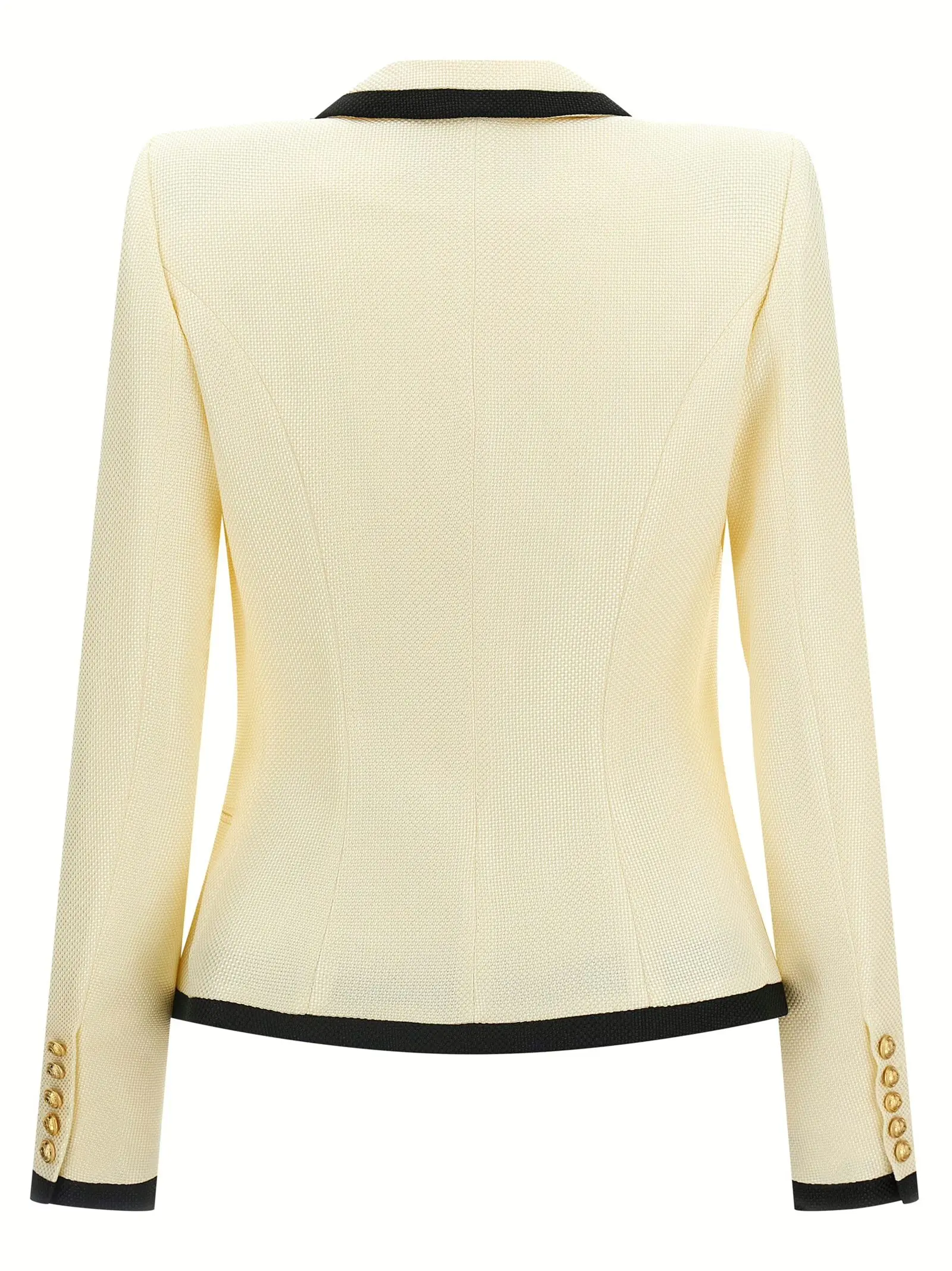 Чорно-білий жіночий блейзер з широкими плечима поєднує у собі вишуканий дизайн із контрастними деталями та декоративними металевими ґудзиками. Виготовлений з високоякісної віскози та бавовни, він вирізняється елегантними лацканами, асиметричним низом і функціональними кишенями, підкреслюючи статус і неперевершений стиль.