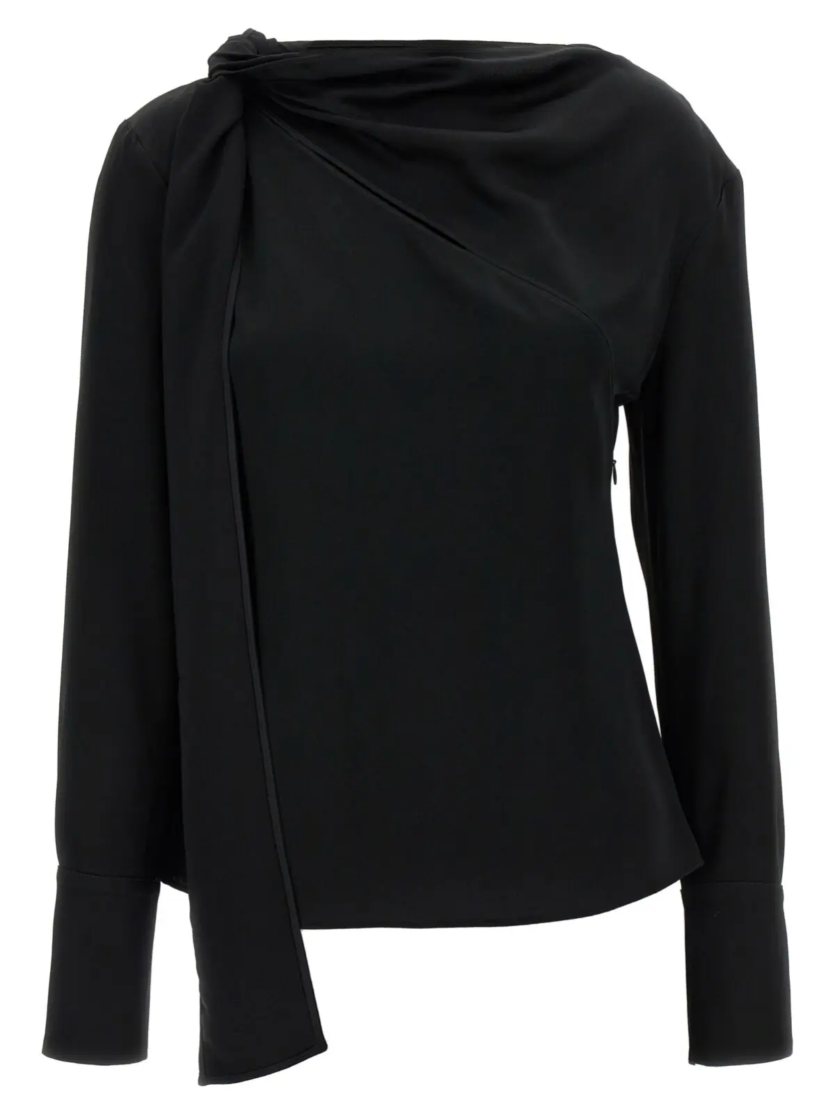 Ця блуза Givenchy вишуканого чорного кольору стане ідеальним доповненням вашого гардеробу. Виготовлена з високоякісного комбінованого матеріалу, що містить 61% віскози та 39% ацетату, вона забезпечує комфорт і елегантність. Зручний регульований пояс на шиї та бічна застібка додають практичності, а довгі рукави з манжетами підкреслюють жіночність силуету. Цей витончений виріб ідеально підходить для будь-якої нагоди, надаючи статусу та стилю.