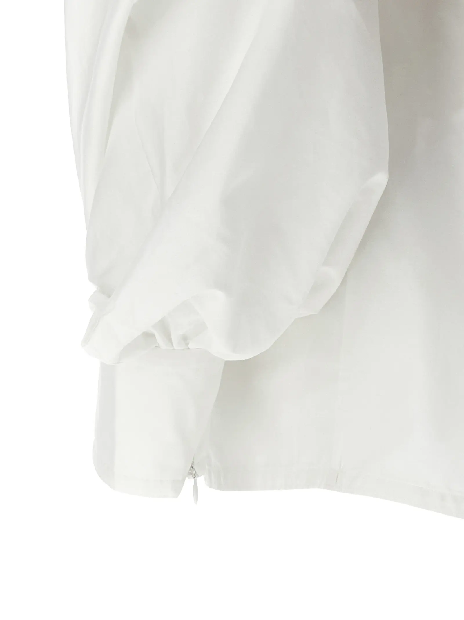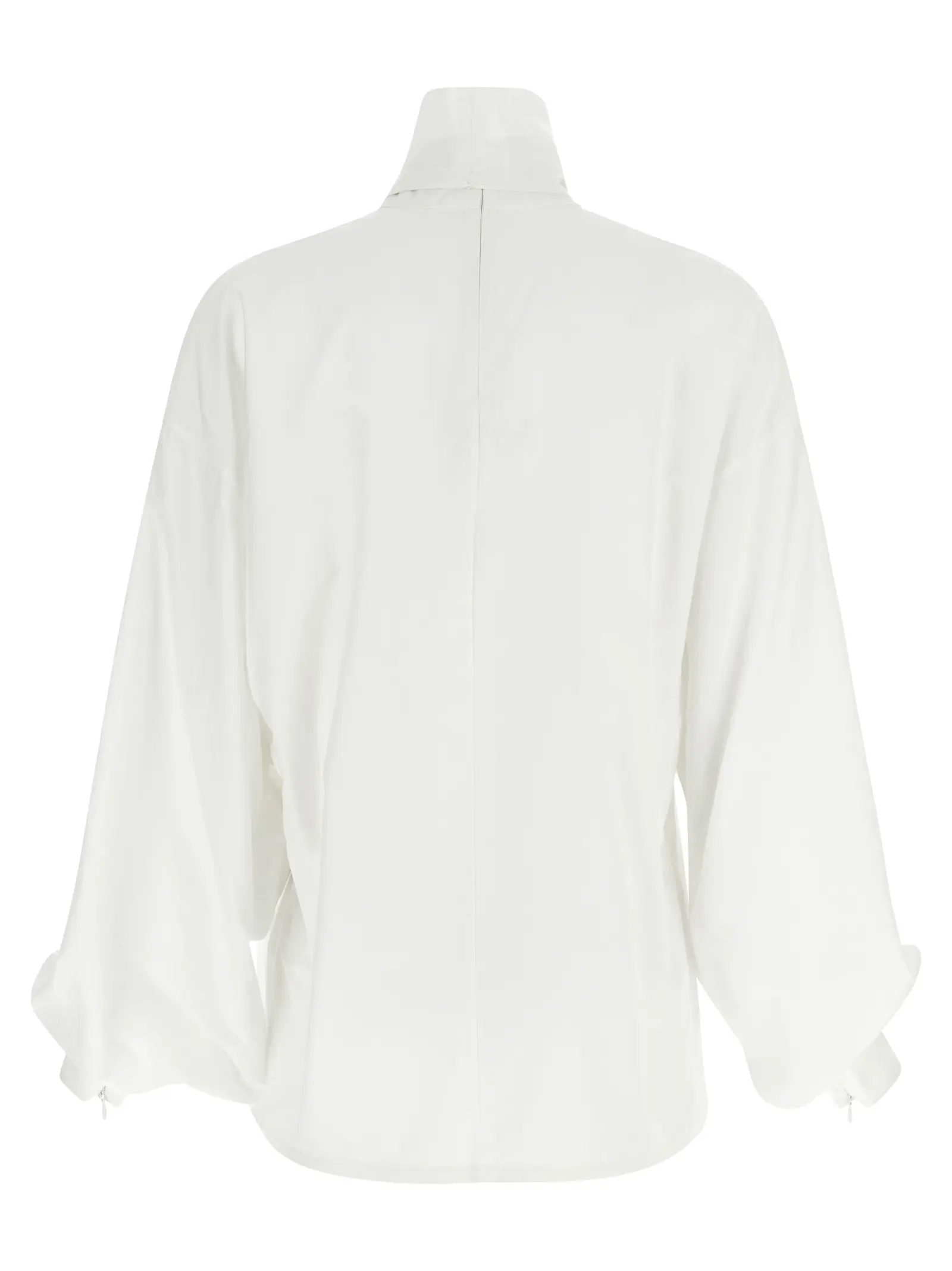 Сорочка виготовлена з бавовни та шовку. Високий комір знімним поясом для зав’язування. Застібка на блискавку ззаду. Довгі об’ємні рукави з манжетами на блискавці. Пройма з опущеним плечем.