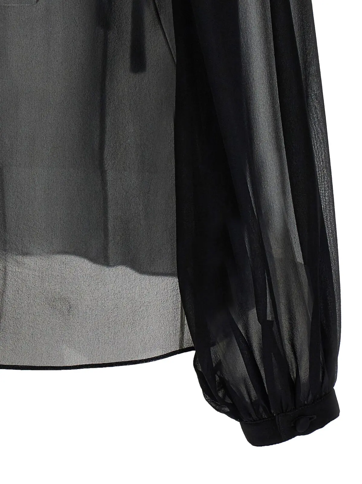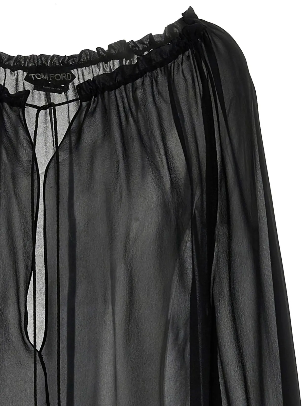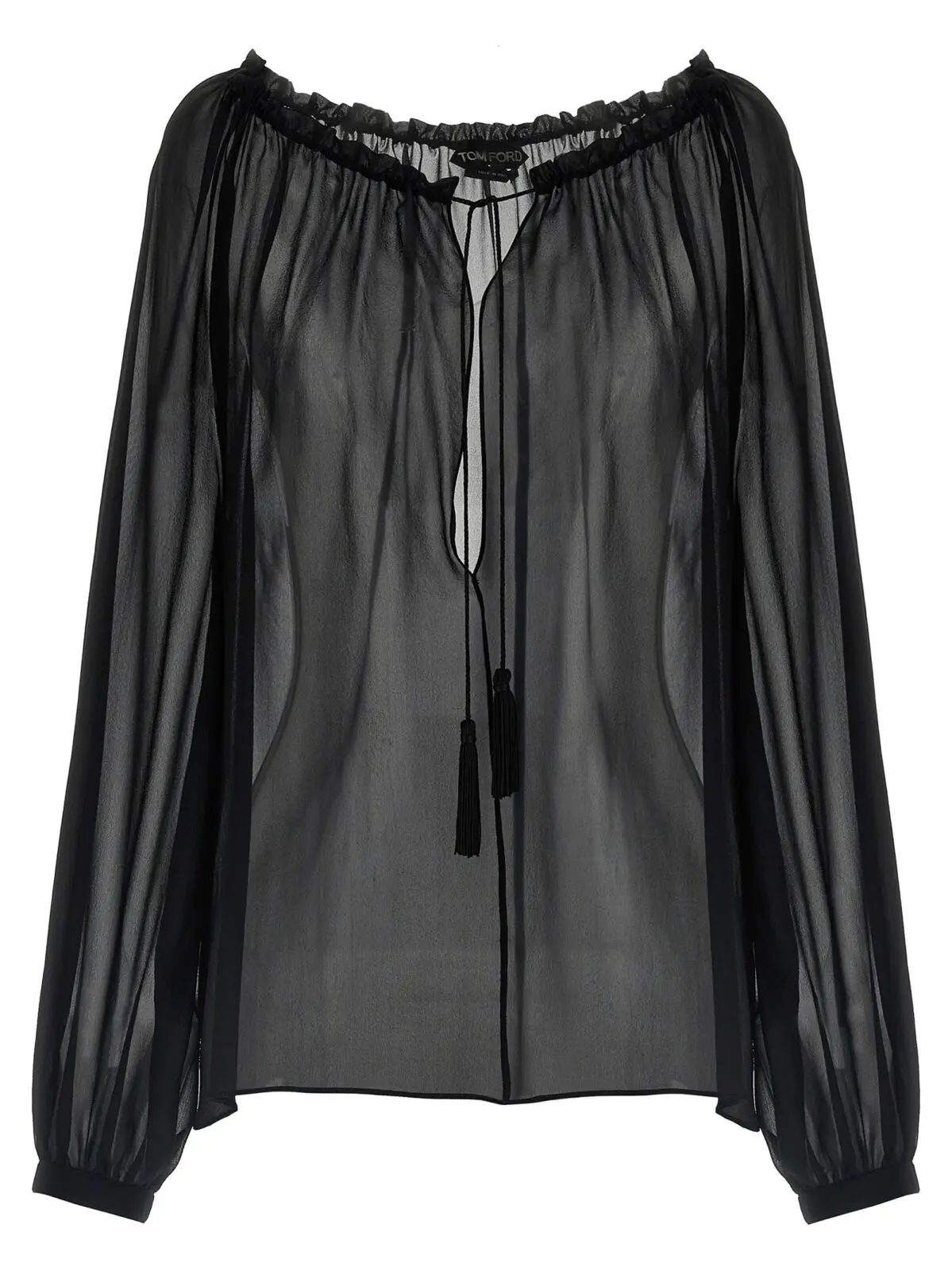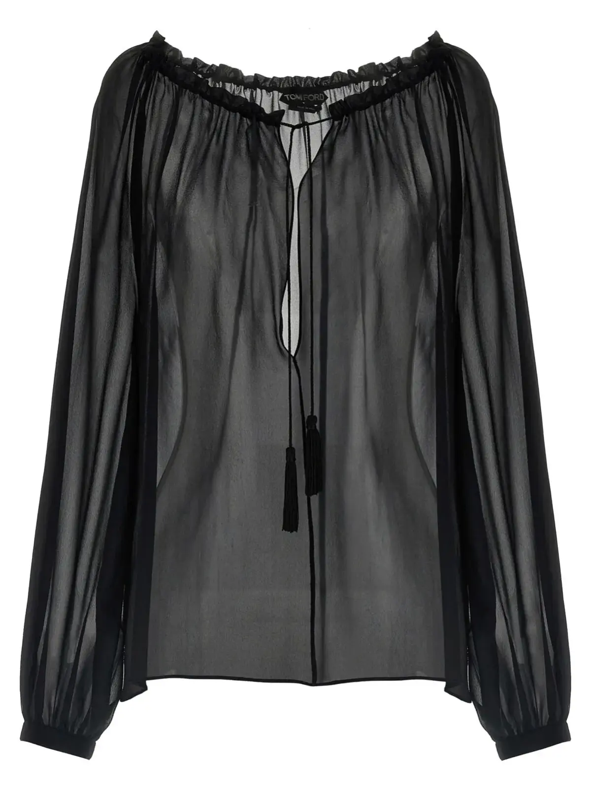 Ця блуза Tom Ford з шовку вражає своєю елегантністю та вишуканістю. Виконана з 100% шовку, вона має V-подібний виріз з регульованим шнурівкою, що дозволяє змінювати форму декольте, а також довгі рукави з манжетами, що додають витонченості. Інноваційний дизайн та висока якість матеріалів створюють ідеальний баланс між комфортом і стилем, роблячи цю блузу універсальним вибором для будь-якої нагоди. Вона підкреслює статус і бездоганний смак власниці, відображаючи сучасні тенденції моди.