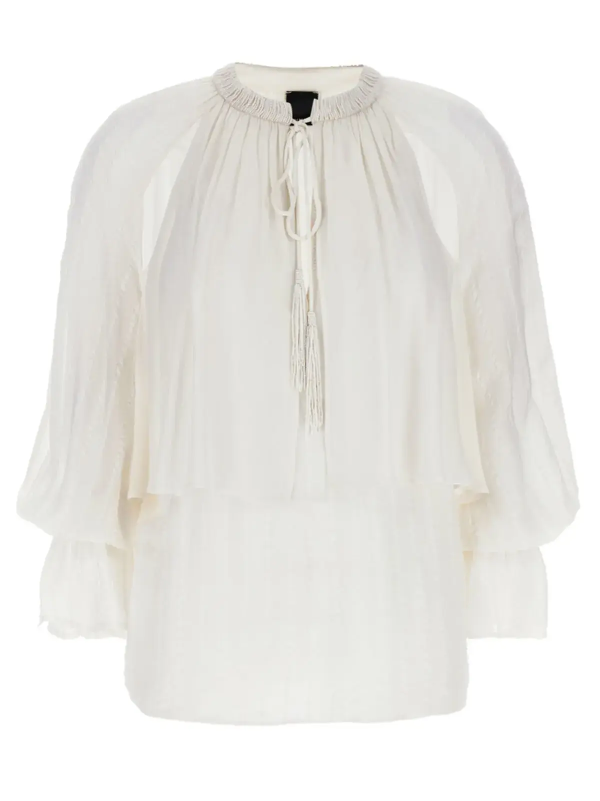Вишукана біла блуза з віскози з тонкими атласними смужками, оздоблена вишивкою з бісером на круглій горловині та декоративним шнурівкою з китицями. Довгі рукави з еластичними воланами додають ніжності, підкреслюючи унікальний стиль і бездоганну якість виробу.