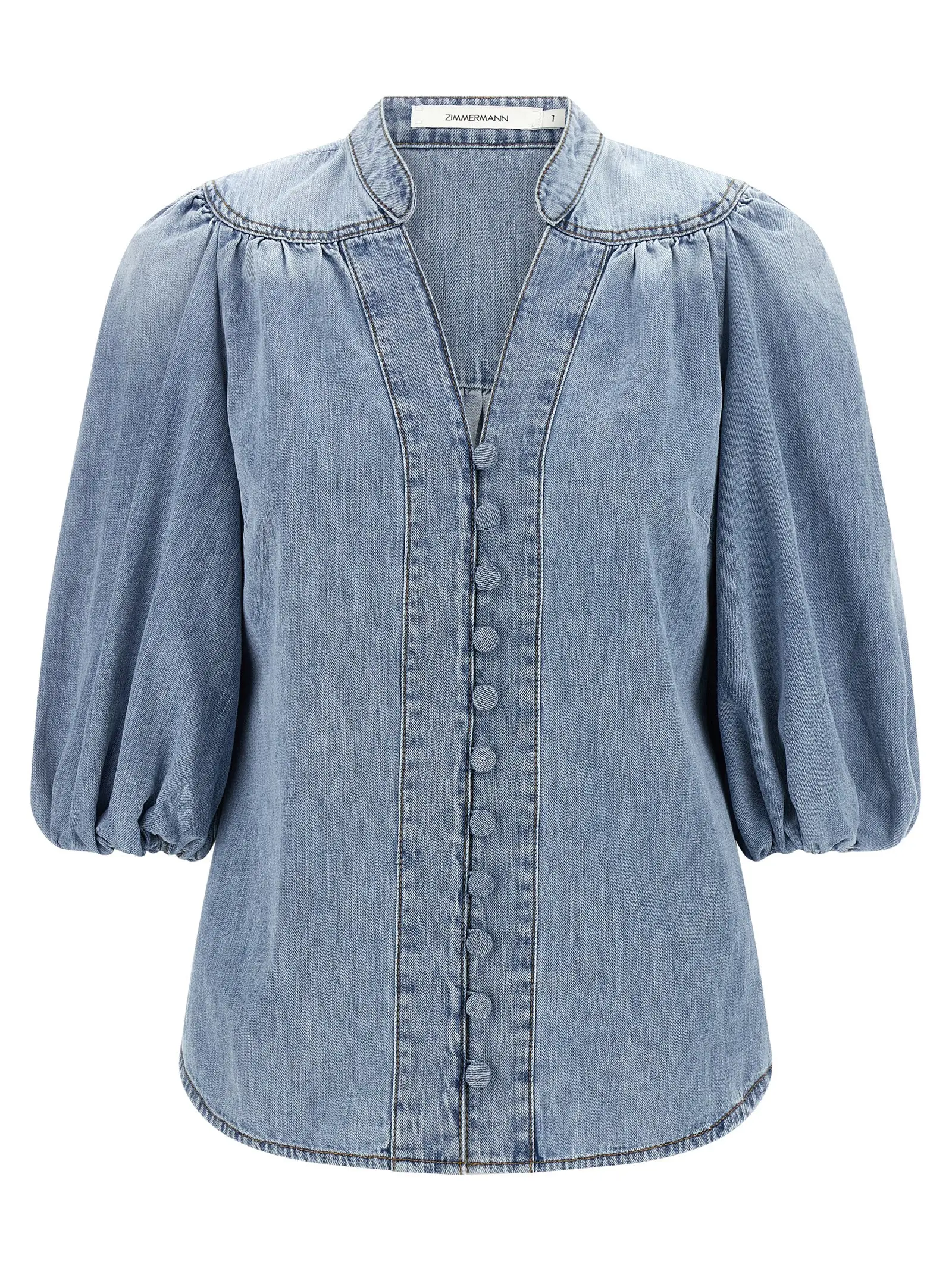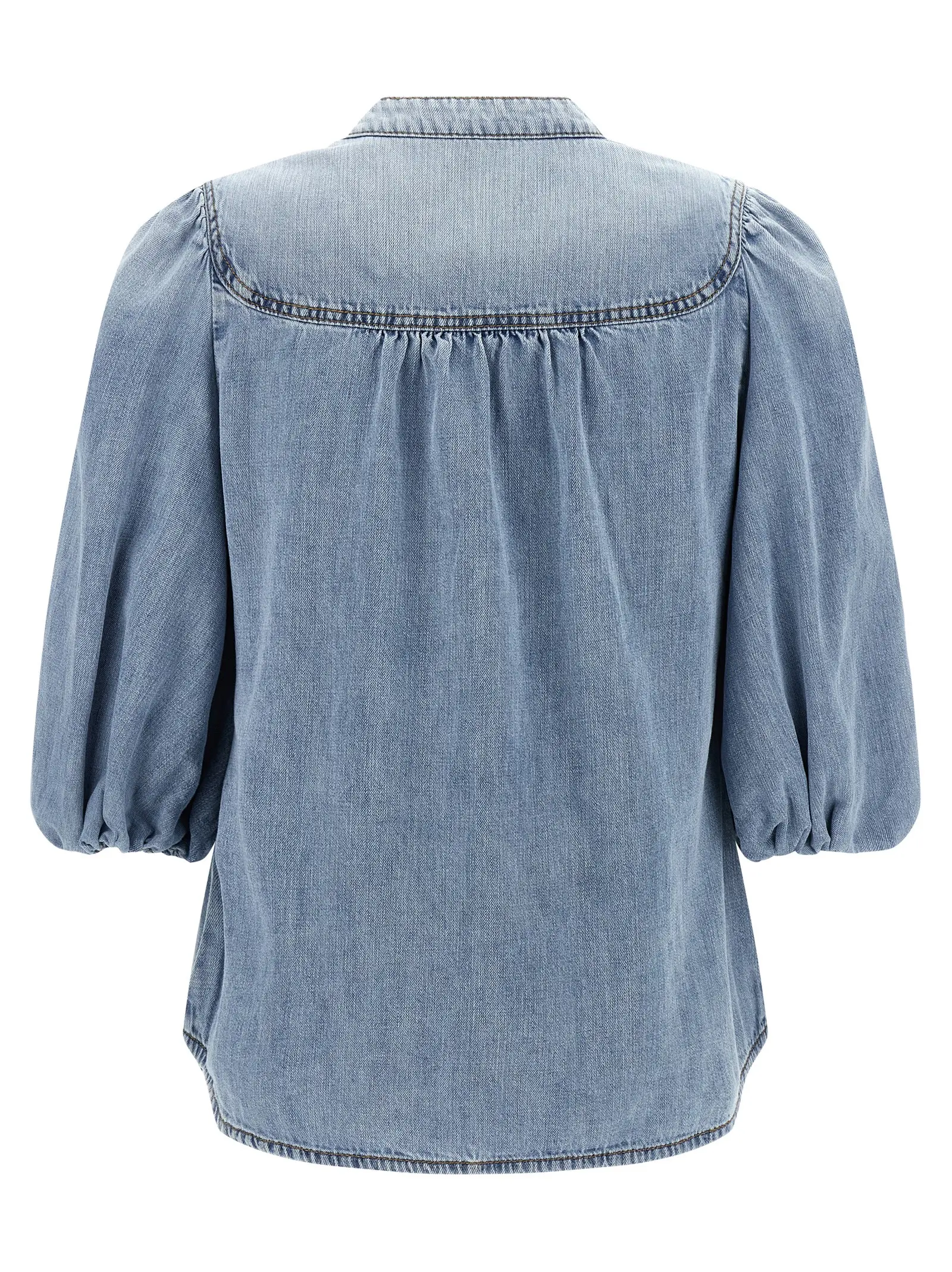 Вишукана блакитна блузка з деніму з 100% бавовни поєднує у собі сучасний дизайн з корейським коміром та глибоким вирізом, доповнена ніжними рюшами на плечах і об’ємними рукавами довжиною три чверті, що надає виробу неперевершеної елегантності, універсальності та високого статусу.
