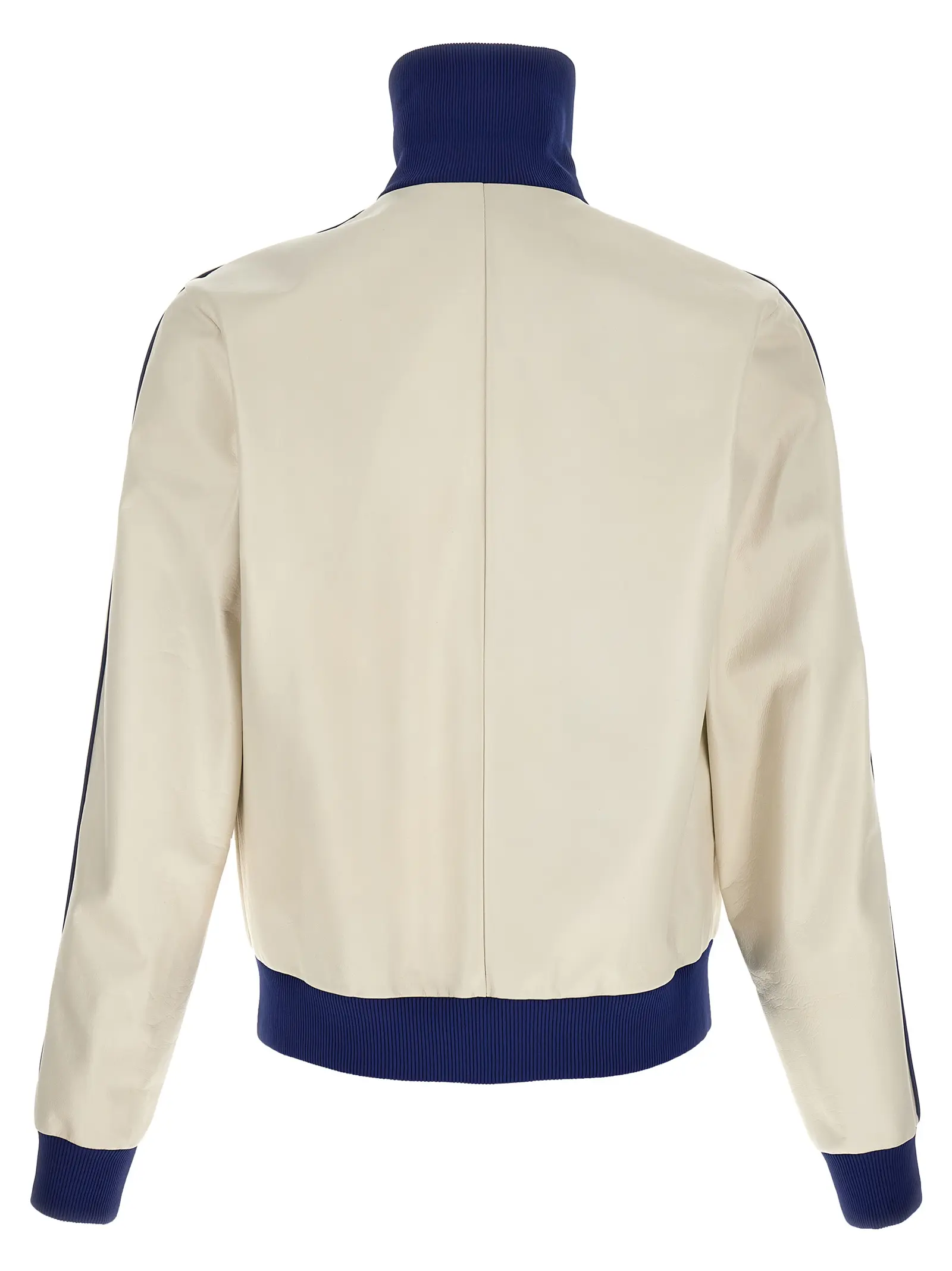 Чоловічий білий блузон з натуральної овечої шкіри із спеціальною восковою обробкою, доповнений еластичними трикотажними деталями, тисненим логотипом і застібкою на блискавку спереду. Високий комір, функціональні кишені та довгі рукави з манжетами підкреслюють вишуканий стиль і бездоганну якість цього ультрасучасного виробу.