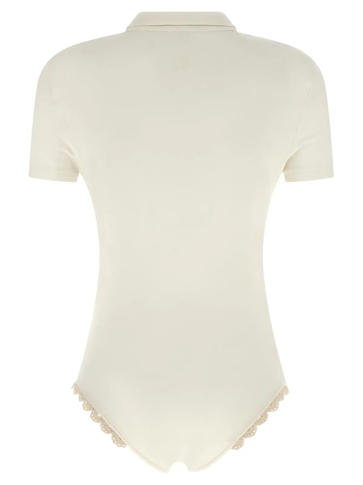 Розкішне боді білого кольору, виконане з високоякісної віскози з додаванням еластану для ідеальної посадки, поєднує елегантний поло-дизайн з комірцем і ґудзиками, витончені ручні в’язані мереживні деталі та зручні кнопки внизу, що підкреслює вишуканий стиль і універсальність для будь-якого образу.