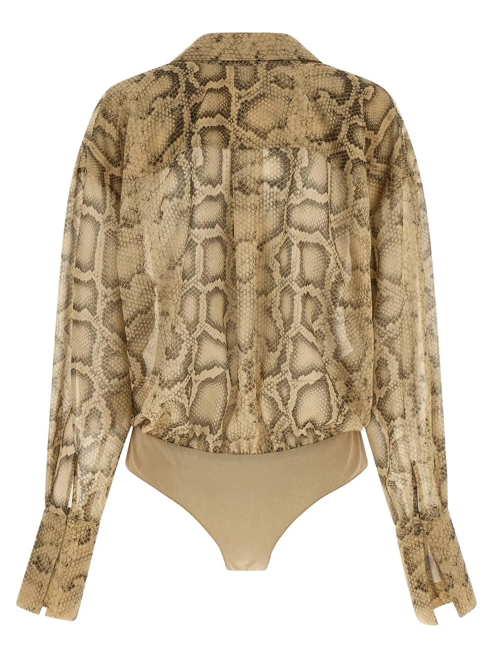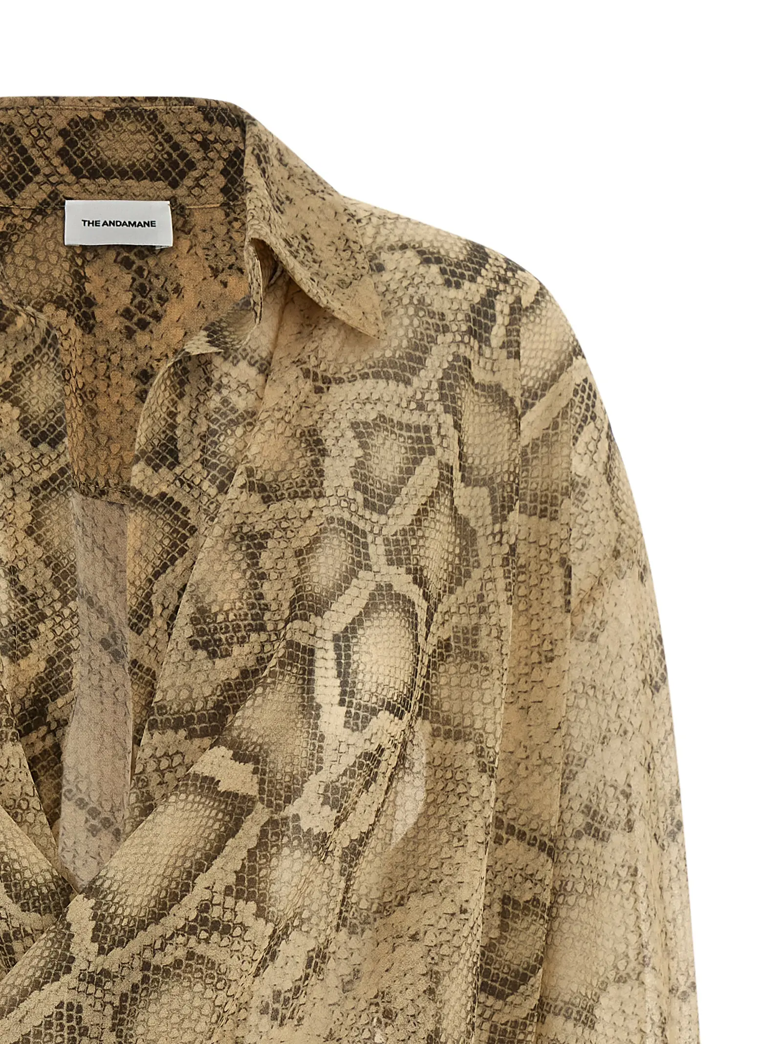 Напівпрозора фактура з анімалістичним візерунком створює делікатну гру світла на шкірі. Конструкція з глибоким перехресним декольте та м’яким драпуванням формує розслаблений об’єм, який врівноважують строгі манжети й відкладний комір. Занижена лінія плеча додає силуету спокою, а приховані кнопки внизу забезпечують надійну фіксацію тонкого синтетичного полотна.