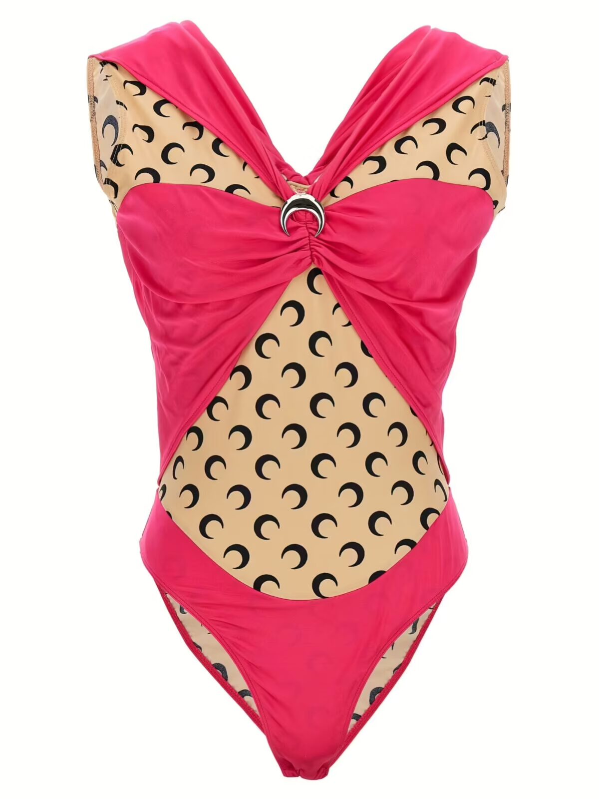 Жіночий боді з логотипом Marine Serre Фуксія виготовлений з поєднання різних матеріалів у техніці пачворку з цілковитим логотипним принтом та ефектом покриття. Модель без рукавів з V-подібним вирізом і декоративною бляшкою у формі місяця. Склад: 95% віскоза, 5% еластан.