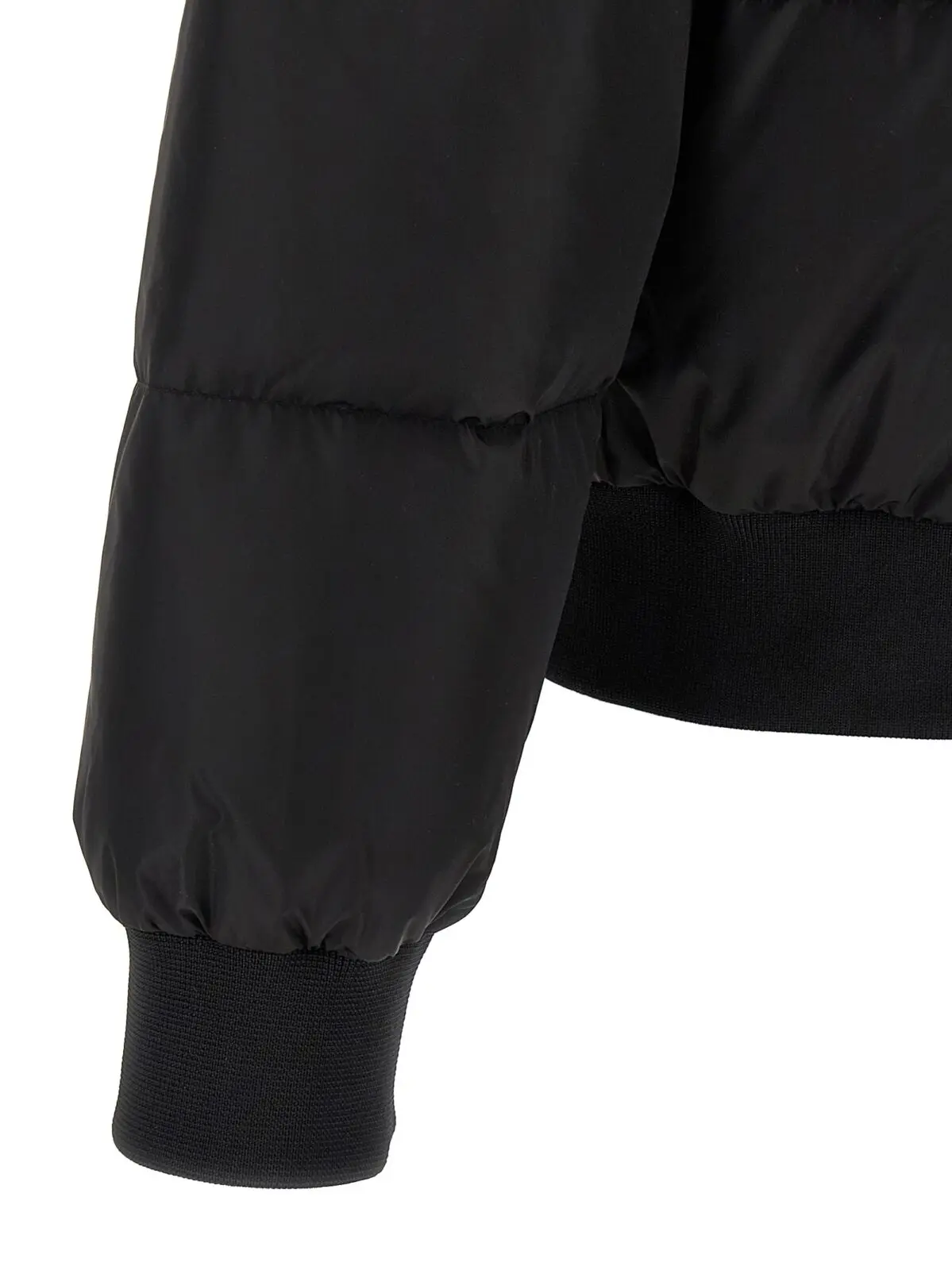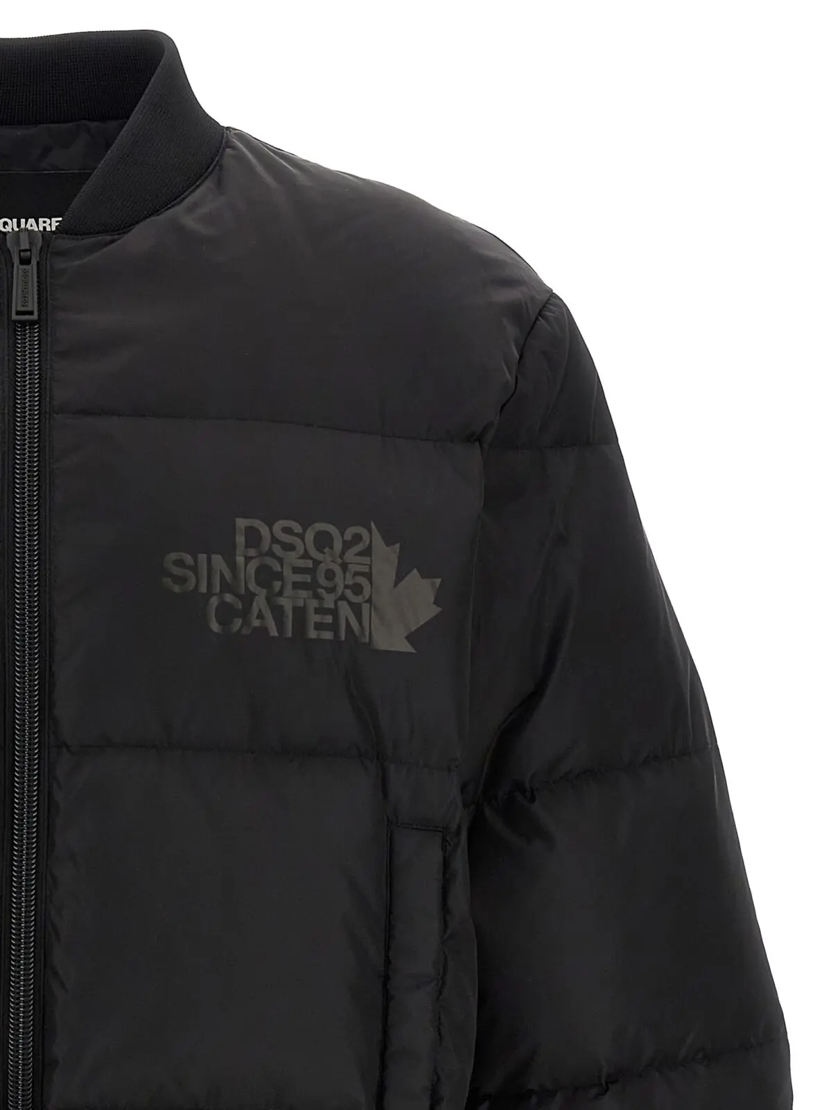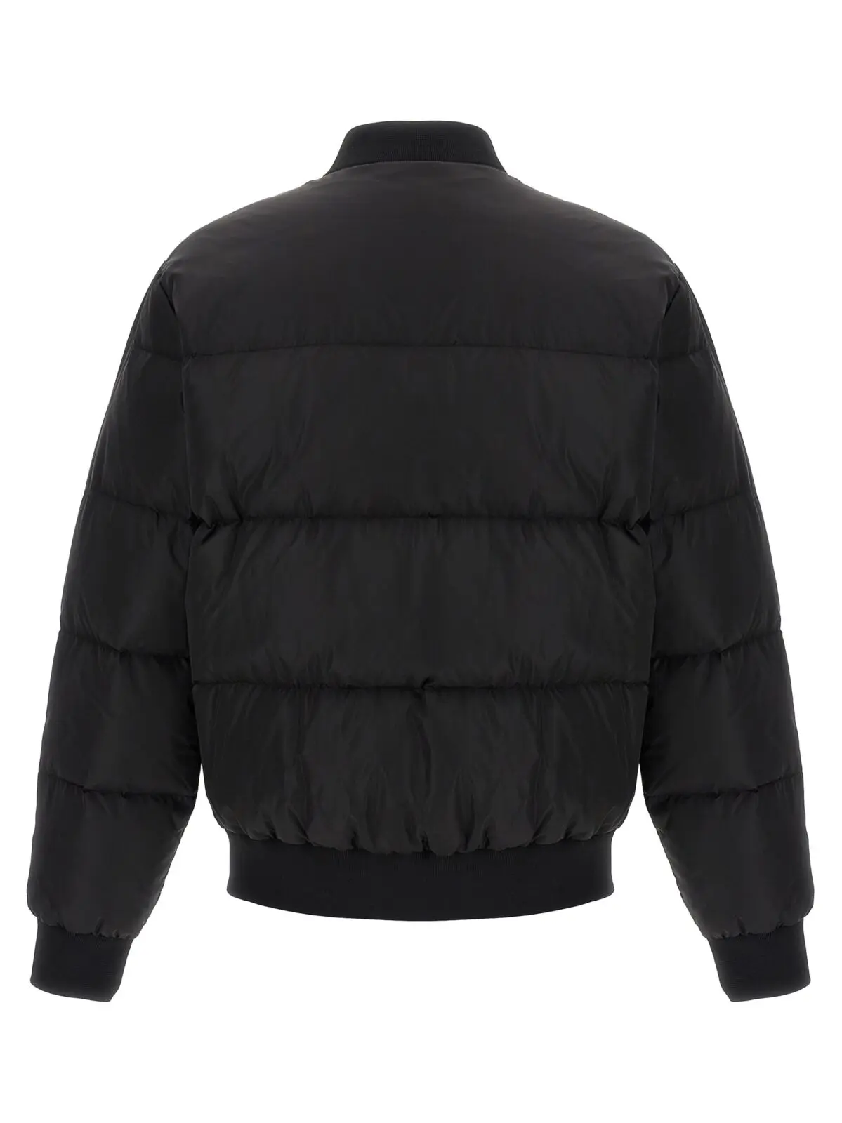 Утеплений чоловічий бомбер чорного кольору з передньою застібкою на блискавку, виконаний із високоякісного поліаміду, поєднує інноваційний дизайн із витонченими трикотажними деталями та рельєфним логотипом збоку. Ця модель ідеально підкреслює статус і стиль, забезпечуючи комфорт і універсальність у будь-яку погоду.