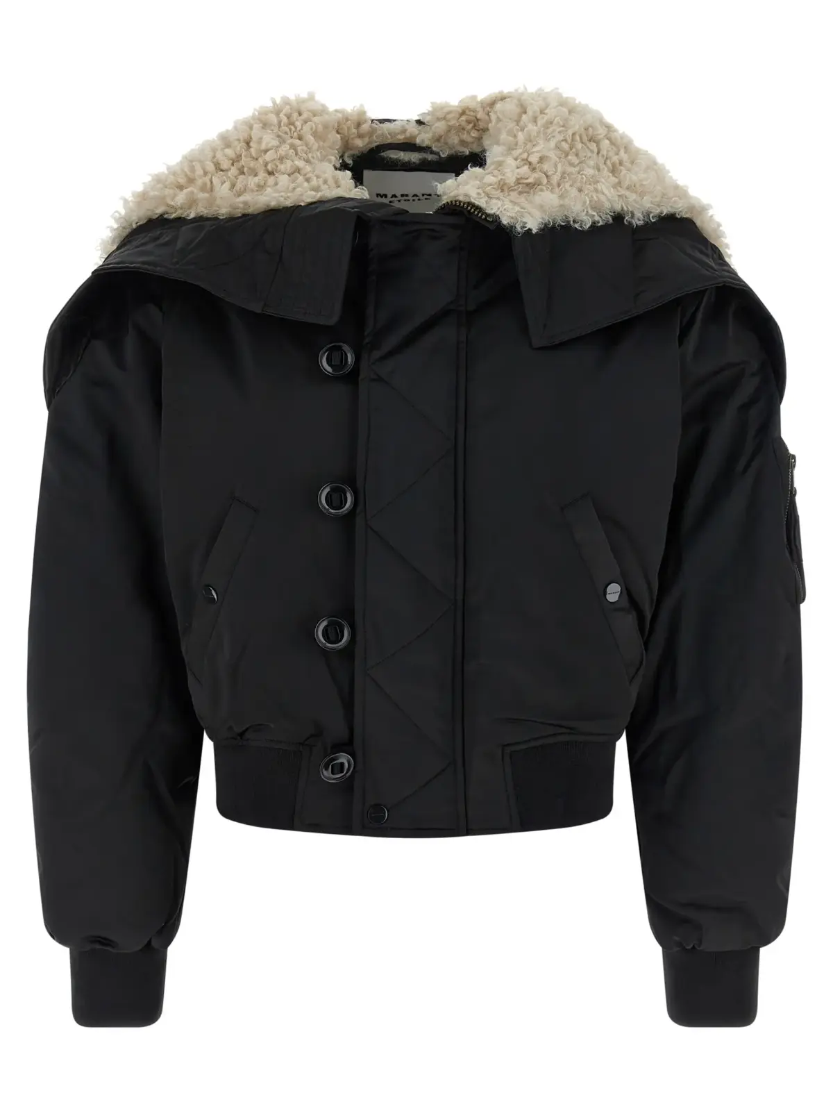 Елегантний жіночий бомбер Elisa з колекції Marant Etoile виконаний із високоякісного сатину з легким наповнювачем, доповнений тонко поєднаними трикотажними деталями, капюшоном на блискавці з м’якою підкладкою під хутро, високим коміром та надійною застібкою на блискавку і ґудзики. Ця модель поєднує інноваційність, комфорт і стиль, підкреслюючи статус і бездоганний смак у будь-якій ситуації.