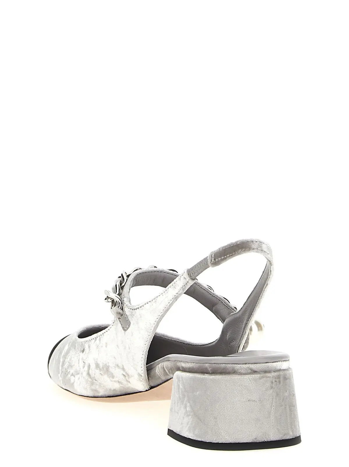 Вишукані босоніжки з оксамиту срібного відтінку, виготовлені з натуральної телячої шкіри, поєднують елегантний дизайн із витонченими деталями – ремінцем з ланцюжком та штучною перлиною. Високий каблук і шкіряна підошва забезпечують комфорт і впевненість, підкреслюючи статус і неповторний стиль.