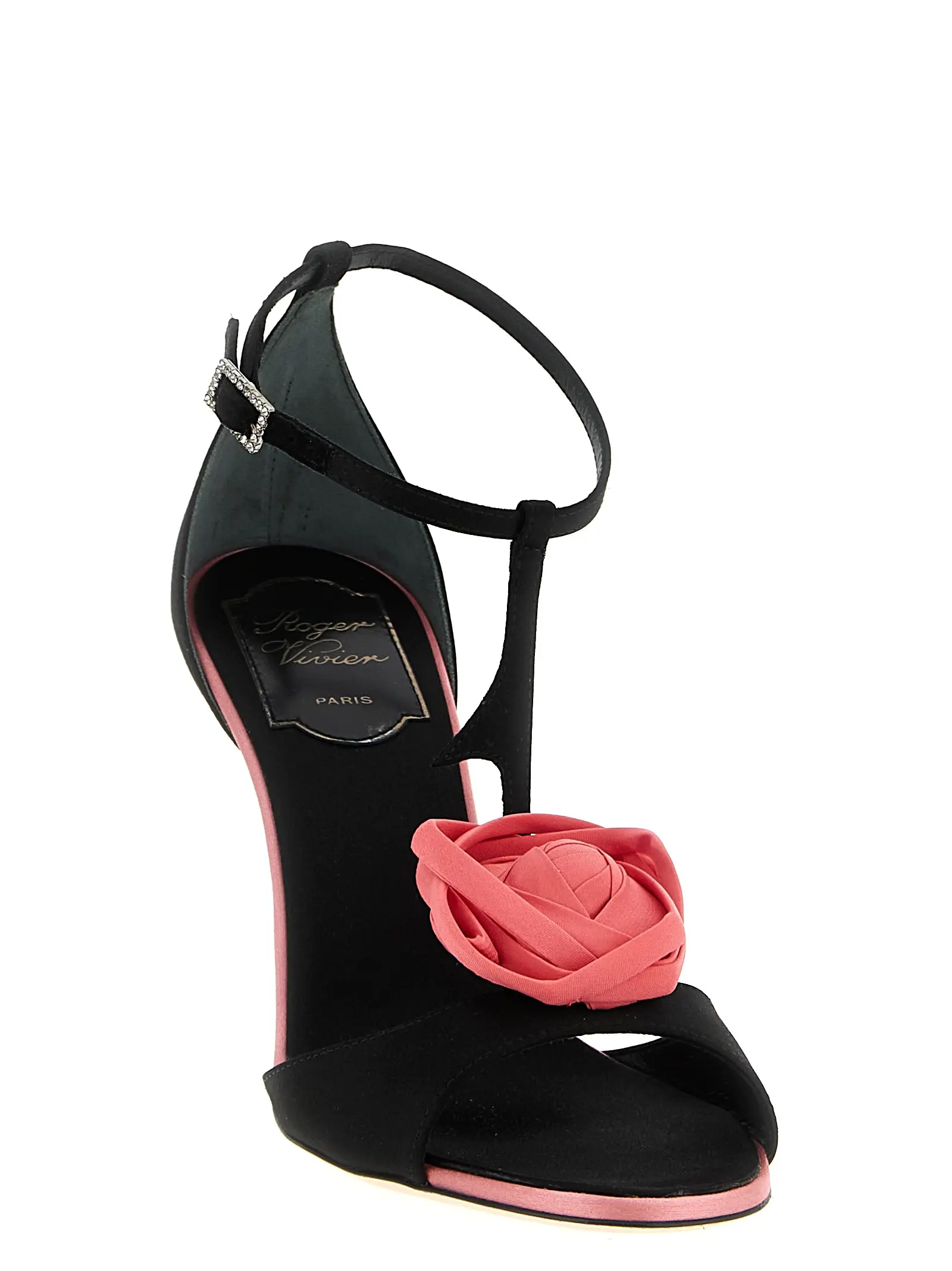 Чорні босоніжки Rose Vivier створені з розкішного поєднання віскози та шовку, прикрашені вишуканим квітковим декором на передній частині. Регульований Т-подібний ремінець із ювелірною пряжкою на щиколотці гармонійно поєднується з лакованим каблуком і шкіряною підошвою, надаючи виробу неперевершену елегантність, інноваційність та універсальність, що підкреслюють статус і бездоганний стиль.