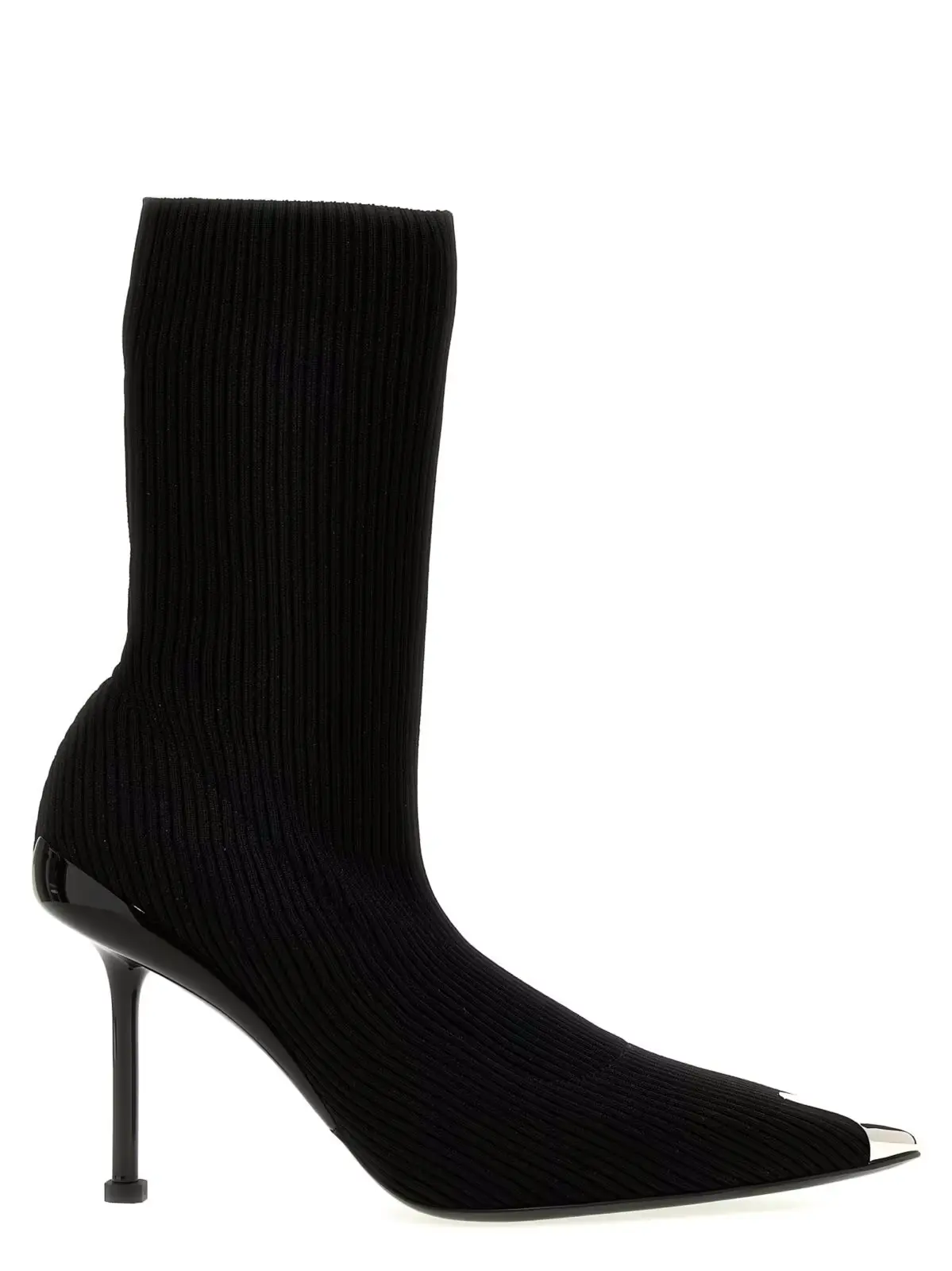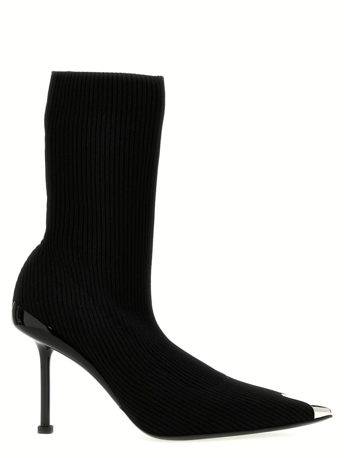 Відчуйте справжній дух бунтарства та стилю з ботільйонами Alexander McQueen моделі Slash. Ці чорні ботільйони з ребристим трикотажним верхом та сріблястим металевим носком у панк-стилі стануть втіленням вашої сміливості. Лаковані підбори в тон, з вирізом, доповнюють їхній неповторний дизайн, а срібляста підошва додає вишуканості. З цими ботільйонами кожен ваш крок промовлятиме про неперевершений смак та індивідуальність.
