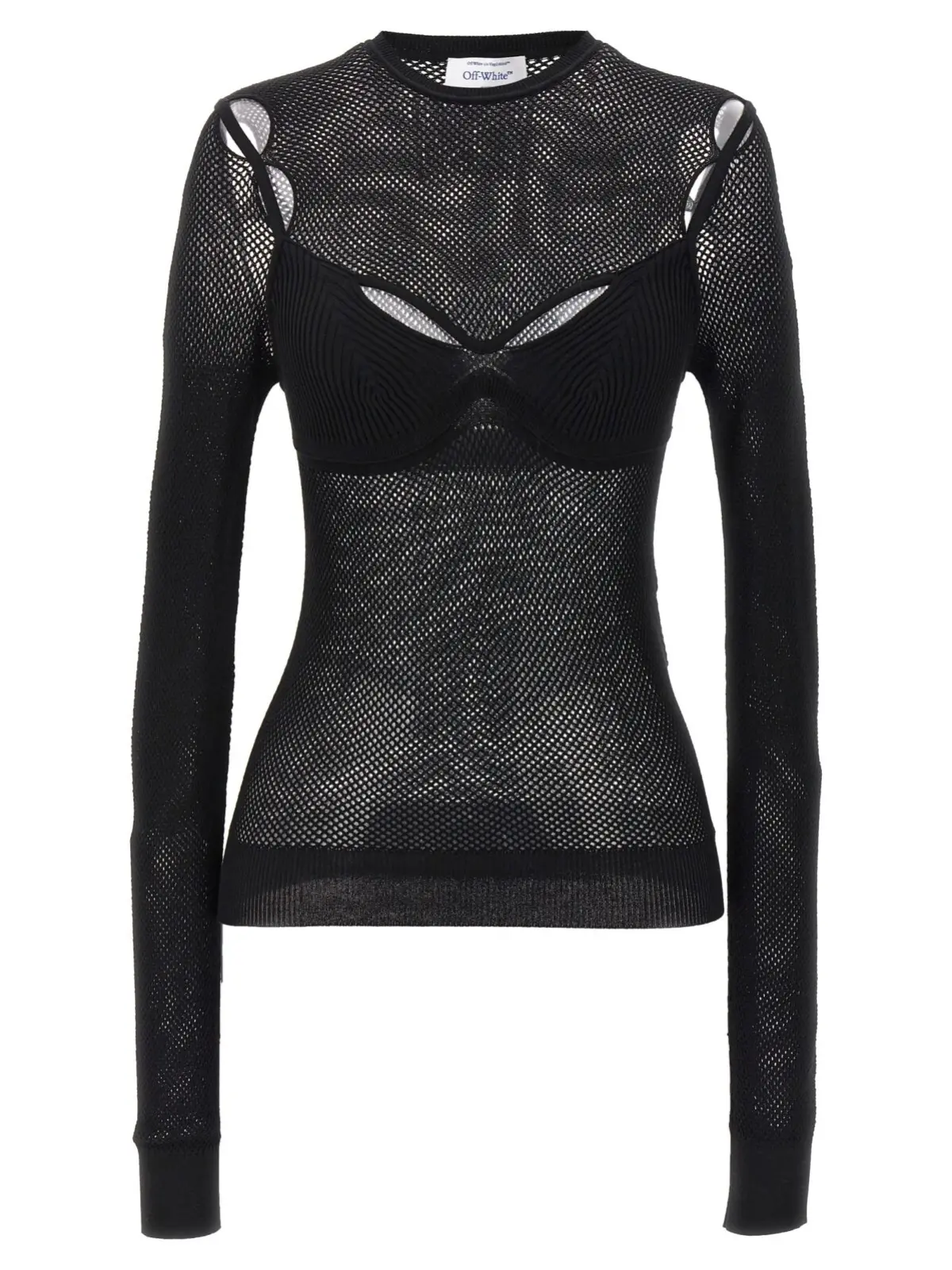 Top Net Arrow Bralette від Off-White у чорному кольорі зроблений з еластичної сітчастої тканини з вирізами, високим комірцем та довгими рукавами.
