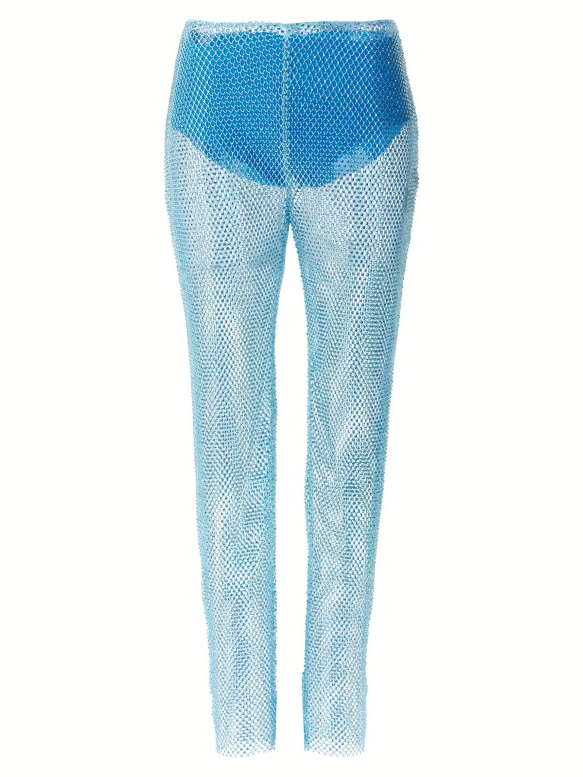 Блакитні жіночі брюки з паєткової сітки Giuseppe Di Morabito. Виготовлені з прозорої тканини зі всіма зверху паєтками, мають задню блискавку, тон-в-тон знімні кюлоти. Склад: 92% поліамід, 8% еластан.