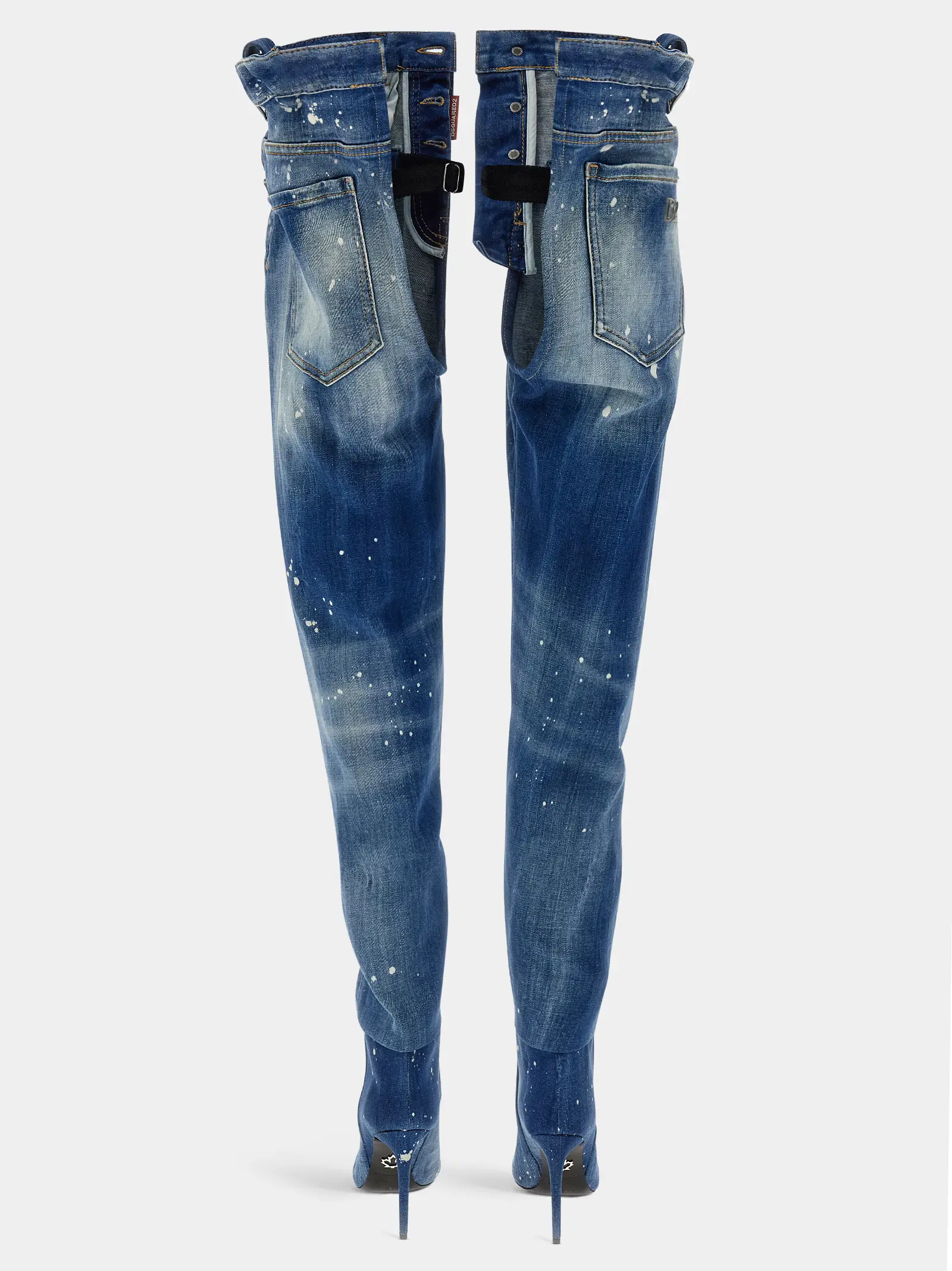 Виготовлені з деніму з ефектом потертості. Має гострий носок. Оснащені регульованим еластичним шнурком. Висота підборів стилето. Підошва виконана зі шкіри. Склад 100 відсотків бавовна. Виробництво з використанням процесу апсайклінгу. Кожна пара унікальна та відрізняється.