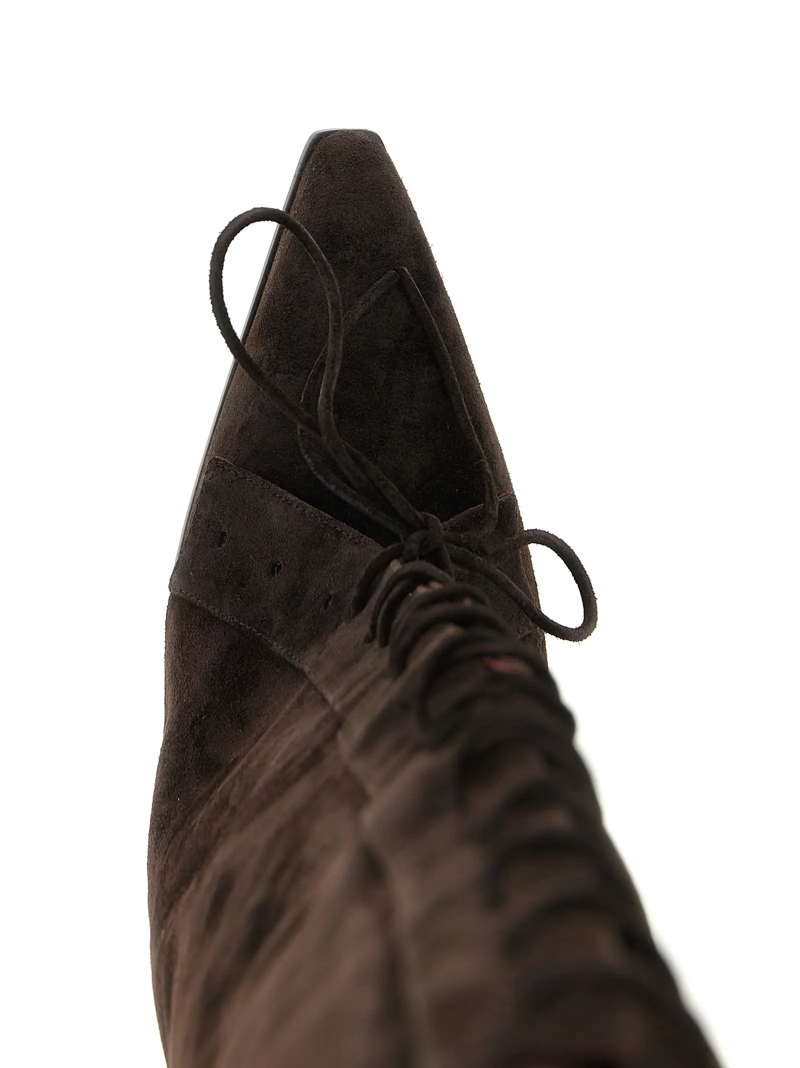 Вишукані жіночі черевики виконані з натуральної телячої шкіри з замшевою текстурою, поєднують елегантний дизайн із високим циліндричним халявником на зав’язках та стильним квадратним носком. Витончені підбори в стилі Техас і шкіряна підошва забезпечують комфорт і стійкість, підкреслюючи статусність і універсальність цього преміального виробу.