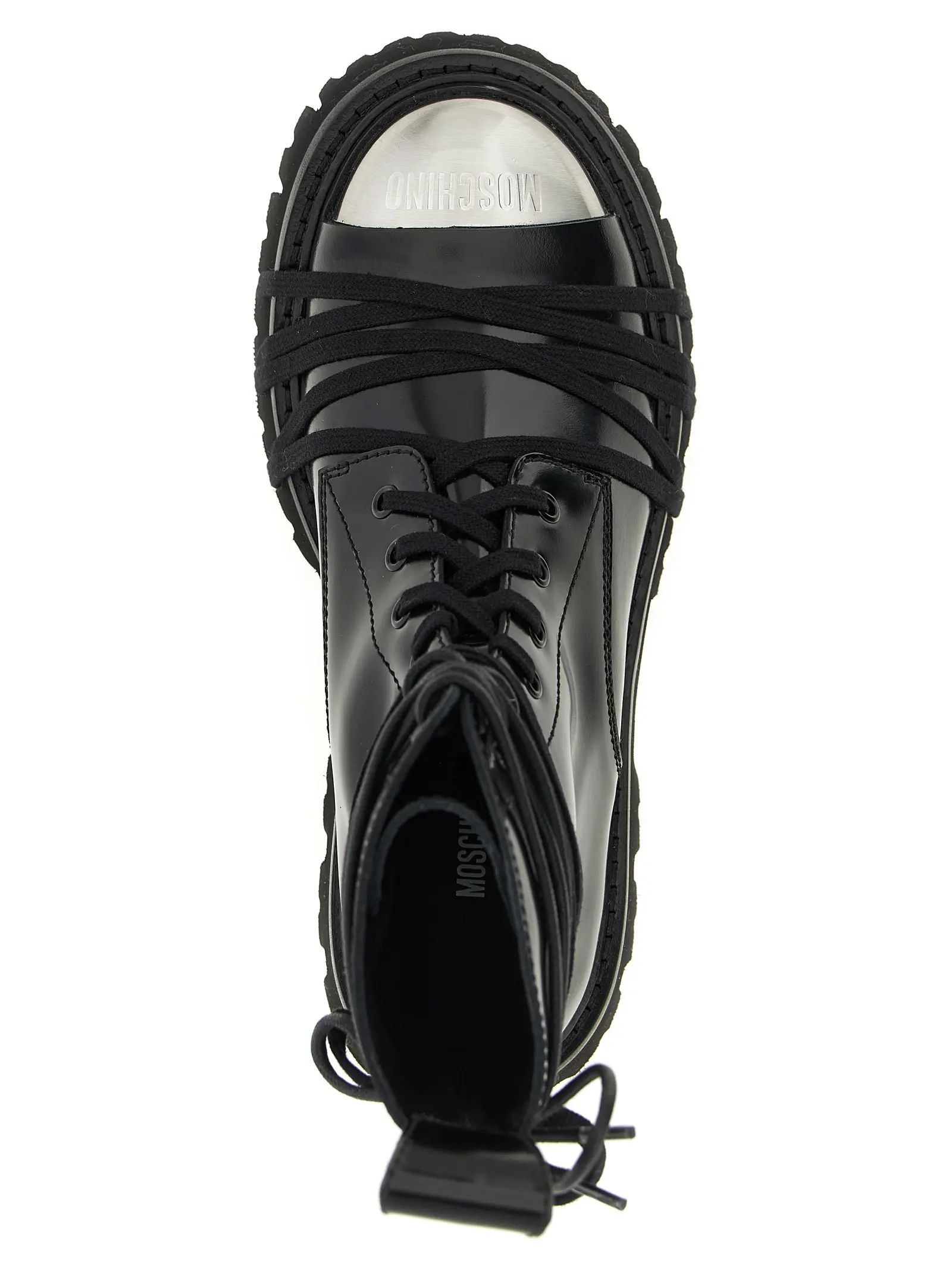 Чорні жіночі черевики Moschino виконані з натуральної телячої шкіри найвищої якості, поєднують у собі міцність та вишуканий дизайн з металевими деталями та витонченим гравіюванням логотипу. Ці універсальні та стильні черевики підкреслюють статус і смак, забезпечуючи комфорт і довговічність завдяки гумовій підошві та продуманому крою.