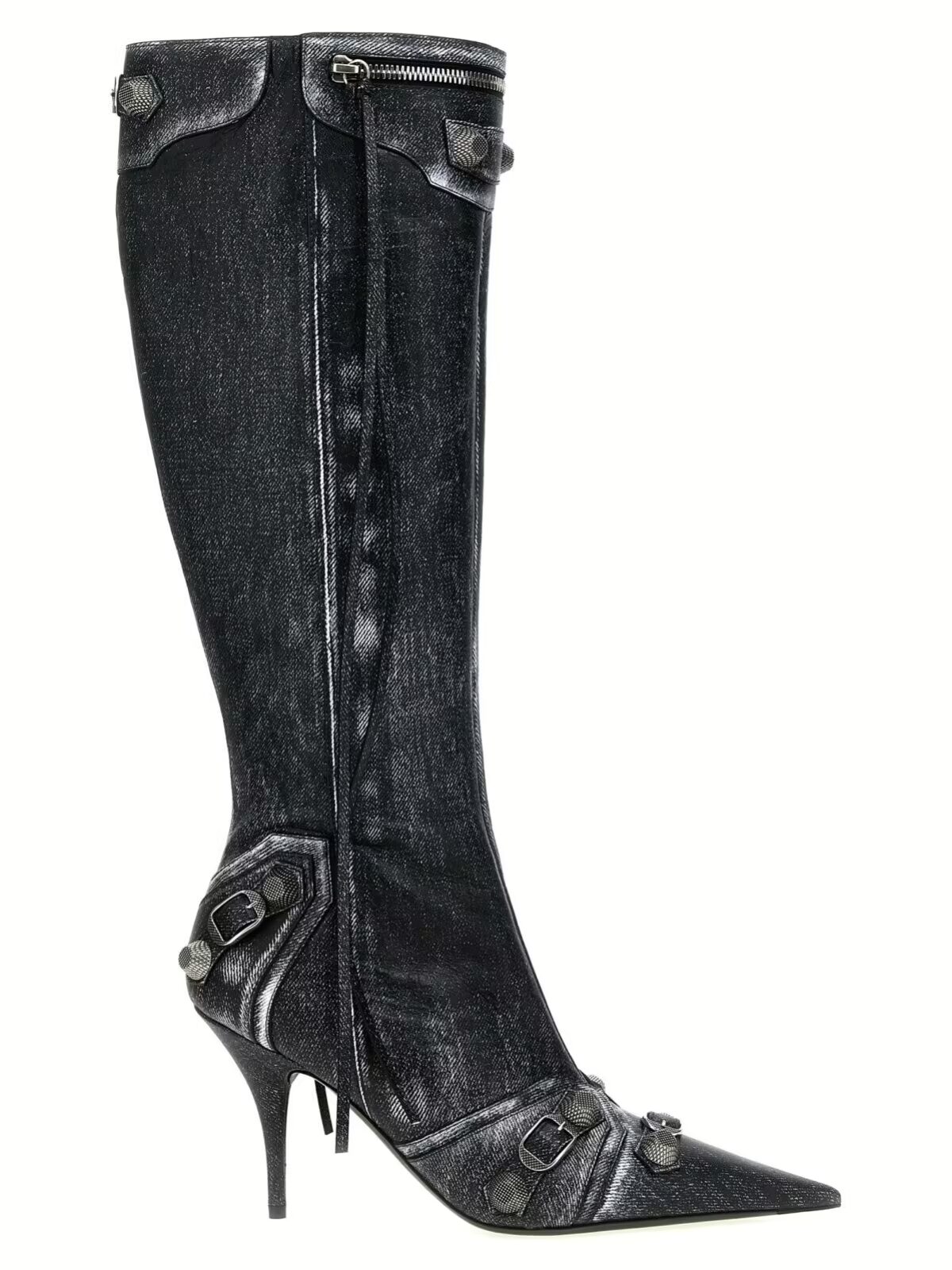Жіночі чоботи Balenciaga ‘Cagole’ виконані в стилі денім із натуральної м’якої овечої шкіри, прикрашені антикварними срібними заклепками та деталями пряжки. Взуття має зручний бічний замок-блискавку та елегантний каблук, що додає вишуканості.
