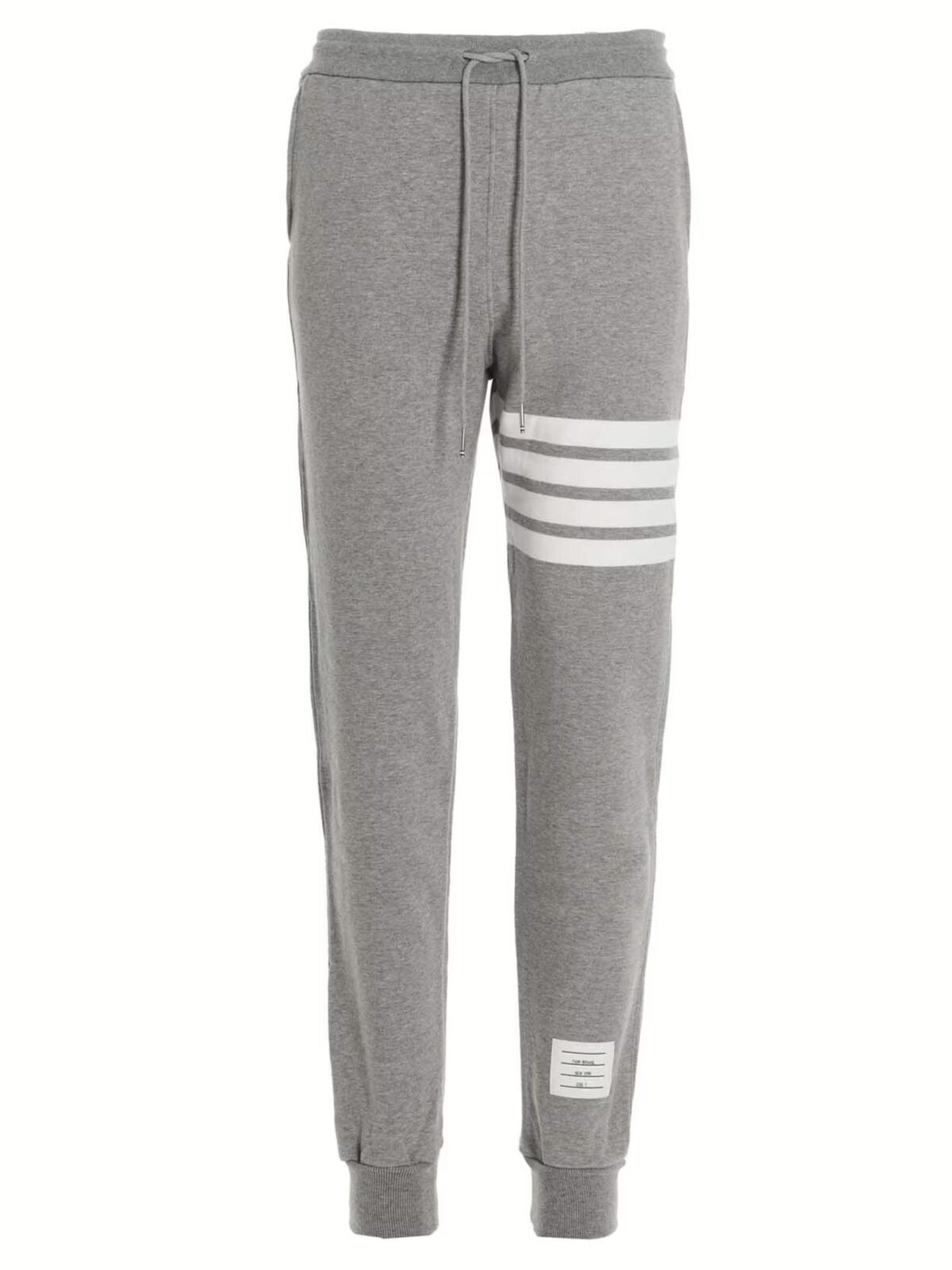 Вишукані чоловічі джогери від Thom Browne у сірому кольорі, прикрашені характерними смужками ‘4 bar’. Виготовлені з чистої бавовни, ці штани забезпечують неперевершений комфорт та стиль. Завдяки еластичному поясу зі шнурком, кишеням та манжетами на нижніх краях штанин, вони ідеально підходять як для спортивних занять, так і для повсякденного носіння.