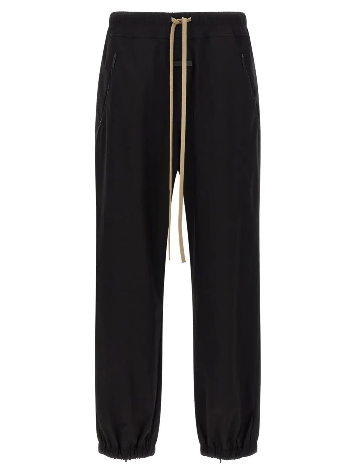 Чорні чоловічі джогери з колекції Fear Of God виготовлені з високотехнологічного матеріалу, що поєднує поліамід, поліестер і еластан, забезпечуючи комфорт і зносостійкість. Елегантний дизайн доповнений шкіряною нашивкою з логотипом, регульованим поясом із шнурком, практичними кишенями, прямими штанинами, еластичними манжетами та блискавками на щиколотках, що підкреслює вишуканість і функціональність для сучасного стилю життя.