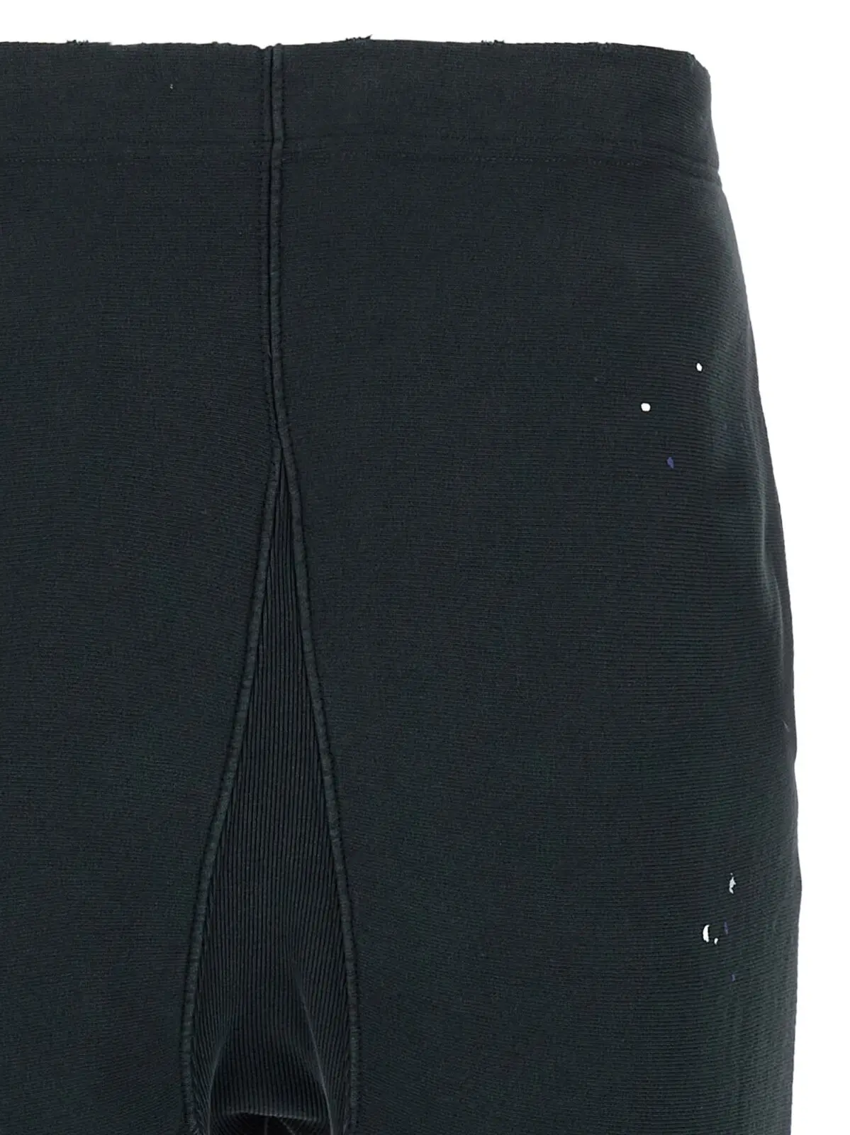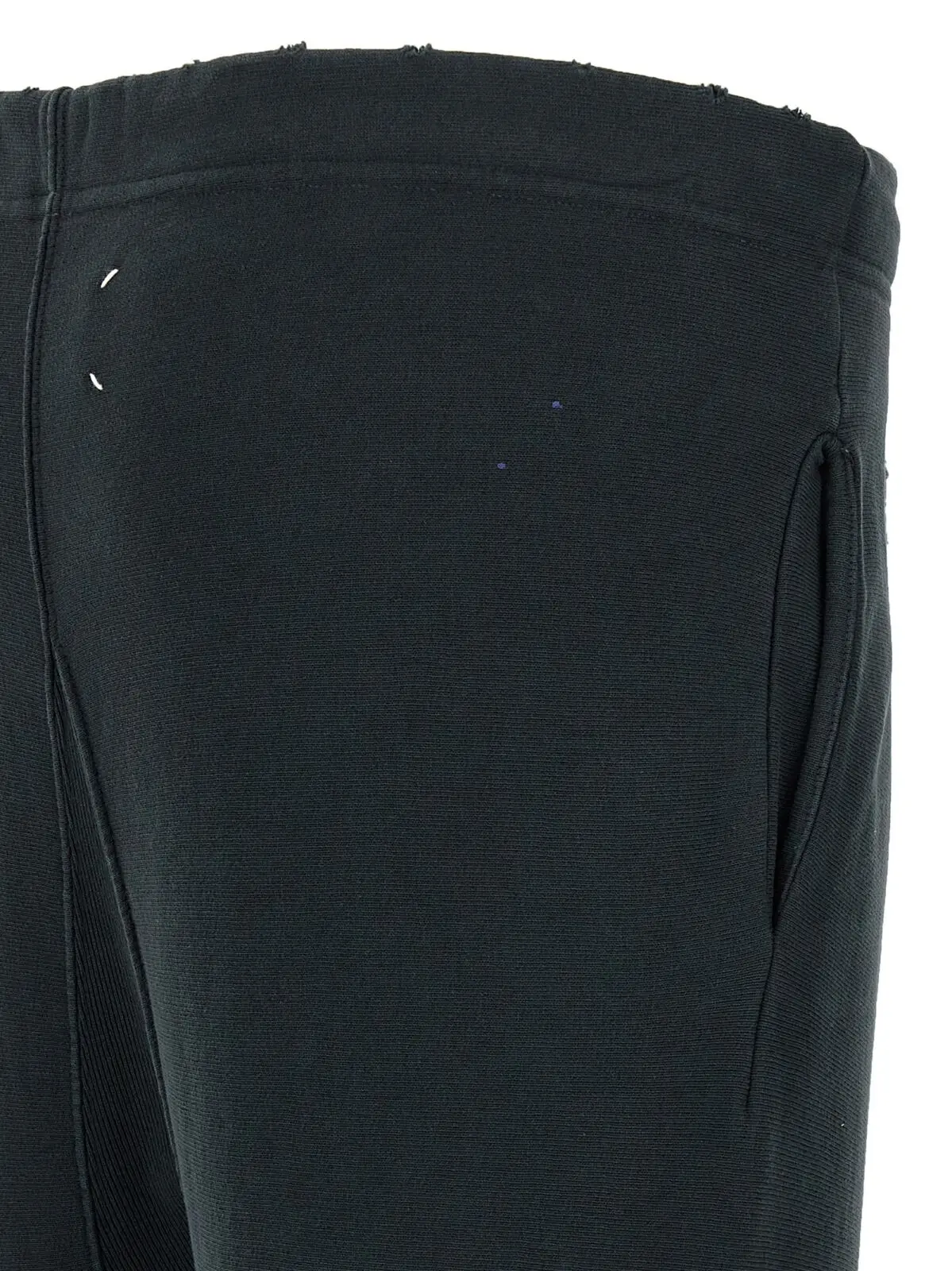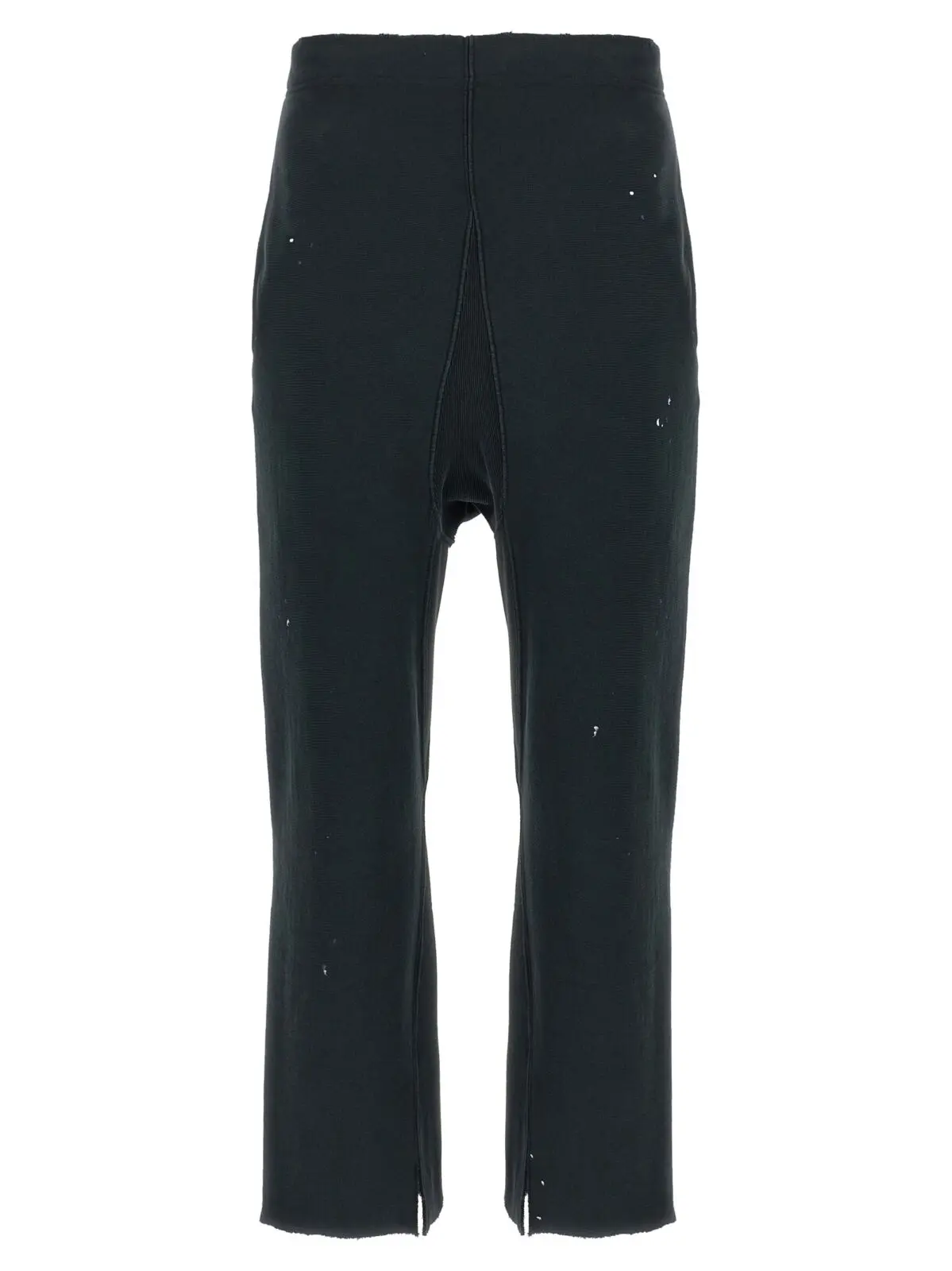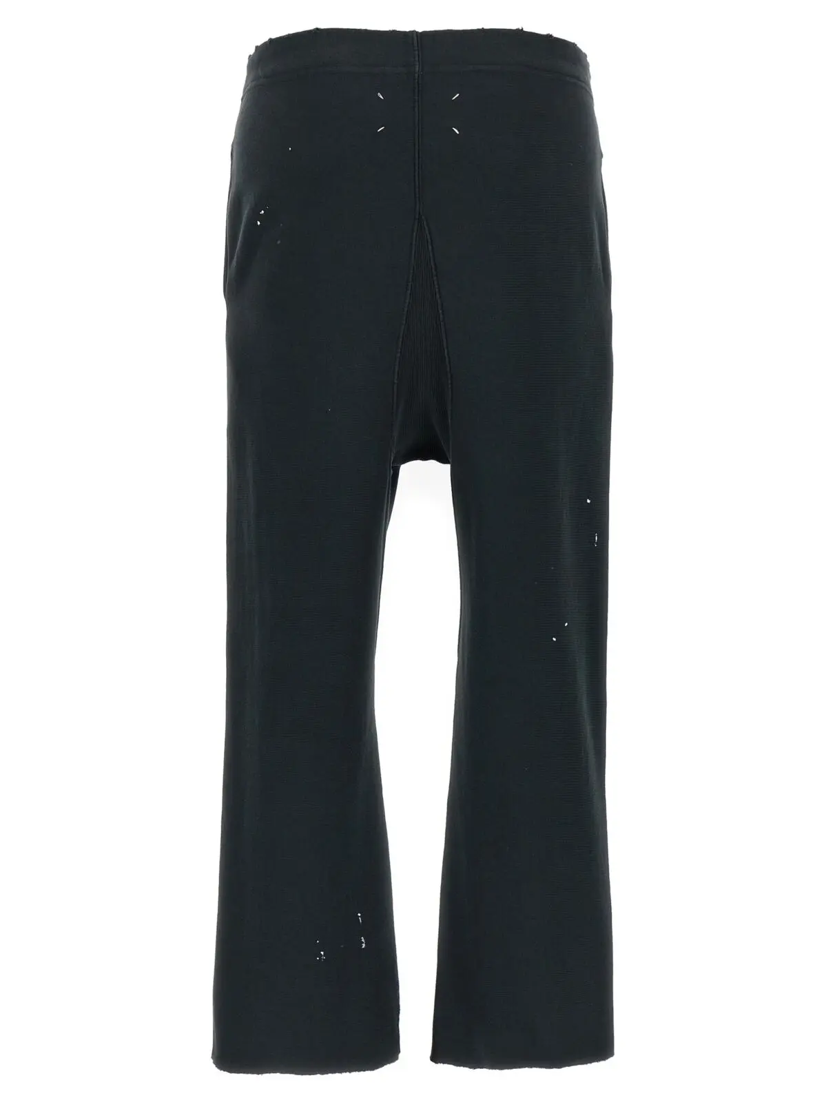 Чорні джогери Maison Margiela виготовлені з високоякісної 100% бавовняної тканини з ефектом потертості та художніми плямами фарби, що підкреслюють індивідуальність і сучасний стиль. Модель має регульований пояс, широкі штани з розрізами по низу та необробленим краєм, забезпечуючи комфорт і універсальність, що відповідає статусу впевненого у собі чоловіка.