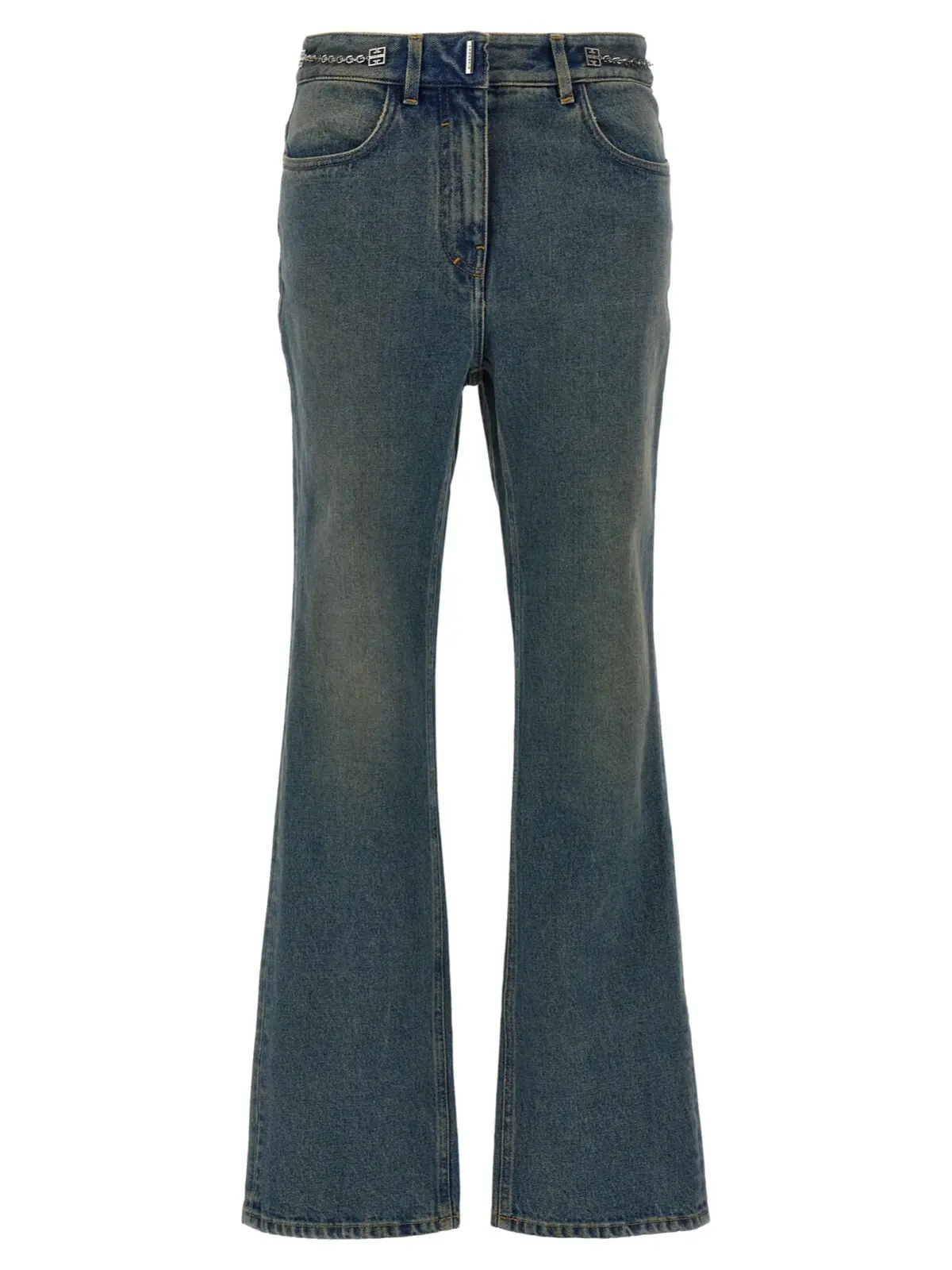 Джинси Givenchy з логотипом та металевим ланцюжком – це сині джинси для жінок з деталлю логотипу на поясі. Вони мають легкий буткатний крій, середню посадку з застібкою на блискавку та ґудзиком. Виготовлені з 100% бавовни.