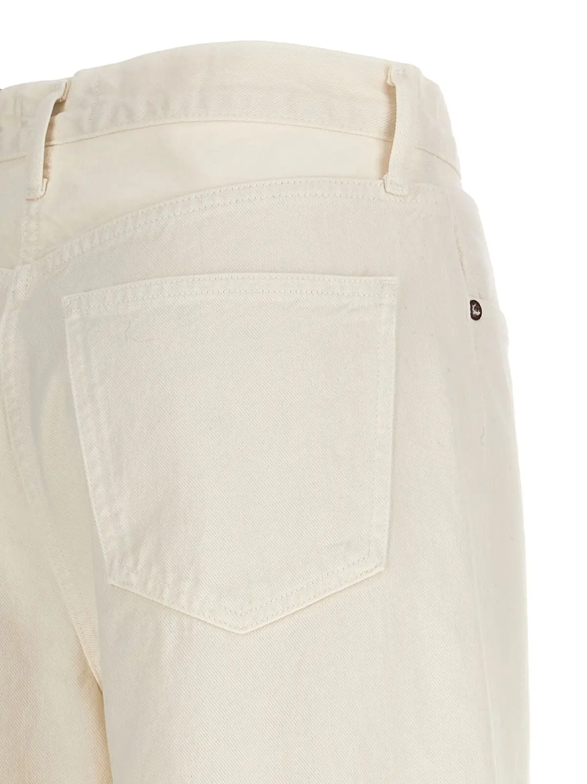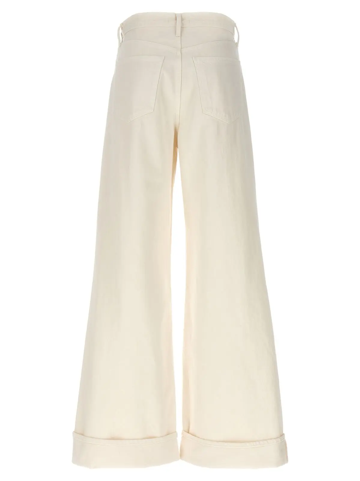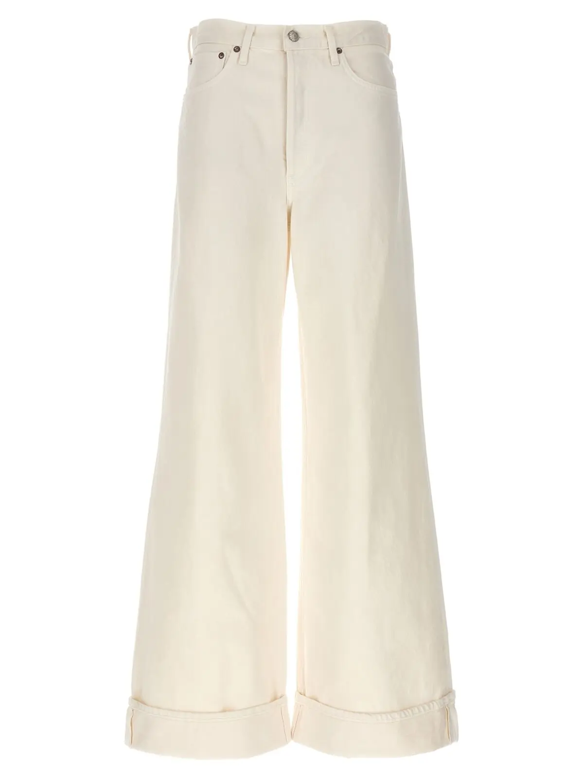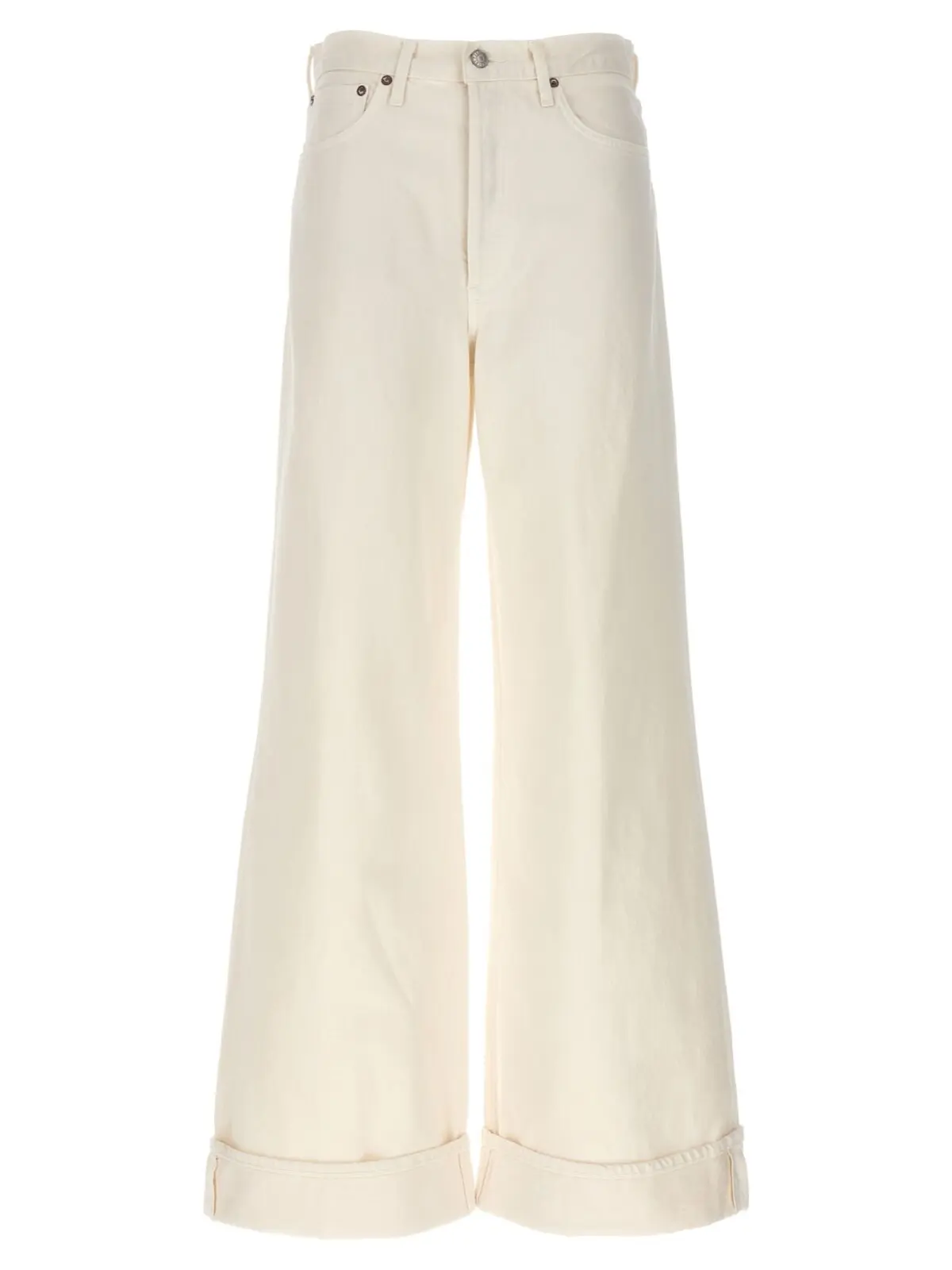 Джинси Dame Agolde – це білі денімові джинси з кнопковим застібкою, пятьма кишенями, високою посадкою, широкою ногавкою і вигорнутим низом. Виготовлені з 100% бавовни.