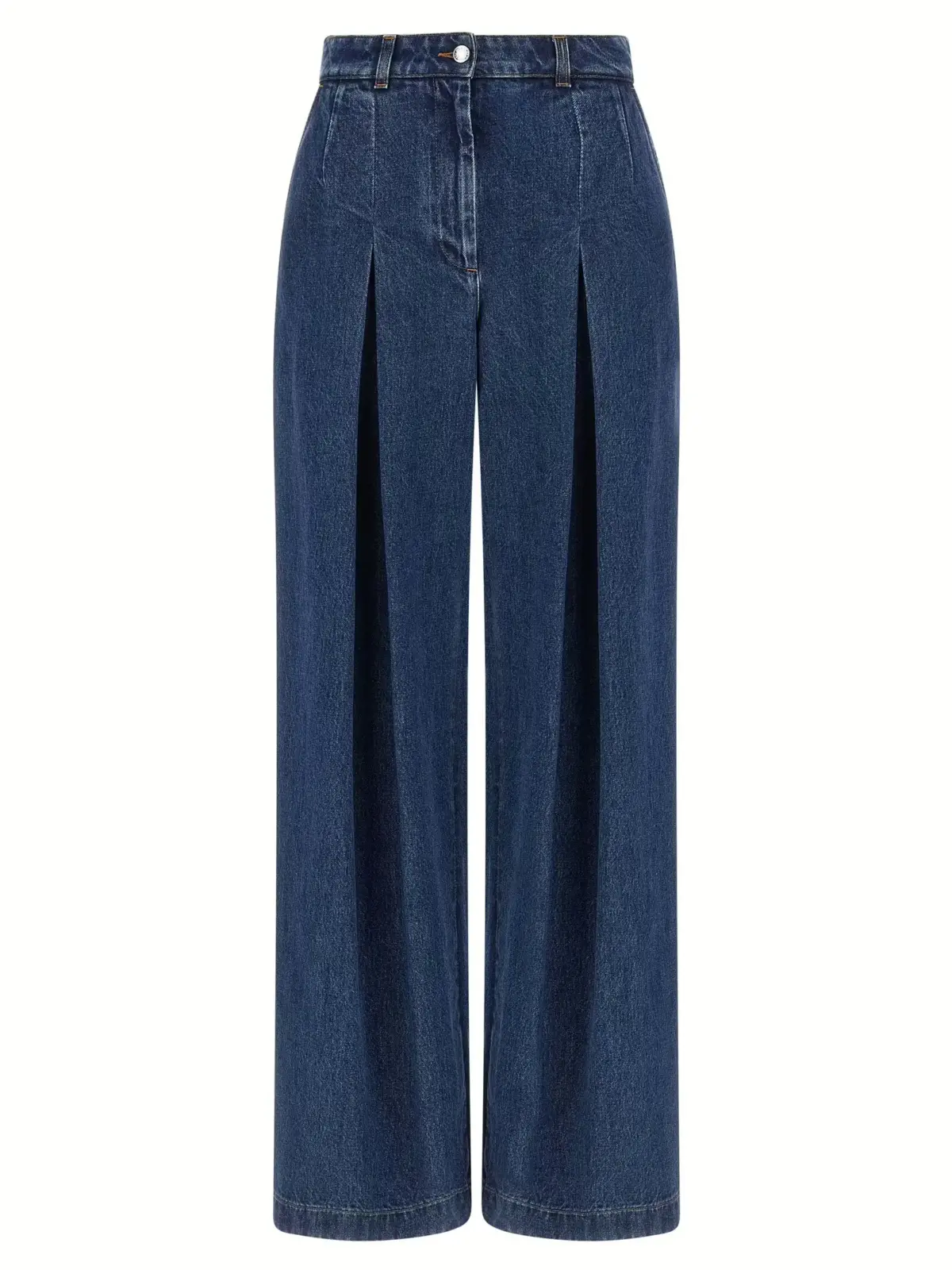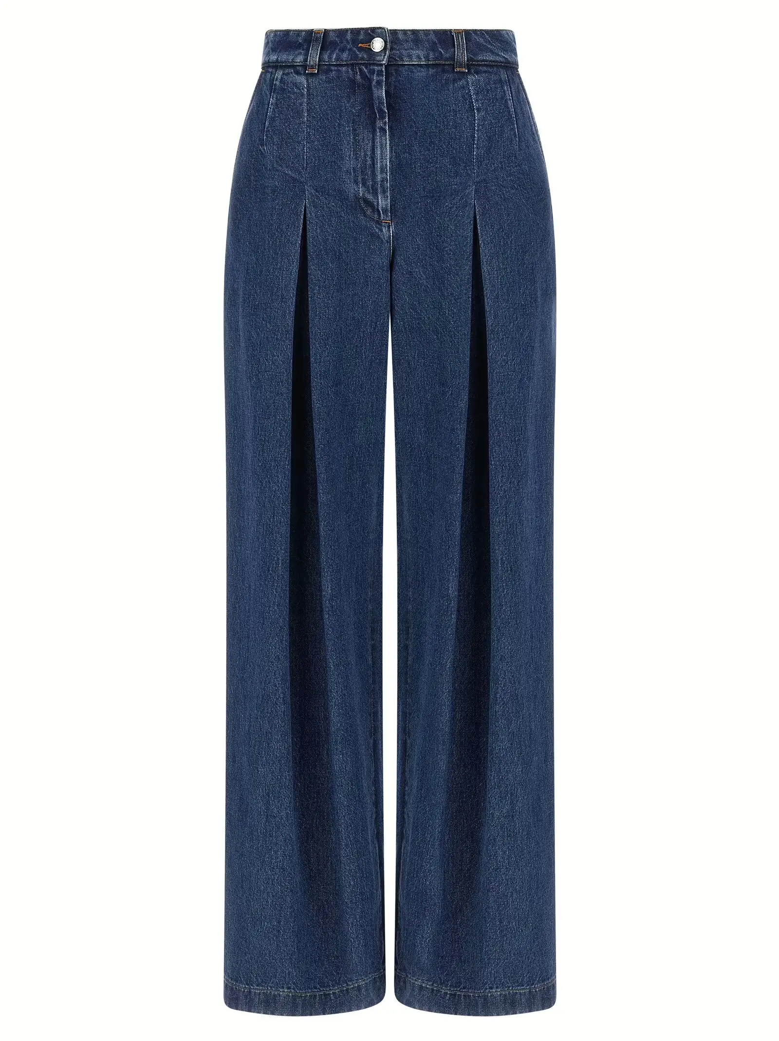 Ці джинси з колекції Dolce Gabbana виконані з високоякісної бавовняної денім тканини, мають контрастні шви, широкий крій з передніми складками та клинками, а також класичне п’ятіпокетне оформлення. Вишуканий дизайн ідеально поєднує комфорт та стиль, підкреслюючи статус і неперевершену елегантність.