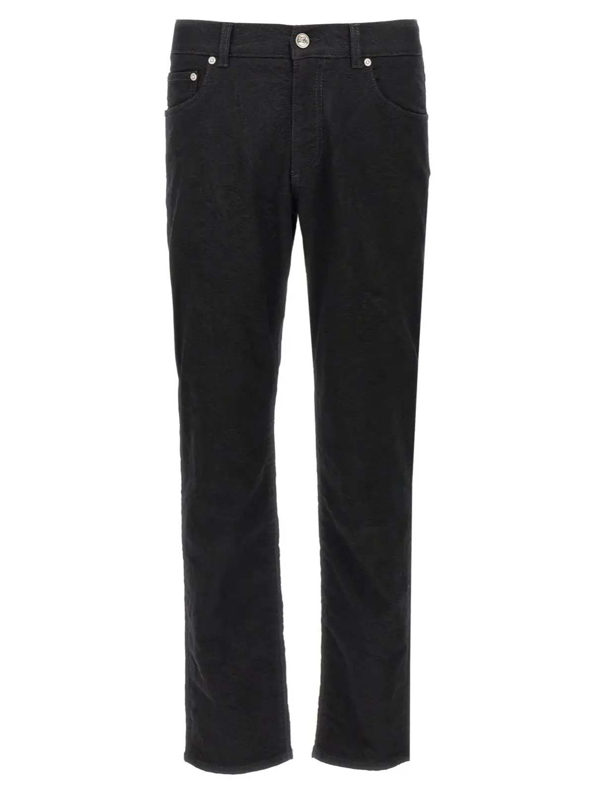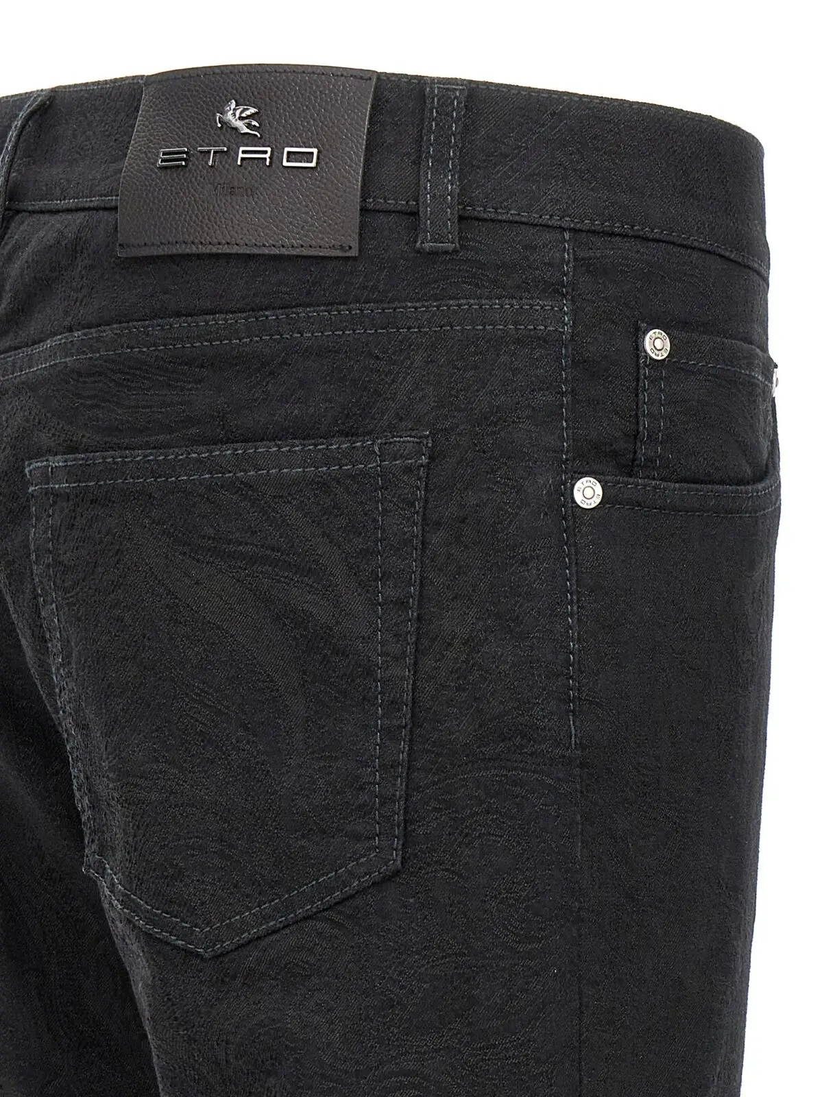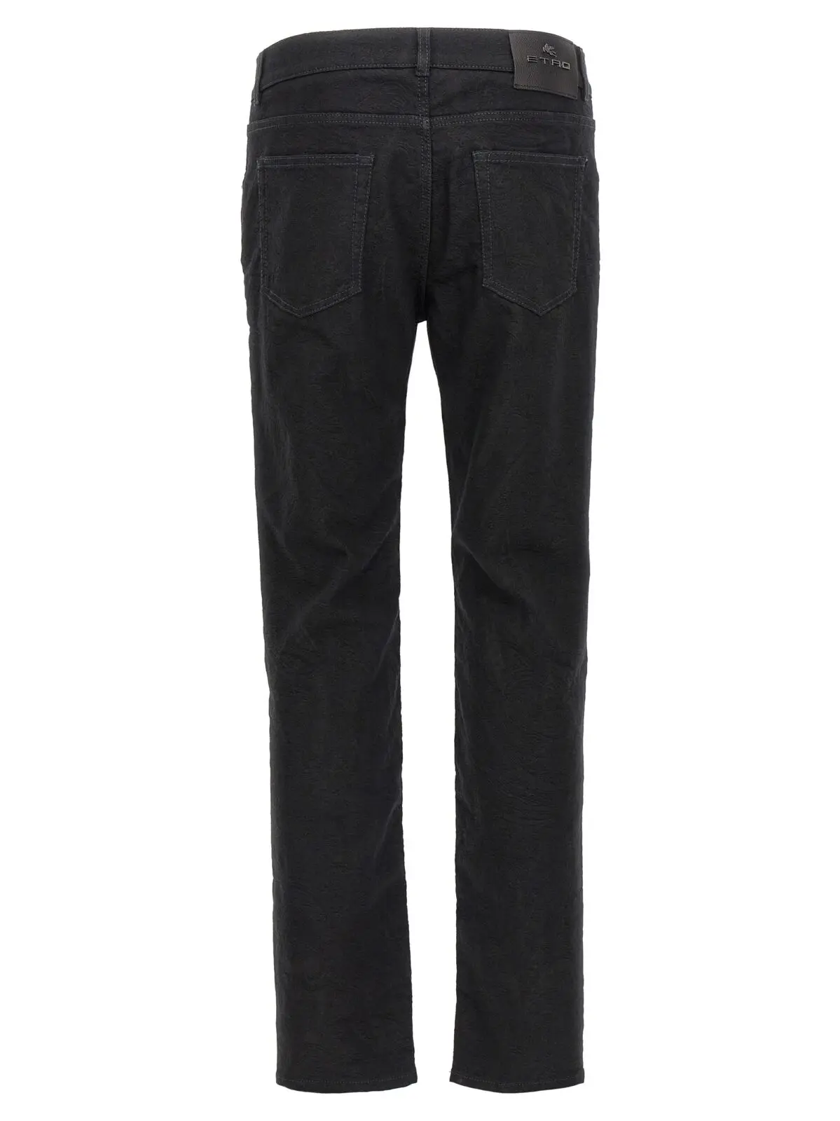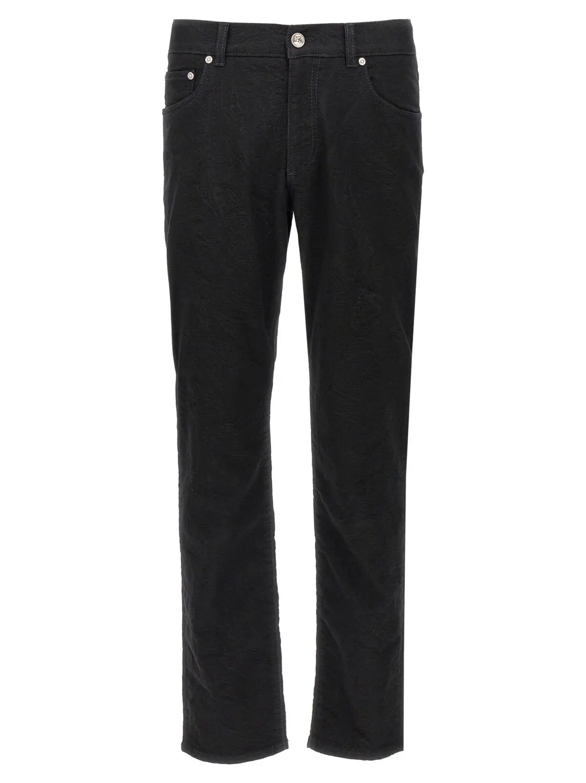 Чорні чоловічі джинси Etro виготовлені з еластичної жакардової бавовняної тканини з додаванням поліестеру, що забезпечує ідеальну посадку та комфорт. Витончений дизайн з тонким узором по всій поверхні, класична п’ятіклапанна модель і шкіряна емблема на спині підкреслюють статусність та сучасний стиль, роблячи цей виріб універсальним вибором для вишуканого гардеробу.