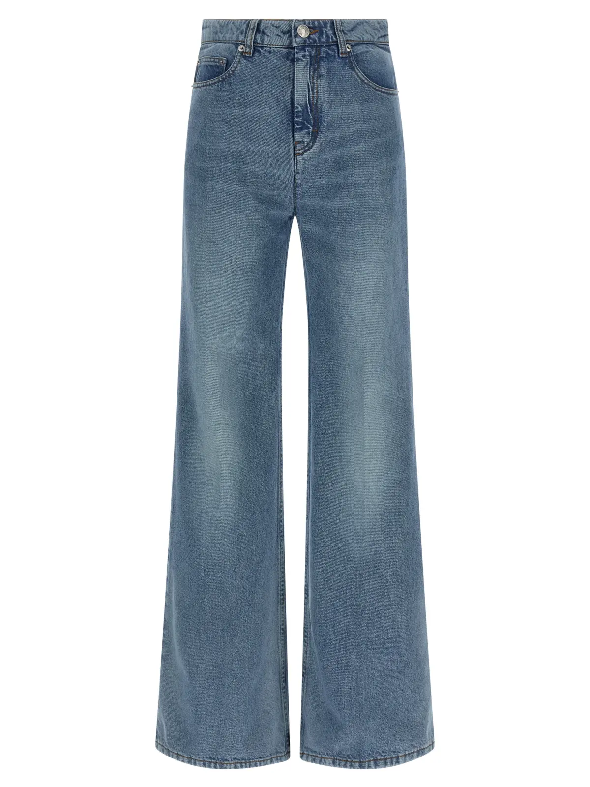 Джинси з деніму з ефектом stonewashed. Контрастна строчка. Застібка на блискавку та ґудзик. П’ять кишень. Логотип із замші на спинці. Широкі розкльошені штани. 100% бавовна.