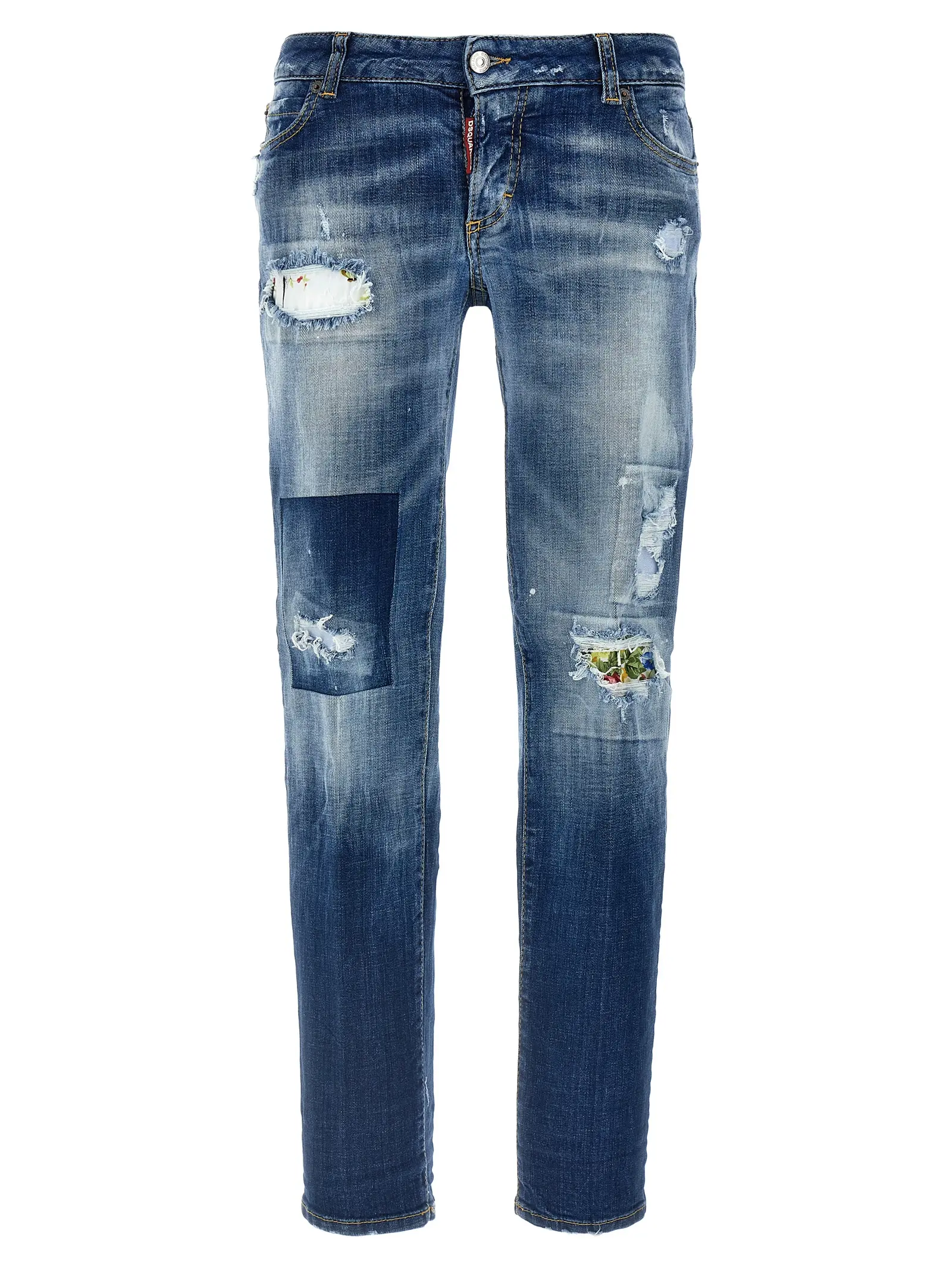 Витончені жіночі джинси з деніму з ефектом потертості та контрастними латками, виконані з високоякісної бавовни з додаванням еластану для комфортної посадки. Застібка на ґудзик і п’ять практичних кишень поєднують стиль і функціональність, підкреслюючи статус і неповторний характер власниці.