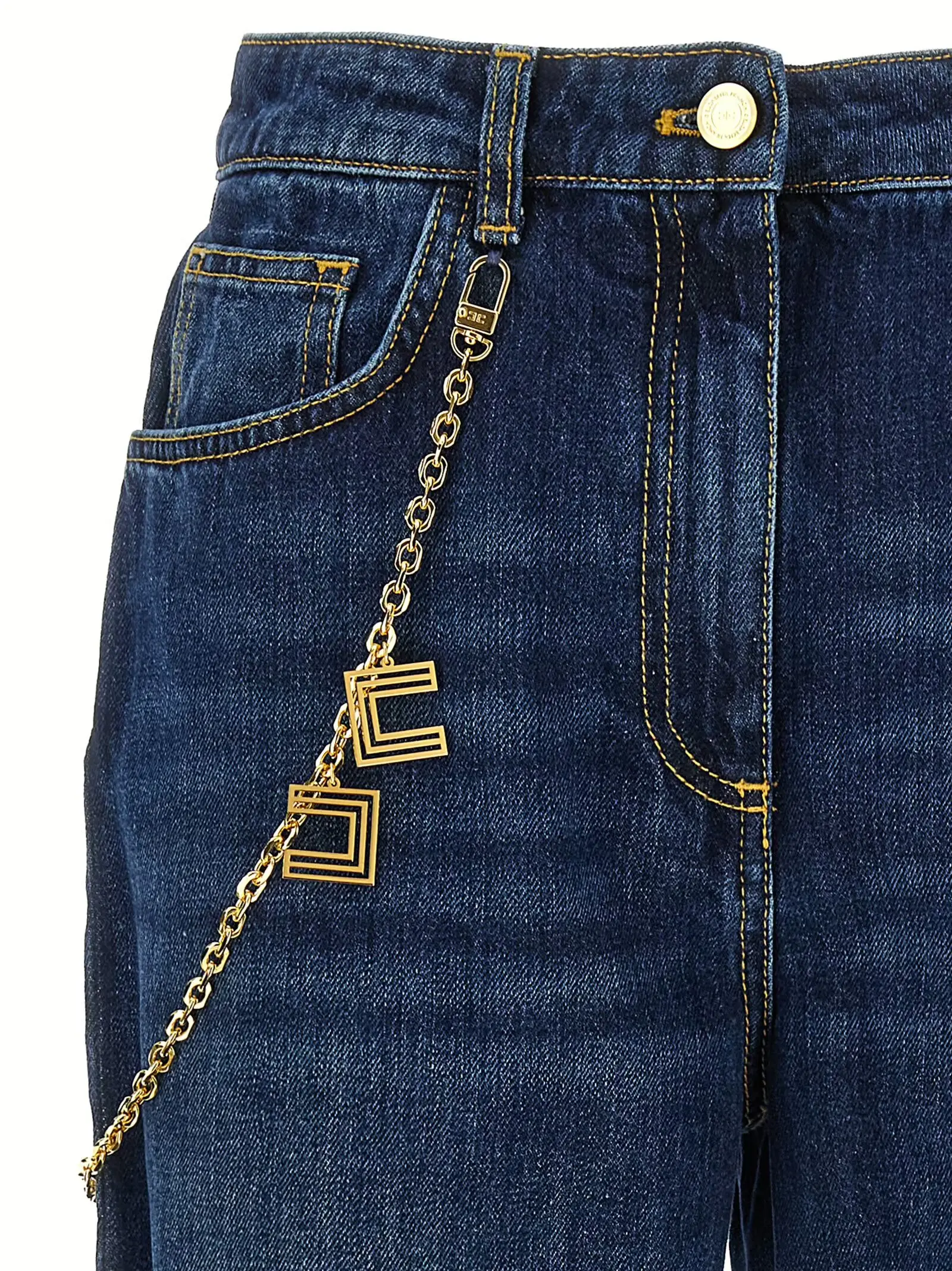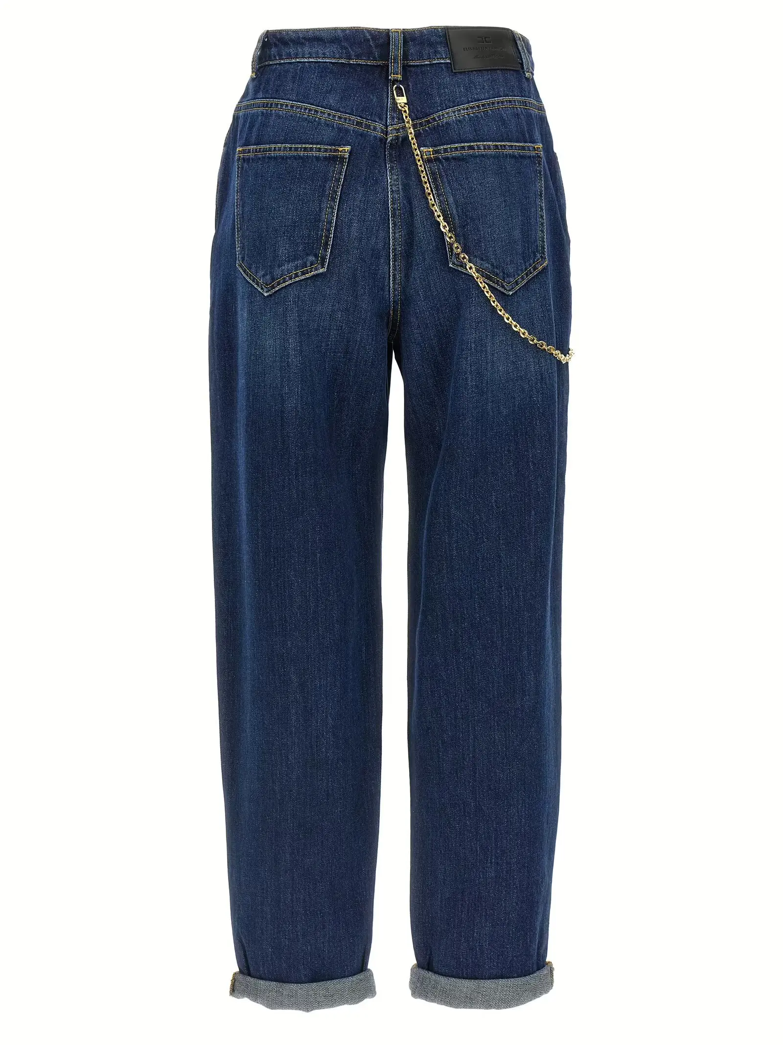 Стильні сині джинси з деніму stonewashed із 100% бавовни поєднують інноваційний крій з укороченим фасоном та відворотами, доповнені знімним прикрасою у вигляді ланцюжка, що підкреслює вишуканість і статус, забезпечуючи універсальність для будь-яких образів.