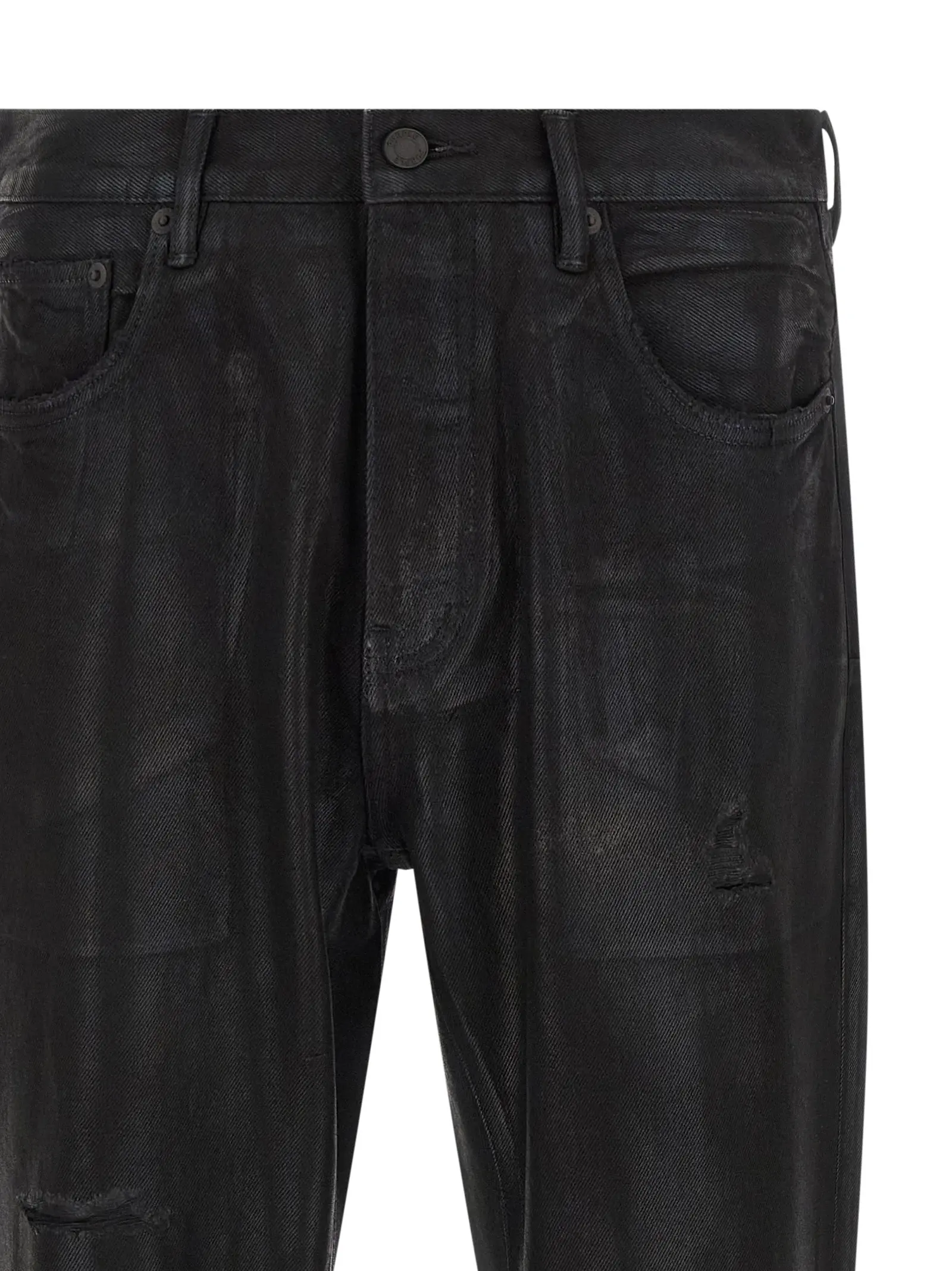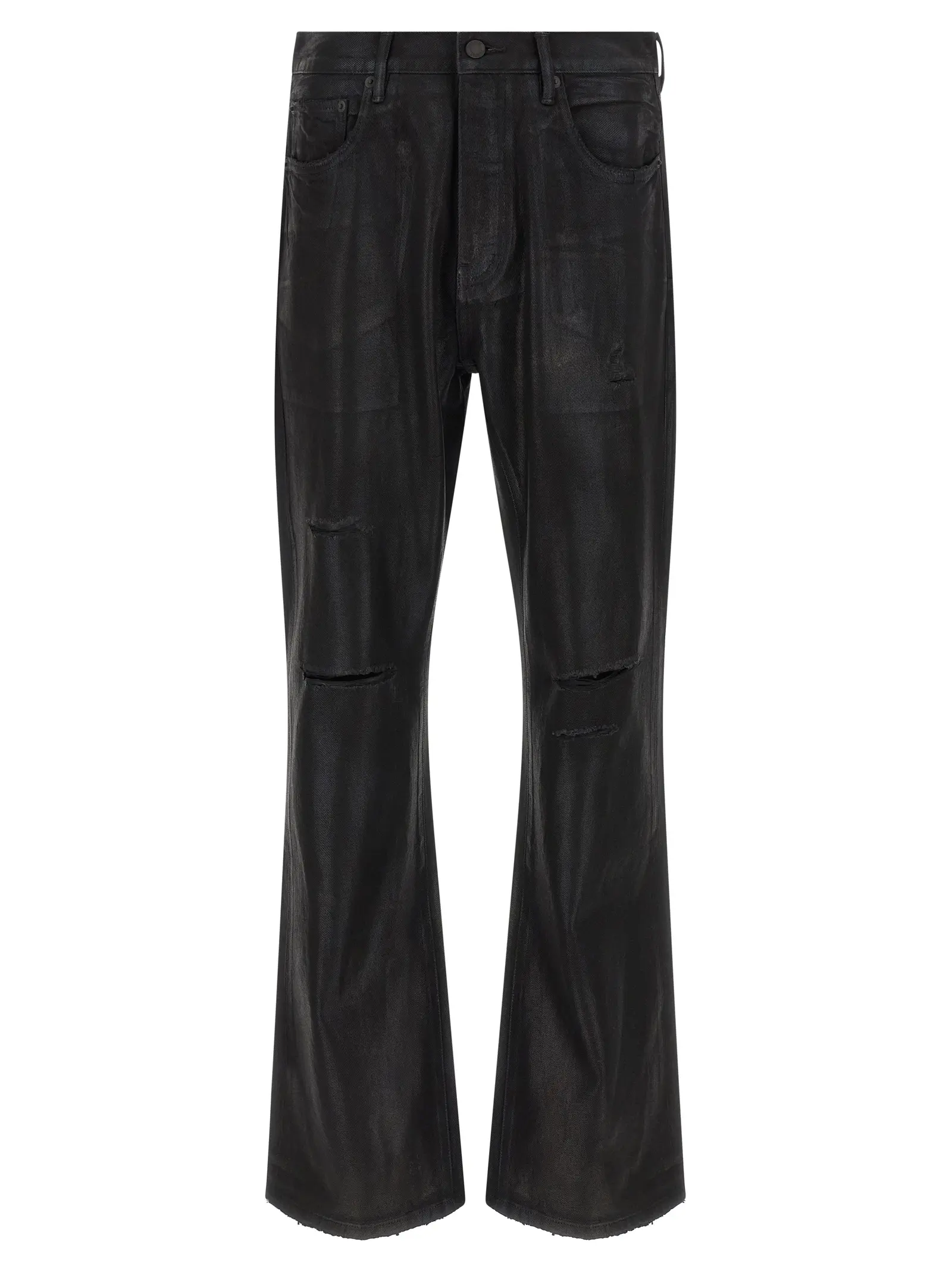 Розкльошений силует створює зухвалий настрій, що підсилюється ефектом зістареного фарбування та майстерними розривами спереду. Натуральна щільна бавовна забезпечує надійну конструкцію, а фірмовий декор на задній частині завершує образ. Кожен виріб унікальний завдяки ручній обробці, що перетворює перевірену часом п’яти кишенькову модель на справжній арт-об’єкт.