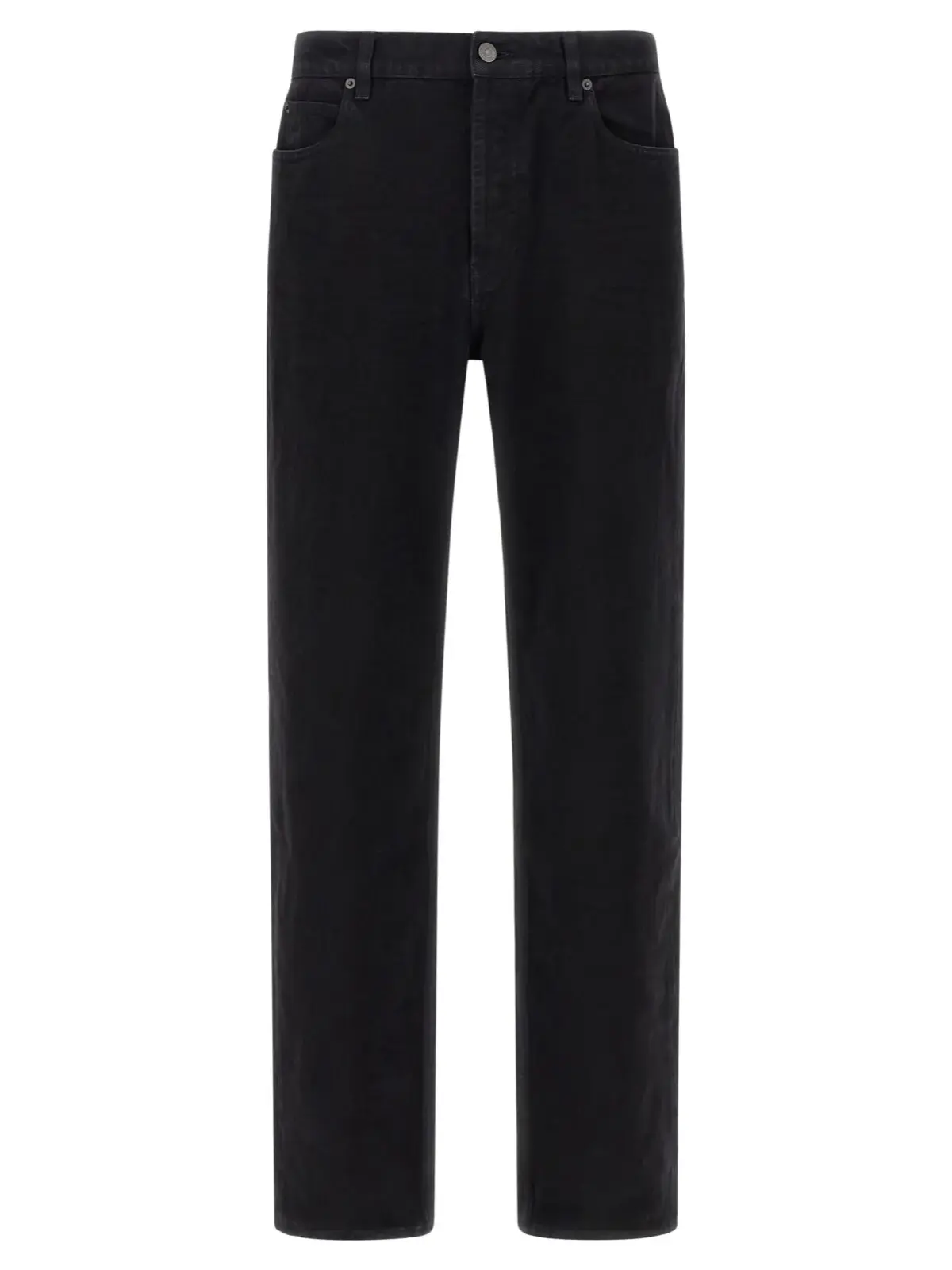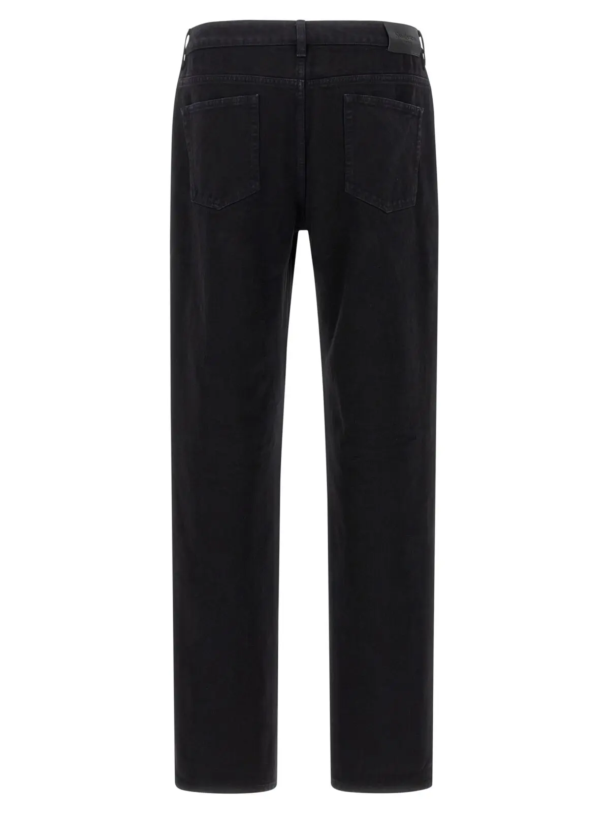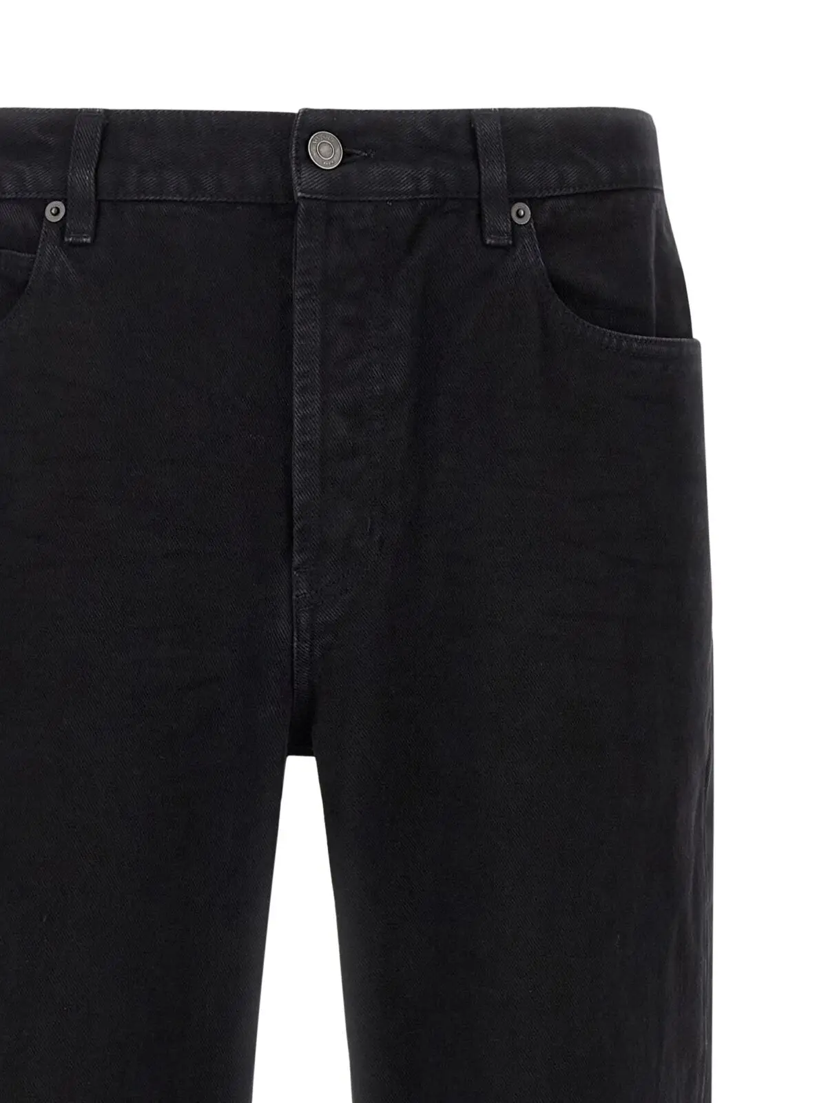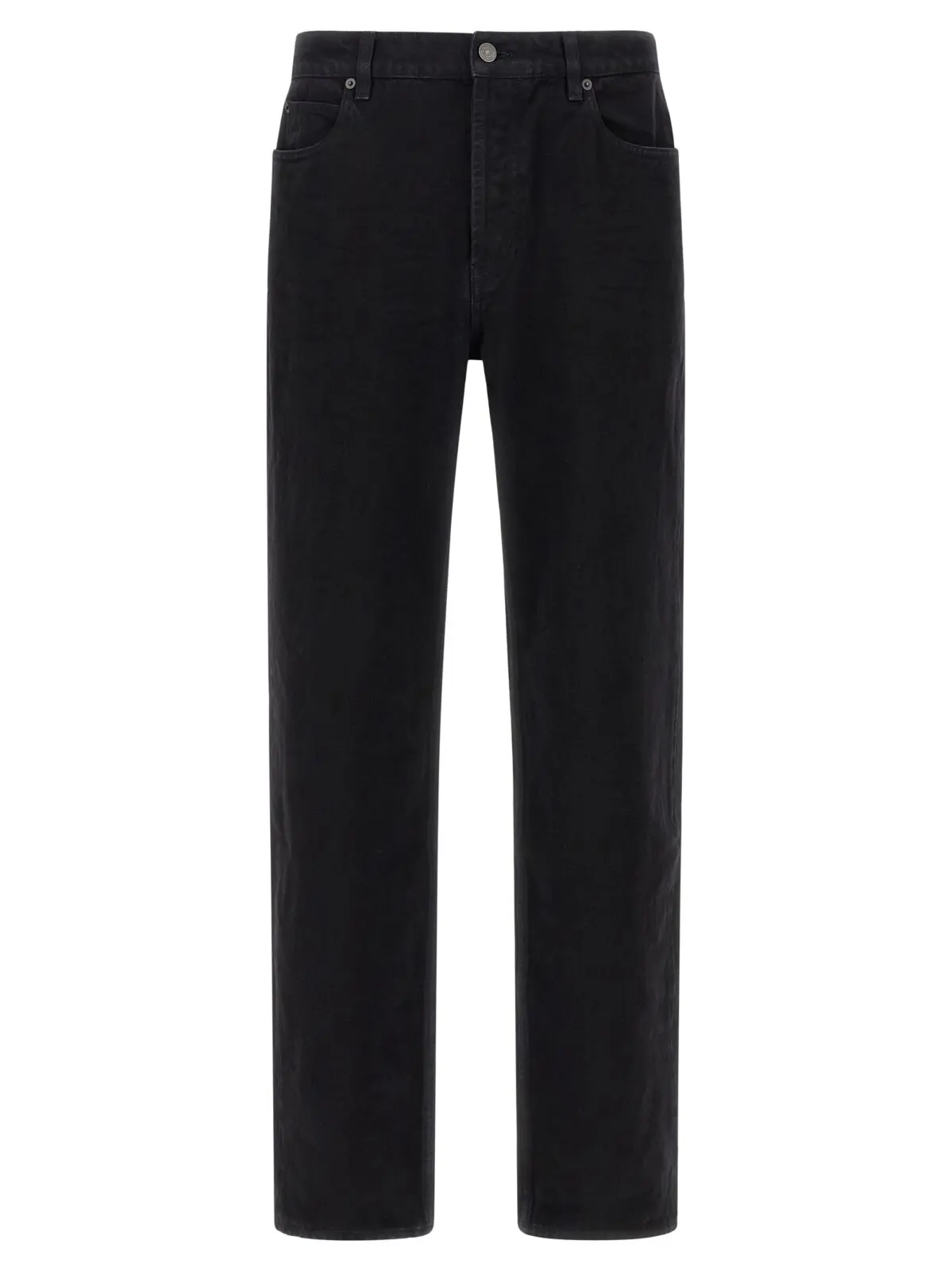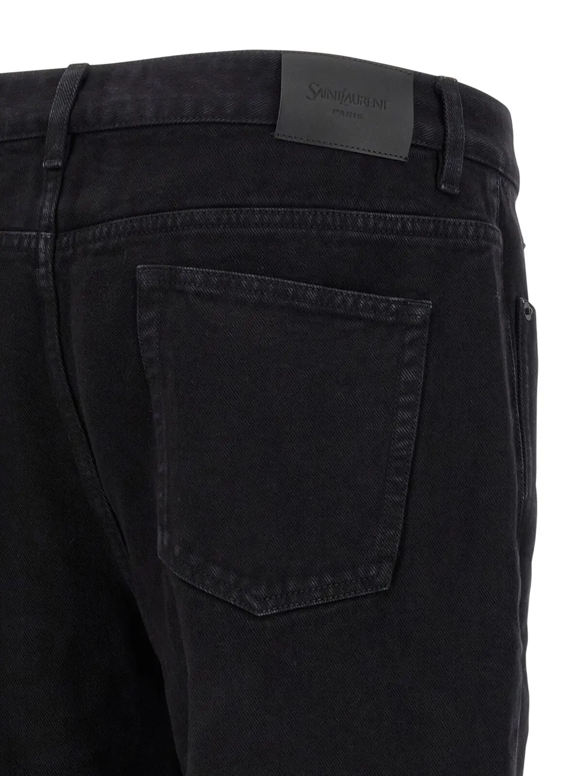 Чорні чоловічі джинси з деніму Saint Laurent виготовлені з 100% бавовни з використанням технології фарбування тканини, що забезпечує глибокий насичений відтінок та довговічність. Класичний прямий крій, п’ять функціональних кишень і елегантна застібка на ґудзики підкреслюють бездоганний стиль і статус, поєднуючи інноваційність із універсальністю для сучасного гардеробу.