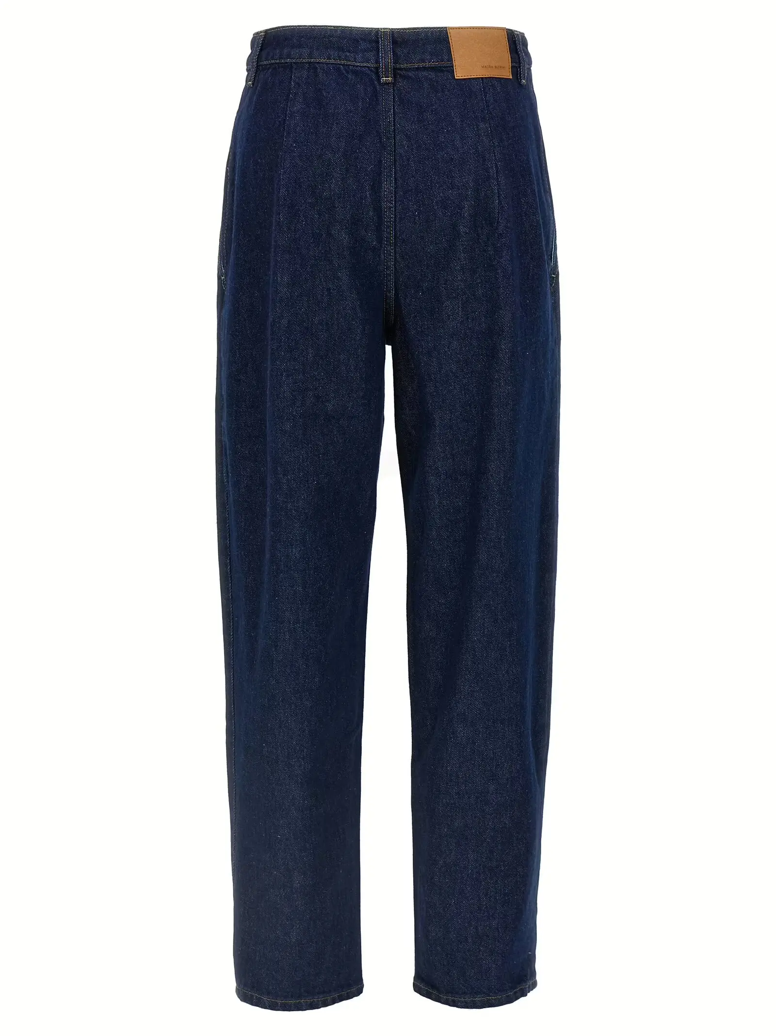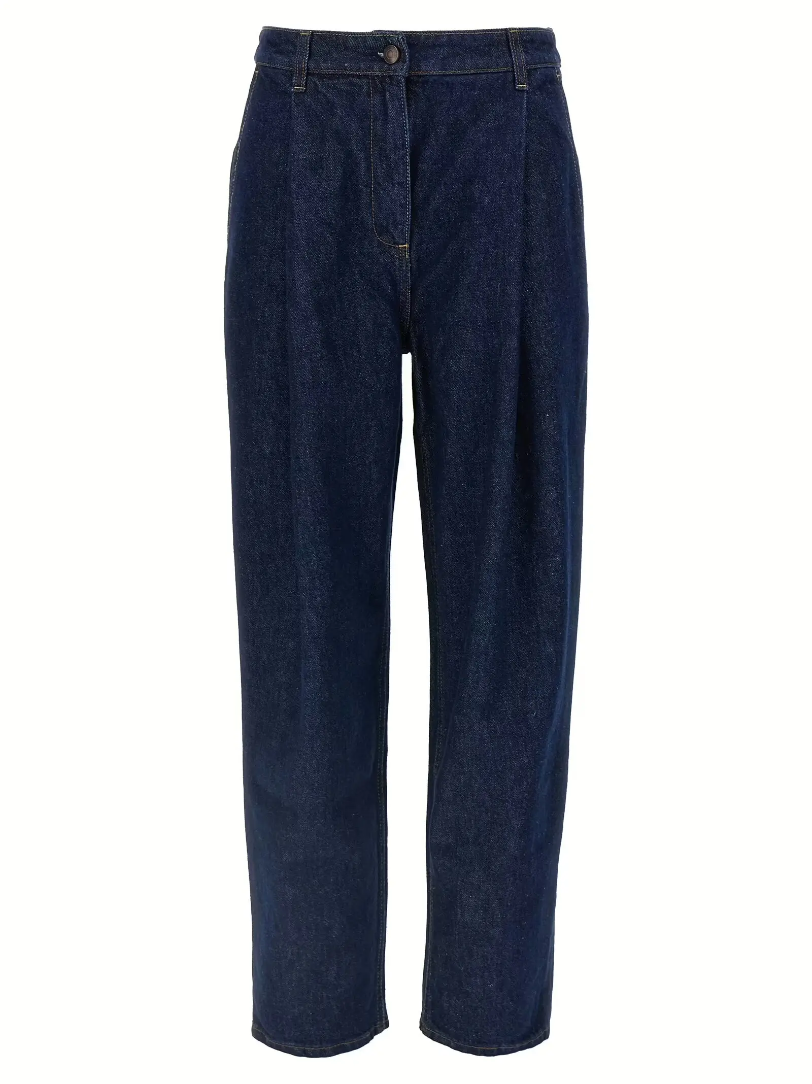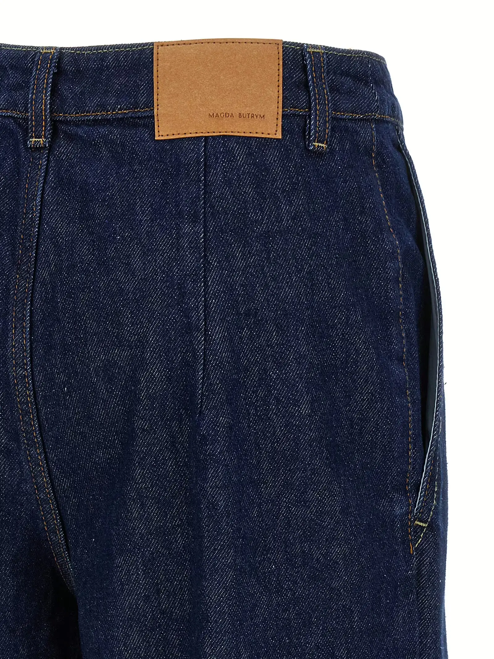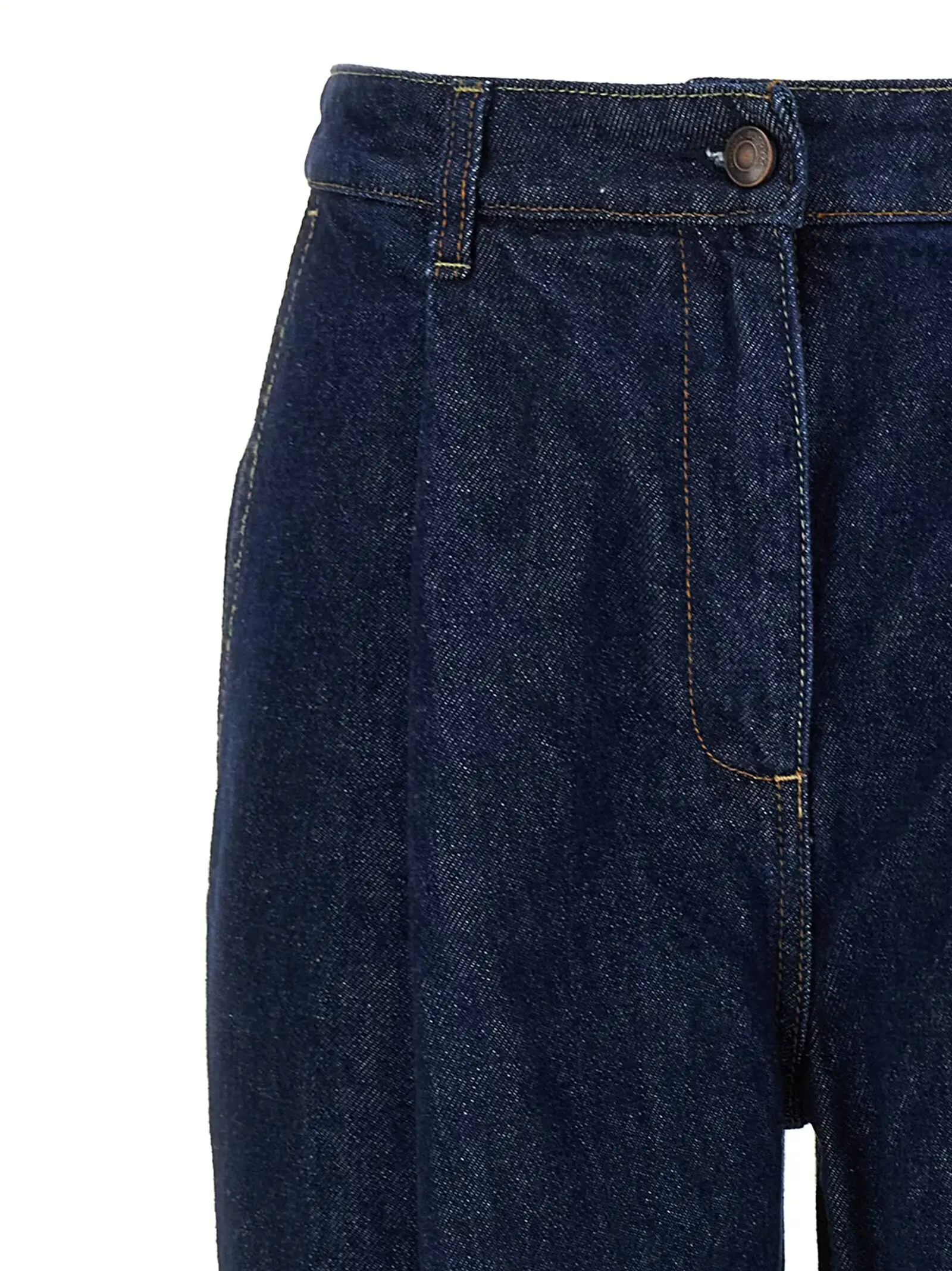 Вишукані жіночі джинси Toteness від Magda Butrym виготовлені з високоякісного 100% бавовняного деніму синього кольору, мають високу талію, застібку на блискавку та ґудзик, функціональні кишені і стильні передні складки, що підкреслюють елегантність, сучасність і бездоганний смак.