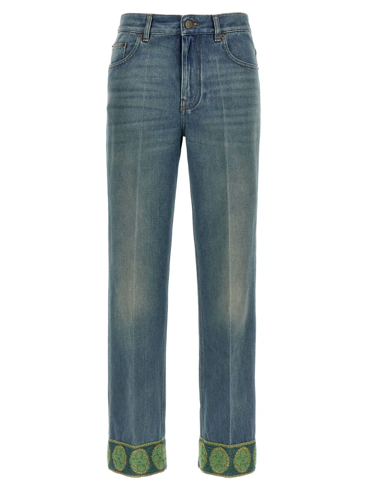 Джинси Valentino Garavani поєднують у собі елегантність та сучасність, виготовлені з високоякісного деніму, що складається на 64% з бавовни та 36% з льону. Їхній унікальний дизайн доповнений жакардовим вузлом на нижній частині штанини, що додає витонченості. Завдяки прямому крою та еластичному складу, ці джинси забезпечують комфорт і стиль у будь-якій ситуації. Класичні п’ять кишень та фірмовий шкіряний логотип на задній частині підкреслюють статус та бездоганний смак власниці. Цей виріб стане невід’ємною частиною гардеробу, ідеально поєднуючись з різними образами.