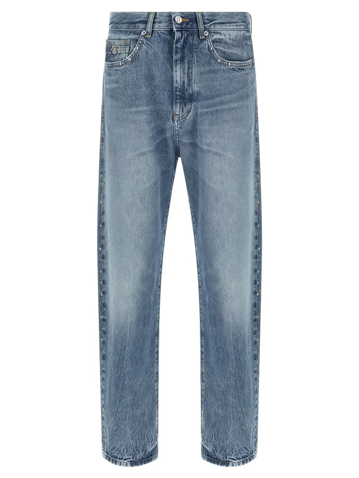 Сміливий прямий силует із щільного деніму транслює справжню естетику розкоші через акцентні металеві заклепки та впізнавану фурнітуру Medusa. Фактурна натуральна шкіра на задній емблемі додає виробу престижного вигляду. П’ять класичних кишень у поєднанні зі стовідсотковою бавовною забезпечують виняткову витривалість, роблячи кожну лінію крою символом статусного та виразного повсякденного стилю.