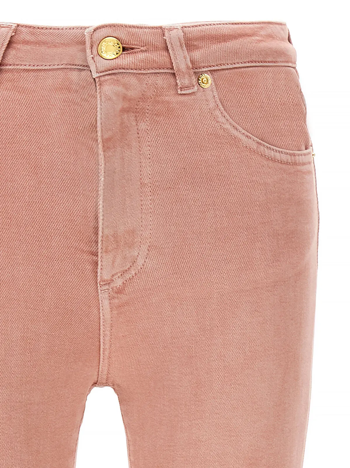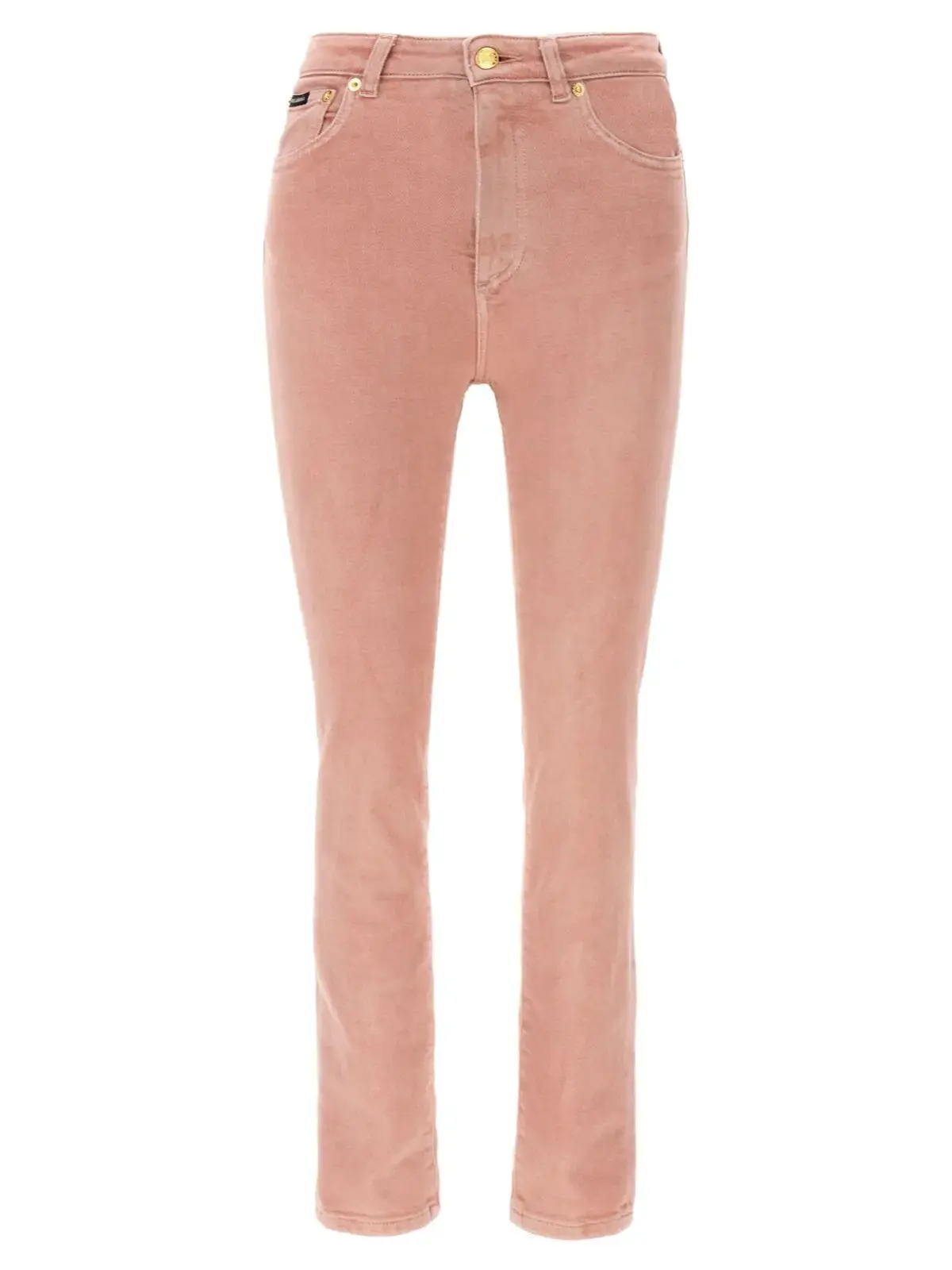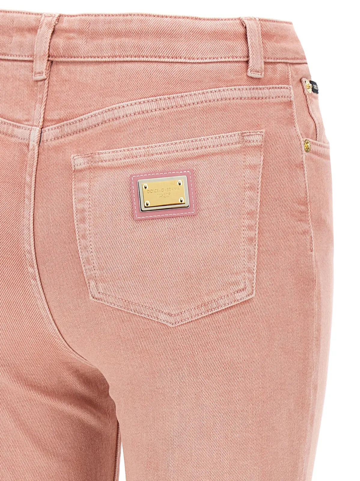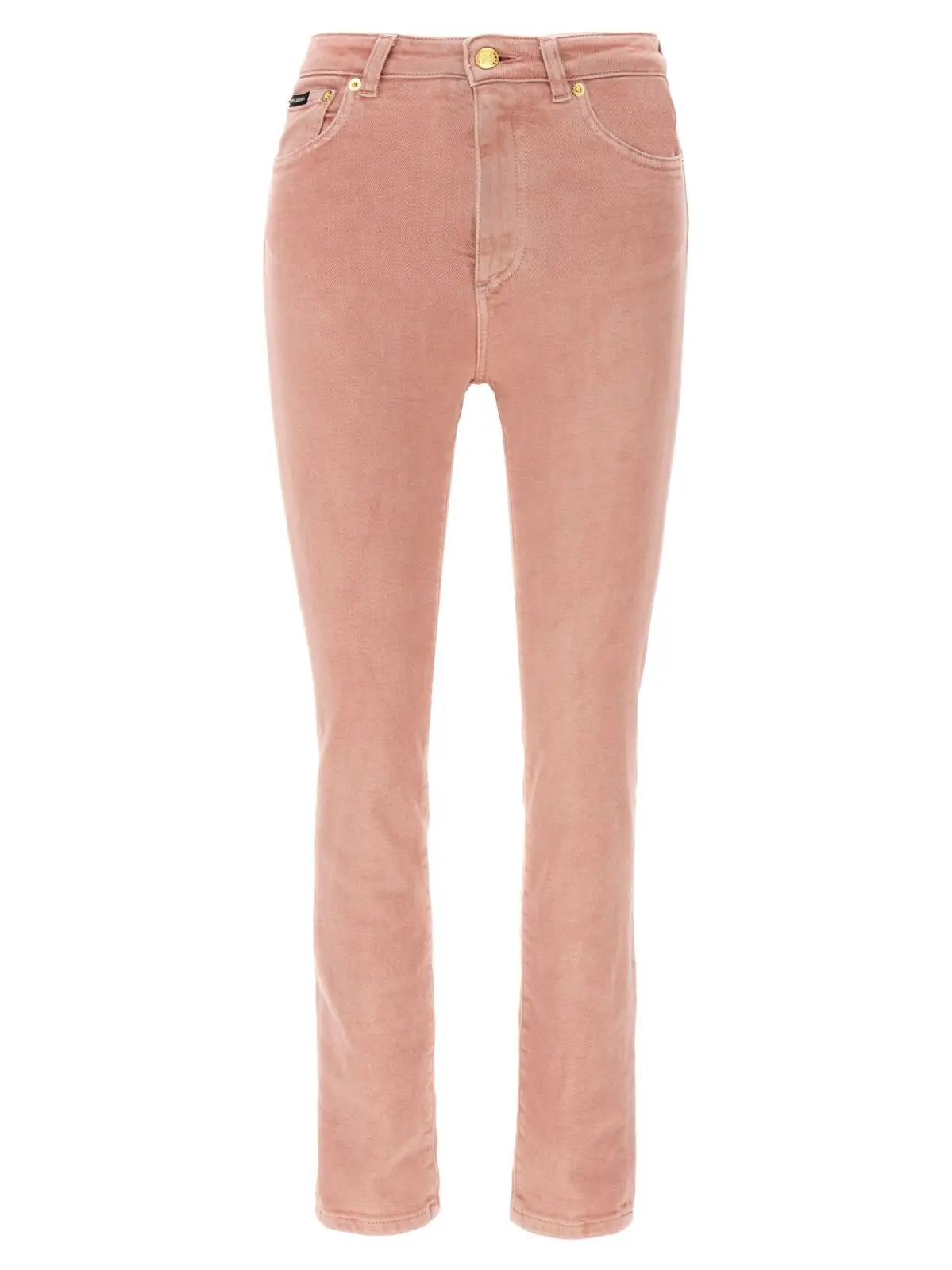Рожеві джинси з високою талією виготовлені з еластичного бавовняного деніму преміум-класу, обробленого вручну для створення унікального ефекту потертості. Вишуканий дизайн доповнений шкіряною та металевою емблемою, що підкреслює статус і неповторний стиль, поєднуючи комфорт і універсальність у кожному образі.