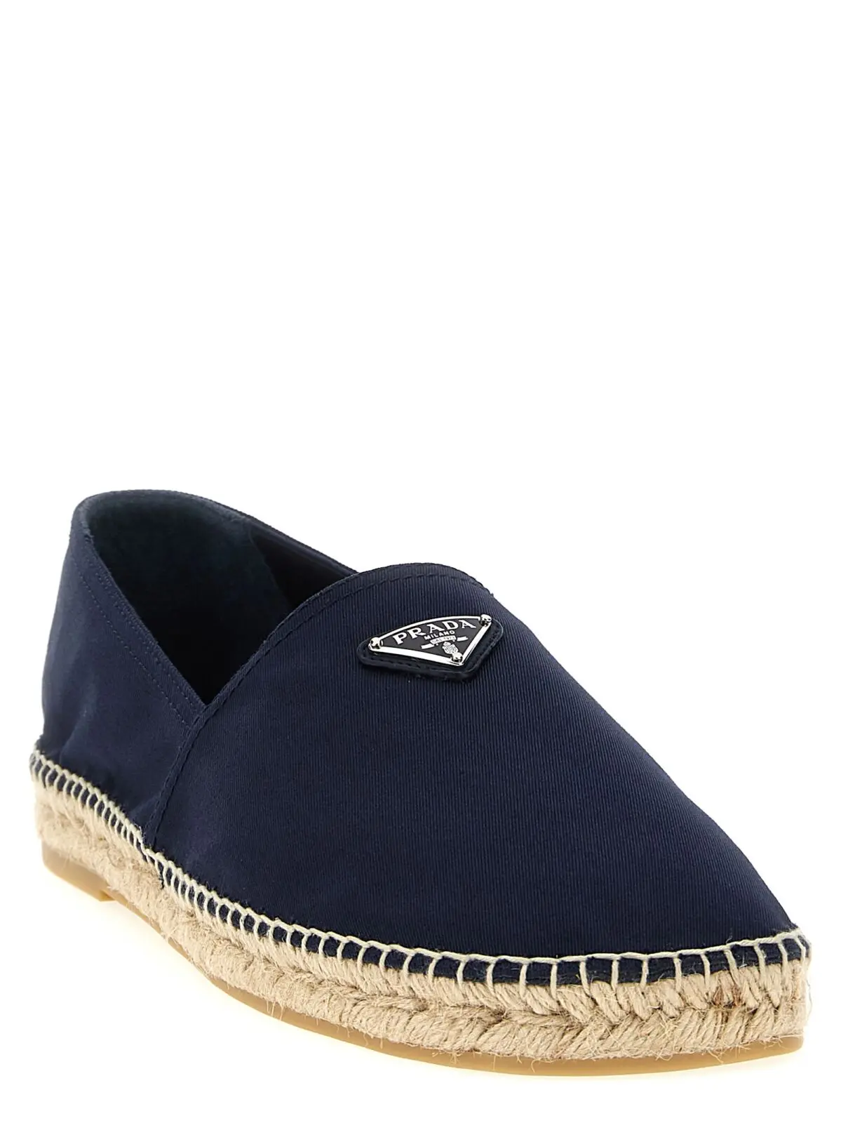 Еспадрильї чоловічі з колекції Prada виконані з натуральної бавовни, поєднують інноваційний дизайн із класичною елегантністю, прикрашені трикутним логотипом з емальованого металу. Плетена підошва з джуту та гумове дно забезпечують комфорт і довговічність, підкреслюючи вишуканий стиль і статус власника.