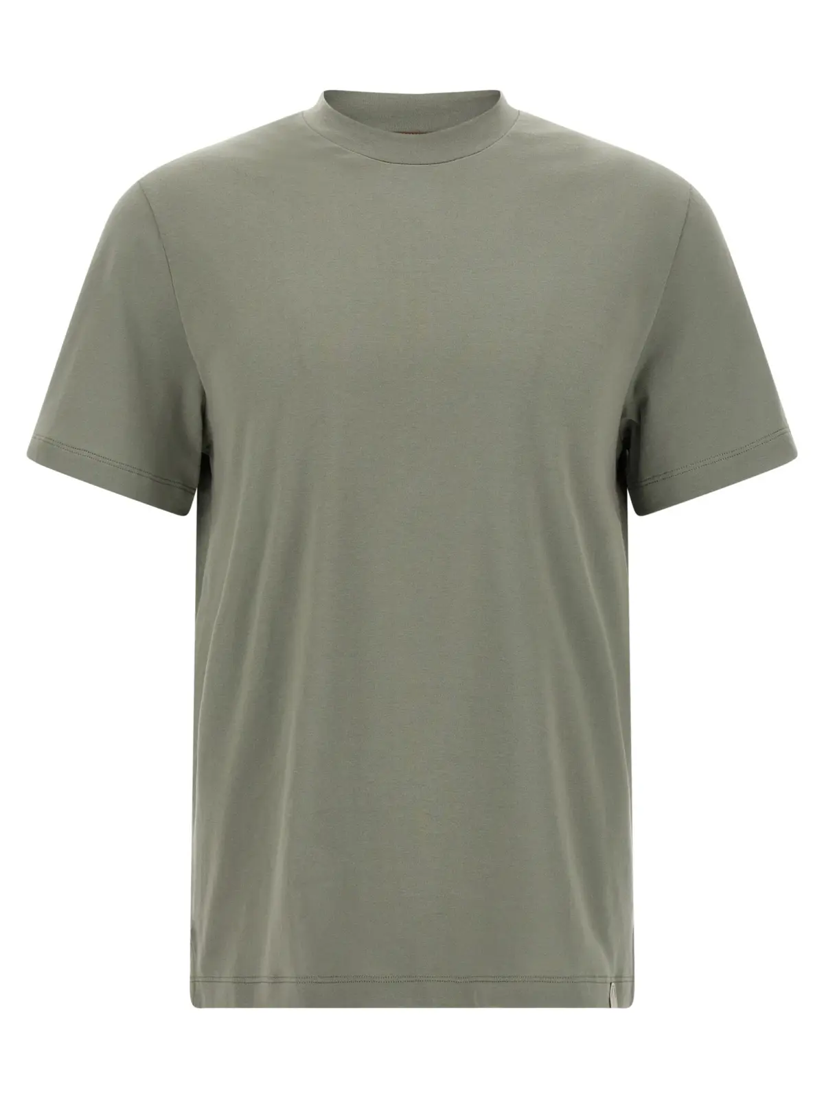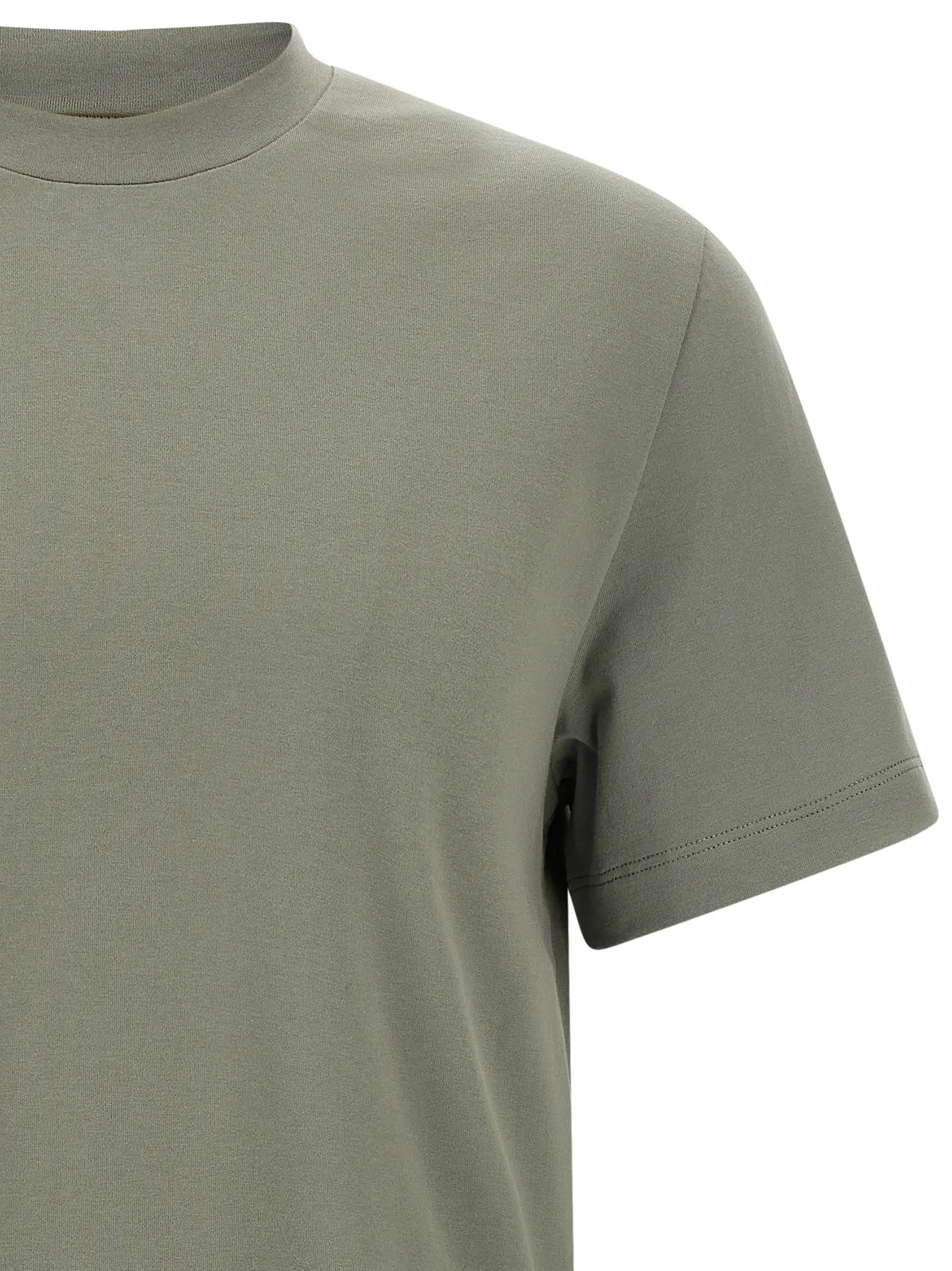 Матова фактура карбонізованої бавовни створює особливу щільність, зберігаючи природну м’якість органічних волокон із сертифікатом відповідності. Стриманий дизайн розкривається через лаконічну шкіряну вставку з ледь помітним рельєфним відтиском. Виріб доповнено бічними розрізами для вільного руху, тоді як круглий виріз і класичні короткі рукави формують спокійну основу повсякденного образу. Свідомий підхід до вибору сировини робить цю річ тривалим внеском у гардероб.