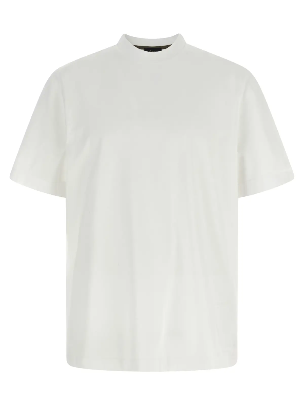 Ця чоловіча біла футболка з круглим вирізом виготовлена з 100% високоякісної бавовни, поєднуючи комфорт і стиль. Вишукана деталь у вигляді тонованої шкіряної нашивки з логотипом та розрізи по боках підкреслюють інноваційний дизайн і універсальність, створюючи неперевершений статусний образ.